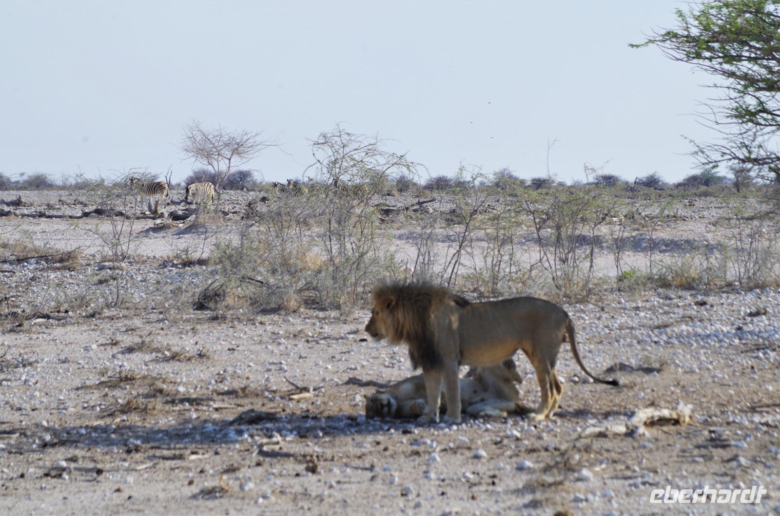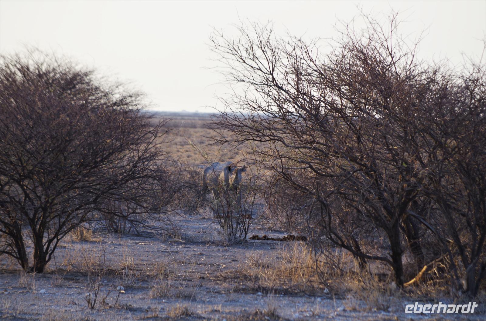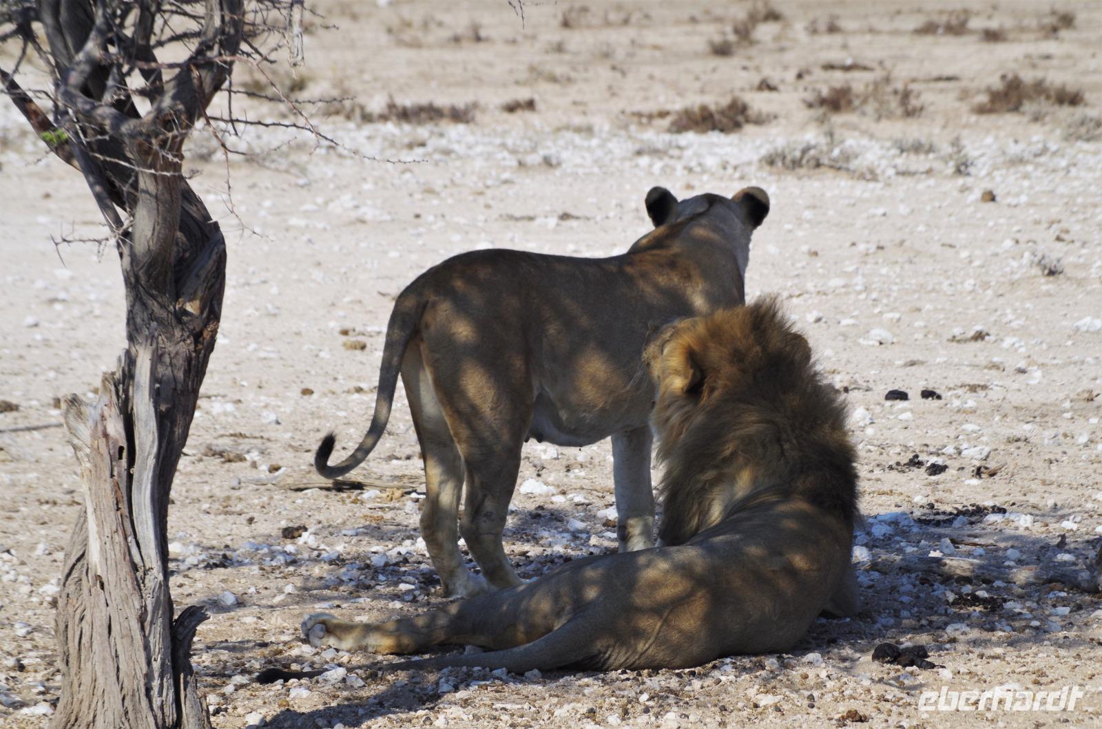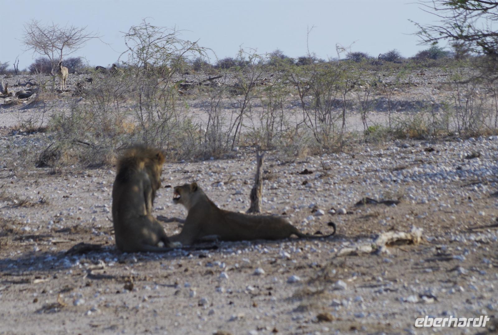 Am Morgen unternahmen wir eine weitere Pirschfahrt im Truck. Gleich zu Beginn sahen wir, versteckt im Gebüsch, eine Elefantenherde eine einsame Tüpfelhyäne. Von Okaukuejo pirschten wir am westlichen Rand der Etosha Pfanne zum natürlichen Wasserloch Okondeka, denn dort ist Löwengebiet. Am Vortag sollen dort Löwen gesichtet wurden sein. Mit dem Fernglas suchten wir die Gegend ab. Doch mehr als vertrocknete Tierkadaver und - skelette. Diese waren sicher von Löwenrissen übrig geblieben. Raubkatzen sahen wir keine, nur einen Schakal, der sich an den Überresten einer Antilope labte. Später sahen wir wieder Schiraffen, Gnus, eine Riesentrappe und Elefanten im Gebüsch. Am Mittag verließen wir den Park und fuhren zur Etosha Safari Lodge, unweit des Anderson-Gates. Nach kurzer Wartezeit waren unsere kleinen und schönen Reihenhäuschen bezugsfertig. Am Nachmittag hieß es noch einmal: Heia Safari! Im offenen Geländewagen ging es mit dem freundlichen Ranger Rodney, einem Mix aus Damara und Herero wie er selbst sagte, ein letztes Mal in den Etosha Nationalpark. Die Pirschfahrt mit ihm war lustig, auch sprach ein super Deutsch. Gleich auf der Asphaltstraße mußten wir stoppen - Zebrastreifen, im wahrsten Sinne des Wortes. Wir fuhren zum Wasserloch Nebrowni, wo er seine Freunde, die Löwen hinbestellt hatte. WOW, das Löwenpaar war seiner Einladung gefolgt. Faul lagen sie im Schatten eines dürren Baumes. Doch dann kam Bewegung in die Szenerie. Der Löwenmann liebkoste seine Herzdame, die etwas uninteressiert vor sich hindöste. Mit seinen Fahrkünsten und einem spitzbübischen Lächeln sicherte er uns Plätze in der ersten Reihe und der kurzweilige Film Lions in Love begann. Das Löwenpaar war so mit sich selbst beschäftigt, dass Gnus, Schiraffen, Springböcke, Strauße in unmittelbarer Nähe das Wasserloch in Beschlag nahmen. Wir pirschten weiter und verfolgten ein Straußen - Rennen und eine Erdmännchen-Parade. Unterm Busch versteckten sich 2 Steinböckchen und im Baum ein Weißburzelsinghabicht. Natürlich kreuzten wieder Schiraffen unseren Weg. Gerhard, der als Beifahrer mitfahren konnte, spähte nun die Umgebung aus. Da mußte doch was im Busch sein?! Wir waren bereits auf dem Rückweg und.... Im Busch ein Spitzmaulnashorn! Nun fuhren wir entspannt im Sonnenuntergang zur Lodge zurück. Die Lodge wurde im vergangenen Jahr renoviert und hat ein neues Management. Wir labten uns vom riesigen Buffet inklusive Grillstation. Baie Lekker! Tagesetappe: 149 km