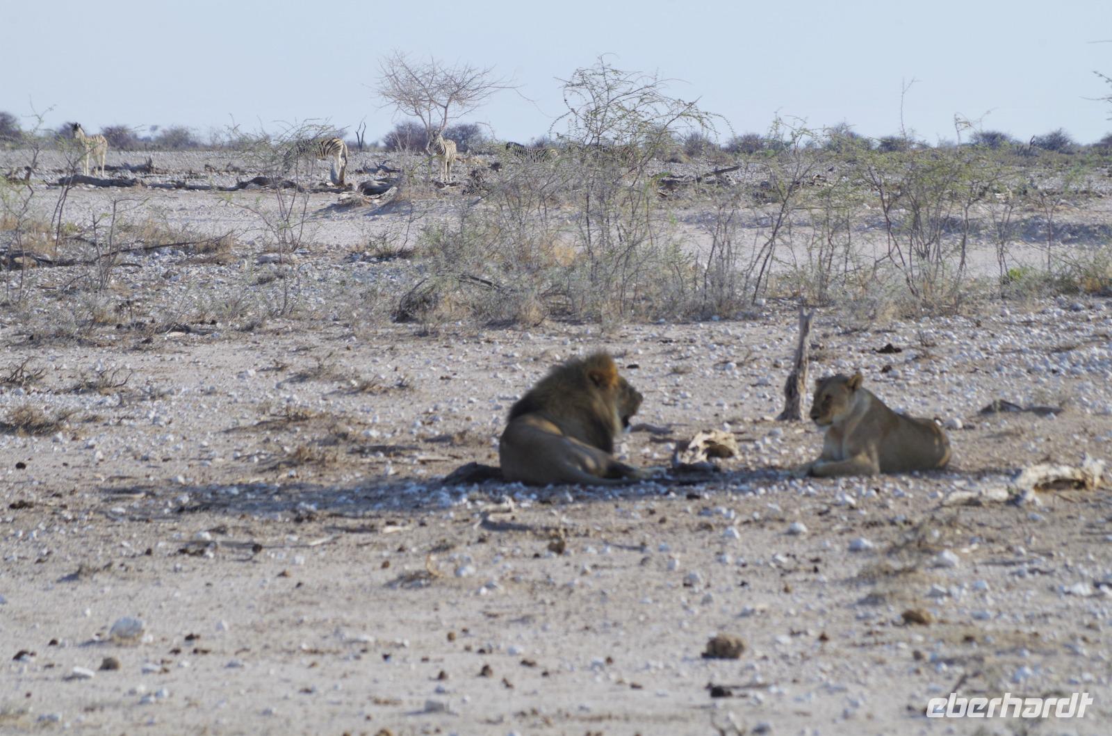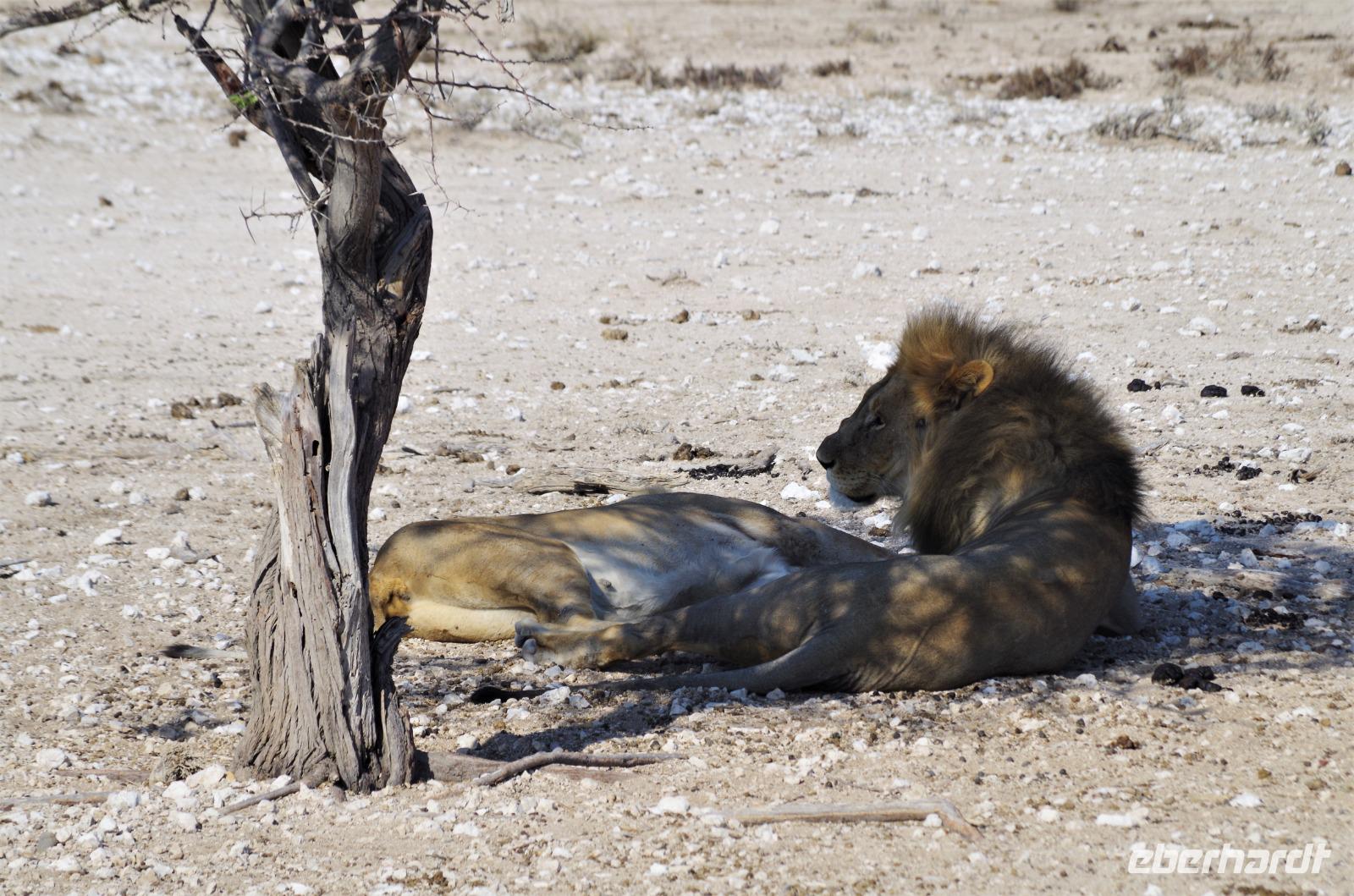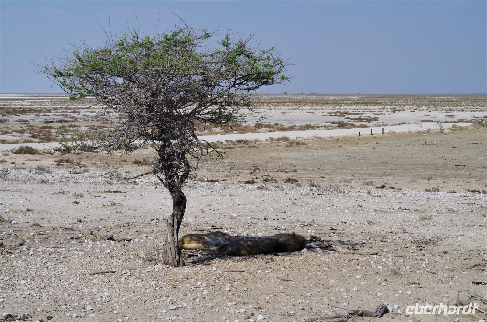 Am Morgen unternahmen wir eine weitere Pirschfahrt im Truck. Gleich zu Beginn sahen wir, versteckt im Gebüsch, eine Elefantenherde eine einsame Tüpfelhyäne. Von Okaukuejo pirschten wir am westlichen Rand der Etosha Pfanne zum natürlichen Wasserloch Okondeka, denn dort ist Löwengebiet. Am Vortag sollen dort Löwen gesichtet wurden sein. Mit dem Fernglas suchten wir die Gegend ab. Doch mehr als vertrocknete Tierkadaver und - skelette. Diese waren sicher von Löwenrissen übrig geblieben. Raubkatzen sahen wir keine, nur einen Schakal, der sich an den Überresten einer Antilope labte. Später sahen wir wieder Schiraffen, Gnus, eine Riesentrappe und Elefanten im Gebüsch. Am Mittag verließen wir den Park und fuhren zur Etosha Safari Lodge, unweit des Anderson-Gates. Nach kurzer Wartezeit waren unsere kleinen und schönen Reihenhäuschen bezugsfertig. Am Nachmittag hieß es noch einmal: Heia Safari! Im offenen Geländewagen ging es mit dem freundlichen Ranger Rodney, einem Mix aus Damara und Herero wie er selbst sagte, ein letztes Mal in den Etosha Nationalpark. Die Pirschfahrt mit ihm war lustig, auch sprach ein super Deutsch. Gleich auf der Asphaltstraße mußten wir stoppen - Zebrastreifen, im wahrsten Sinne des Wortes. Wir fuhren zum Wasserloch Nebrowni, wo er seine Freunde, die Löwen hinbestellt hatte. WOW, das Löwenpaar war seiner Einladung gefolgt. Faul lagen sie im Schatten eines dürren Baumes. Doch dann kam Bewegung in die Szenerie. Der Löwenmann liebkoste seine Herzdame, die etwas uninteressiert vor sich hindöste. Mit seinen Fahrkünsten und einem spitzbübischen Lächeln sicherte er uns Plätze in der ersten Reihe und der kurzweilige Film Lions in Love begann. Das Löwenpaar war so mit sich selbst beschäftigt, dass Gnus, Schiraffen, Springböcke, Strauße in unmittelbarer Nähe das Wasserloch in Beschlag nahmen. Wir pirschten weiter und verfolgten ein Straußen - Rennen und eine Erdmännchen-Parade. Unterm Busch versteckten sich 2 Steinböckchen und im Baum ein Weißburzelsinghabicht. Natürlich kreuzten wieder Schiraffen unseren Weg. Gerhard, der als Beifahrer mitfahren konnte, spähte nun die Umgebung aus. Da mußte doch was im Busch sein?! Wir waren bereits auf dem Rückweg und.... Im Busch ein Spitzmaulnashorn! Nun fuhren wir entspannt im Sonnenuntergang zur Lodge zurück. Die Lodge wurde im vergangenen Jahr renoviert und hat ein neues Management. Wir labten uns vom riesigen Buffet inklusive Grillstation. Baie Lekker! Tagesetappe: 149 km