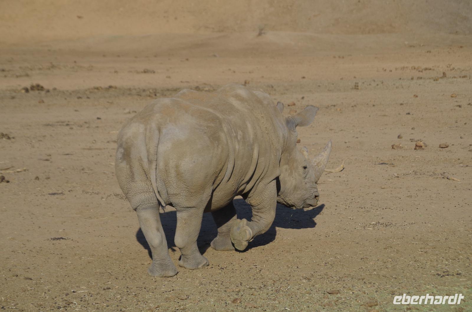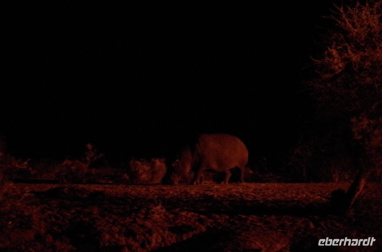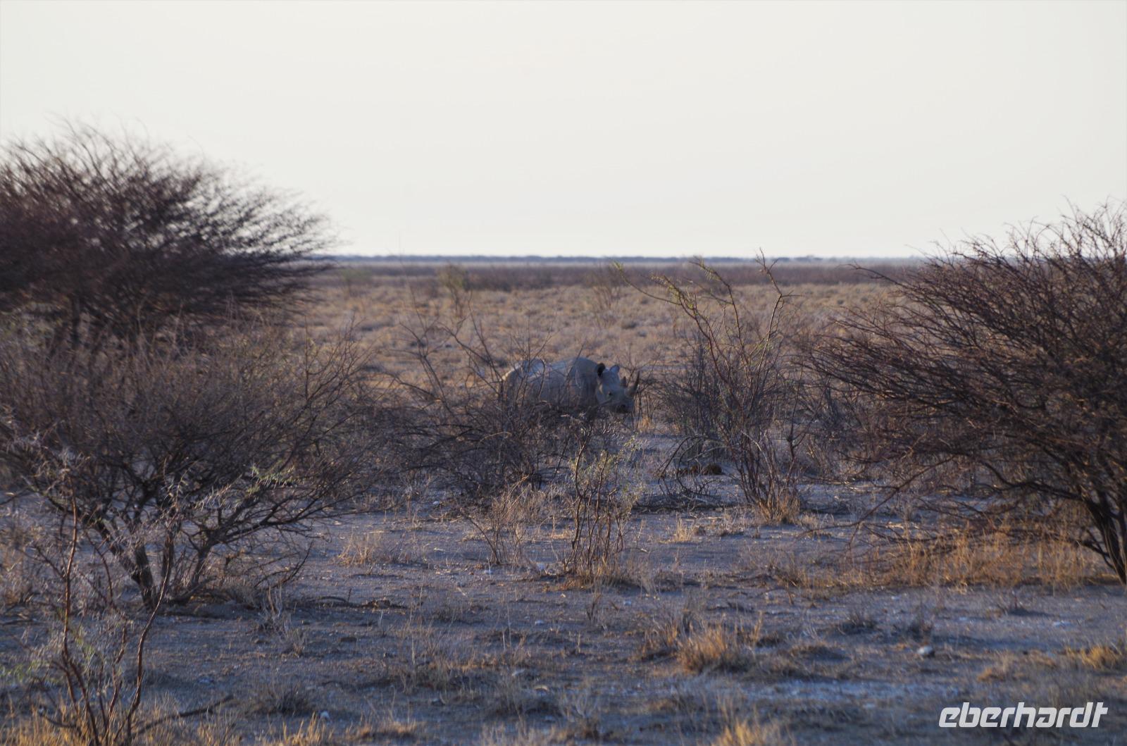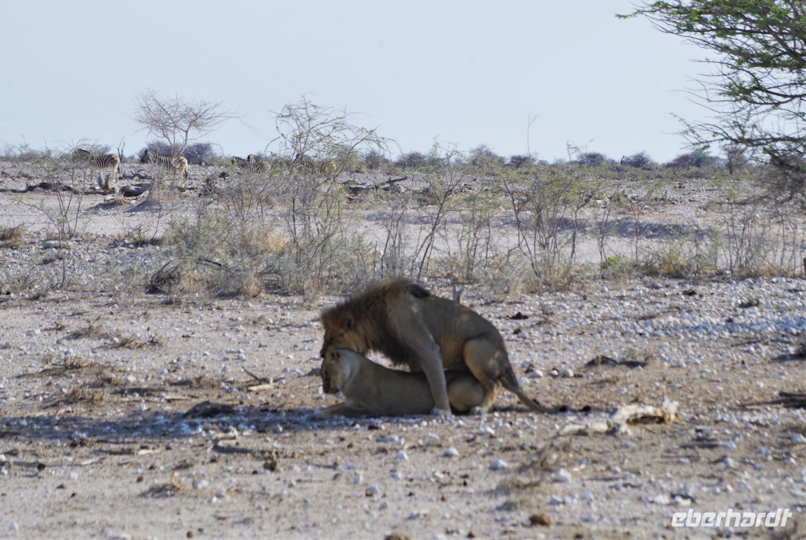 Am Morgen unternahmen wir eine weitere Pirschfahrt im Truck. Gleich zu Beginn sahen wir, versteckt im Gebüsch, eine Elefantenherde eine einsame Tüpfelhyäne. Von Okaukuejo pirschten wir am westlichen Rand der Etosha Pfanne zum natürlichen Wasserloch Okondeka, denn dort ist Löwengebiet. Am Vortag sollen dort Löwen gesichtet wurden sein. Mit dem Fernglas suchten wir die Gegend ab. Doch mehr als vertrocknete Tierkadaver und - skelette. Diese waren sicher von Löwenrissen übrig geblieben. Raubkatzen sahen wir keine, nur einen Schakal, der sich an den Überresten einer Antilope labte. Später sahen wir wieder Schiraffen, Gnus, eine Riesentrappe und Elefanten im Gebüsch. Am Mittag verließen wir den Park und fuhren zur Etosha Safari Lodge, unweit des Anderson-Gates. Nach kurzer Wartezeit waren unsere kleinen und schönen Reihenhäuschen bezugsfertig. Am Nachmittag hieß es noch einmal: Heia Safari! Im offenen Geländewagen ging es mit dem freundlichen Ranger Rodney, einem Mix aus Damara und Herero wie er selbst sagte, ein letztes Mal in den Etosha Nationalpark. Die Pirschfahrt mit ihm war lustig, auch sprach ein super Deutsch. Gleich auf der Asphaltstraße mußten wir stoppen - Zebrastreifen, im wahrsten Sinne des Wortes. Wir fuhren zum Wasserloch Nebrowni, wo er seine Freunde, die Löwen hinbestellt hatte. WOW, das Löwenpaar war seiner Einladung gefolgt. Faul lagen sie im Schatten eines dürren Baumes. Doch dann kam Bewegung in die Szenerie. Der Löwenmann liebkoste seine Herzdame, die etwas uninteressiert vor sich hindöste. Mit seinen Fahrkünsten und einem spitzbübischen Lächeln sicherte er uns Plätze in der ersten Reihe und der kurzweilige Film Lions in Love begann. Das Löwenpaar war so mit sich selbst beschäftigt, dass Gnus, Schiraffen, Springböcke, Strauße in unmittelbarer Nähe das Wasserloch in Beschlag nahmen. Wir pirschten weiter und verfolgten ein Straußen - Rennen und eine Erdmännchen-Parade. Unterm Busch versteckten sich 2 Steinböckchen und im Baum ein Weißburzelsinghabicht. Natürlich kreuzten wieder Schiraffen unseren Weg. Gerhard, der als Beifahrer mitfahren konnte, spähte nun die Umgebung aus. Da mußte doch was im Busch sein?! Wir waren bereits auf dem Rückweg und.... Im Busch ein Spitzmaulnashorn! Nun fuhren wir entspannt im Sonnenuntergang zur Lodge zurück. Die Lodge wurde im vergangenen Jahr renoviert und hat ein neues Management. Wir labten uns vom riesigen Buffet inklusive Grillstation. Baie Lekker! Tagesetappe: 149 km