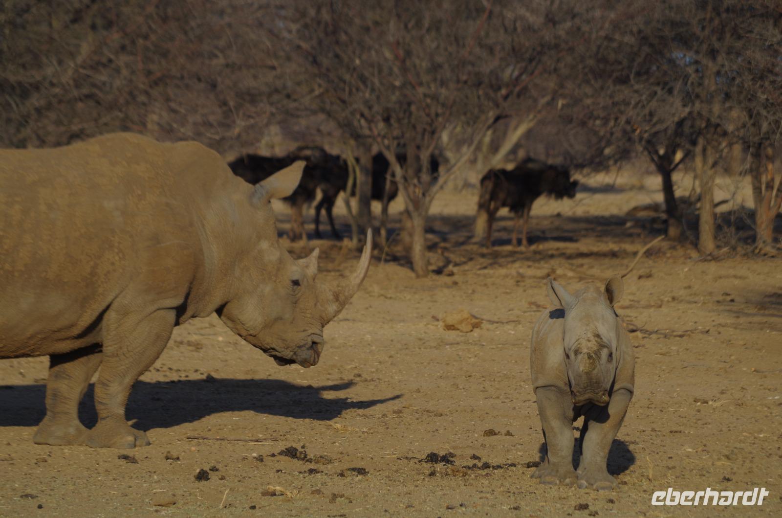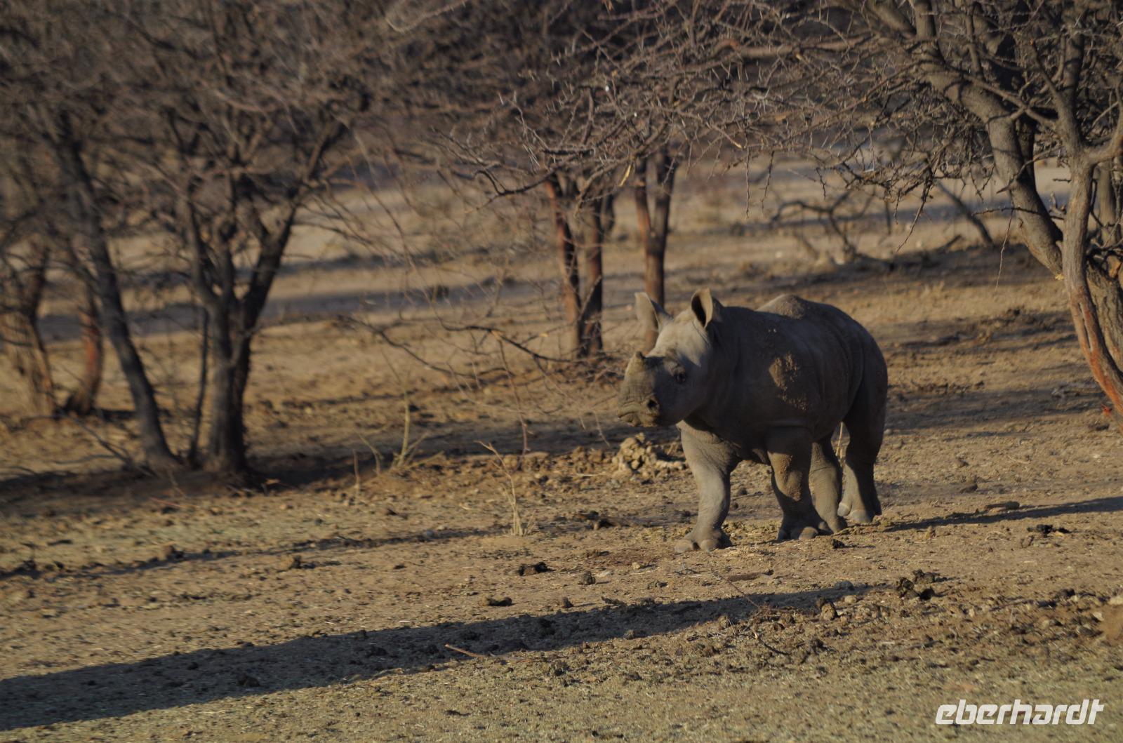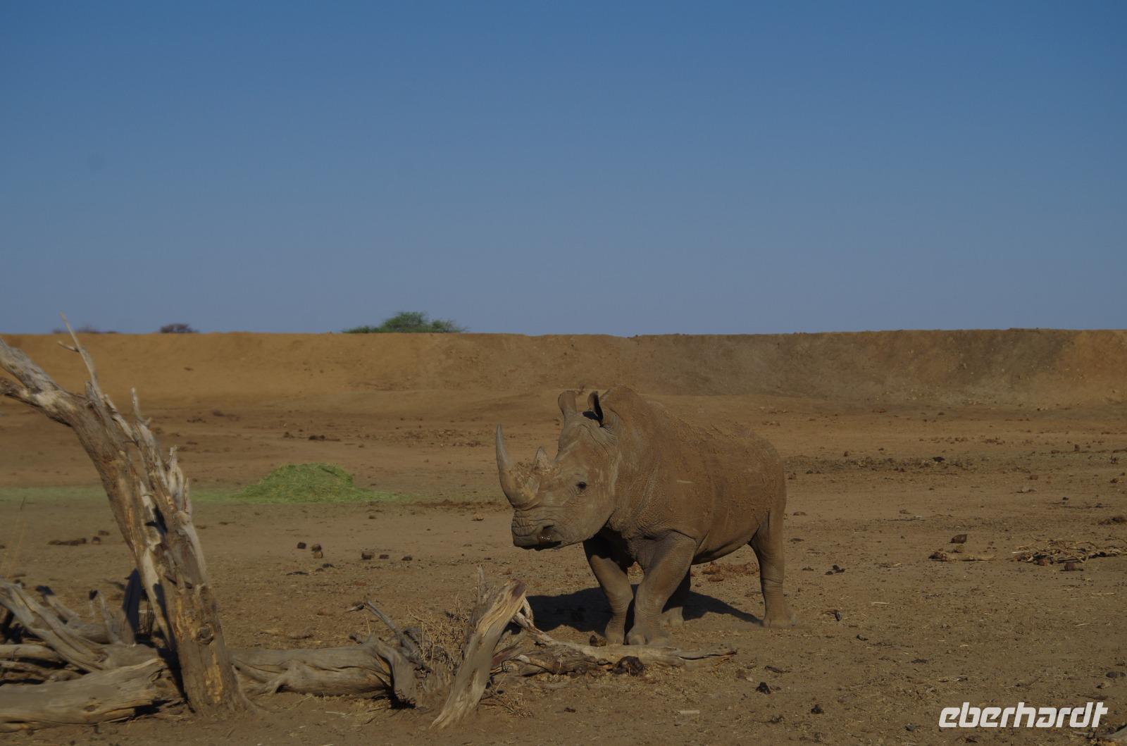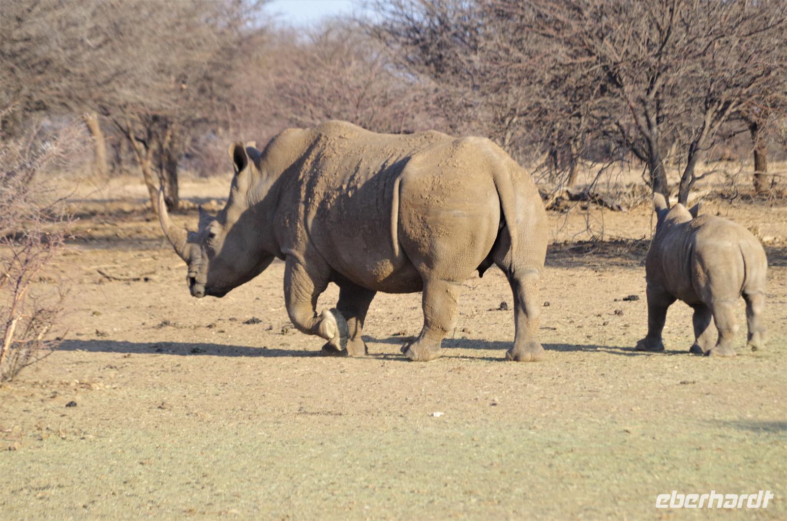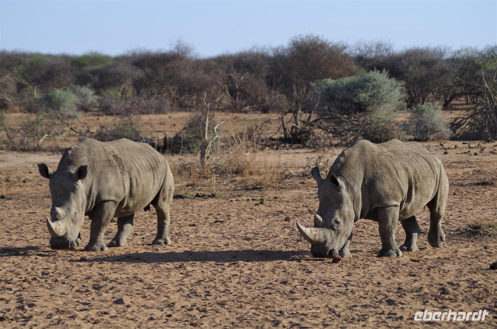 Zunächst fuhren wir nach Outjo (Kleiner Hügel). Die Stadt wir auch das Tor zum Etosha genannt, für uns eher der Ausgang, denn unsere Reise neigte sich dem Ende. Hier stöberten wir ausgiebig im schönen Souvenirladen, zogen noch einmal Namibische Rand am Geldautomaten und machten einen kleinen Kaffeeklatsch im netten Farmstall Cafe. Nach Outjo hörte die Asphaltstraße auf und es ging über die Schotterpiste via Kalkrand zur Mount Etjo Lodge weiter. Die Schotterpiste war aber weniger schlecht, als einige Strecken, die wir schon hinter uns hatten. Die Lodge befindet sich im privaten Okonjati Wildreservat, eines der ersten in Namibia. Die Lodge und das Reservat, wurden vom berühmten Wildschützer Jan Oelofse gegründet und aufgebaut. Heute werden sie von seiner Frau und seinem Sohn weitergeführt. Etjo bedeutet Zuflucht, sehr passend, denn hier finden tausende Tiere und 100 verschiedene Vogelarten Schutz. Besonderes Augenmerk wird auf den Schutz vor Wilderei gelegt. In der traumhaften Lodge wurden wir herzlich empfangen und genießen im Garten Kaffee und selbstgebackenen Kuchen. Im aufgestauten Fluss tummelten sich einige Hippos, später kam ein Elefant dazu und an Land sahen wir Eland, Warzenschwein, Wasserbock und Co. Kein schlechter Empfang! Am Nachmittag gingen wir auf unsere letzte Pirschfahrt dieser Reise. Dazu bestiegen wir einen Monstertruck mit Ranger Richard, der, extra für uns, die passende Sonnenbrille trug. Das riesige Wildreservat liegt in einer abwechslungsreichen Gegend, eingebettet zwischen Bergen und Flüssen. Auch hier ist es extrem trocken und aufgrund dieser Dürre werden die Tiere jetzt zugefüttert, um zu überleben. Wir erfahren, dass über 1.600 Schiraffen im Reservat leben und bekommen natürlich auch wieder reichlich zu Gesicht. Auch andere Tiere sehen wir reichlich: Eland-Antilopen, Springböcke, Impalas, Paviane, Warzenschweine, Bergzebras, Oryxe, Wasserböcke, Weißschwanzgnus, Kuhantilopen und Strauße. Besonders sind wir erfreut über den Tiernachwuchs. Sehr süß anzusehen, die kleine Giraffenfamilie mit einem wenige Wochen alten Baby. Richard erzählt, dass eine Giraffe bei der Geburt aus 2 m Höhe fällt. Später sehen wir eine große Anzahl von Breitmaulnashörnern, die sich relativ friedlich unserem Fahrzeug näherten. Etwas dichter im Gebüsch sehen wir noch eine Nashornfamilie mit einem ebenfalls wenige Wochen alten Baby. Das Kleine beäugt uns neugierig, uns geht das Herz auf. Giraffen begleiten uns und eine fliegende Riesentrappe kreuzt unseren Weg. Bevor die Sonne untergeht, hat Richard ein nettes Plätzchen gefunden. Schnell ist die mobile Bar aufgebaut und wir genießen einfach nur. Zum Abendessen werden wir In der Boma, auch Lapa genannt, erwartet und mit einem Cherry begrüßt. Es gibt traditionell afrikanische Küche, also auch gegrilltes Game, dazu verschiedene Beilagen wie Maisbrei und leckere Soßen. Besonders lecker schmeckt uns das Impalasteak und der süße Nachtisch. Ein Dankeschön an die Küche! Tagesetappe: 225 km