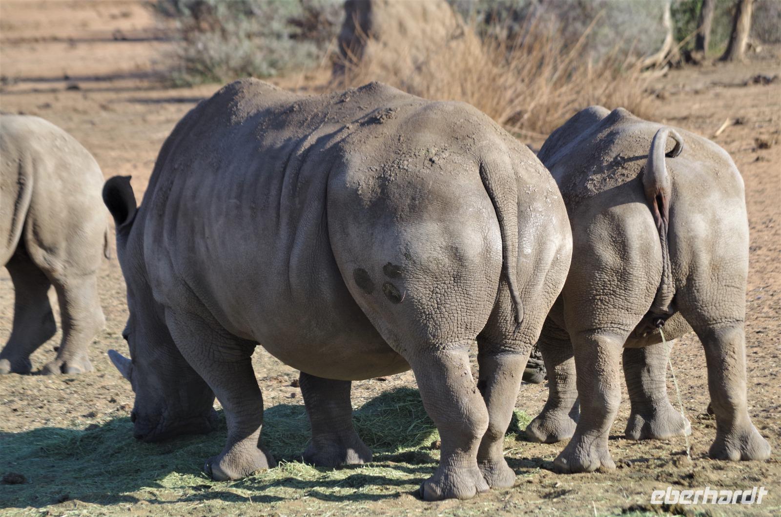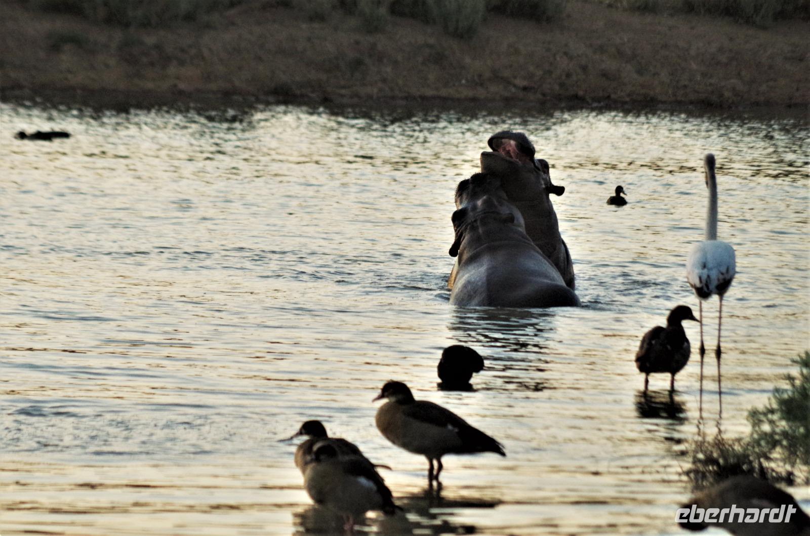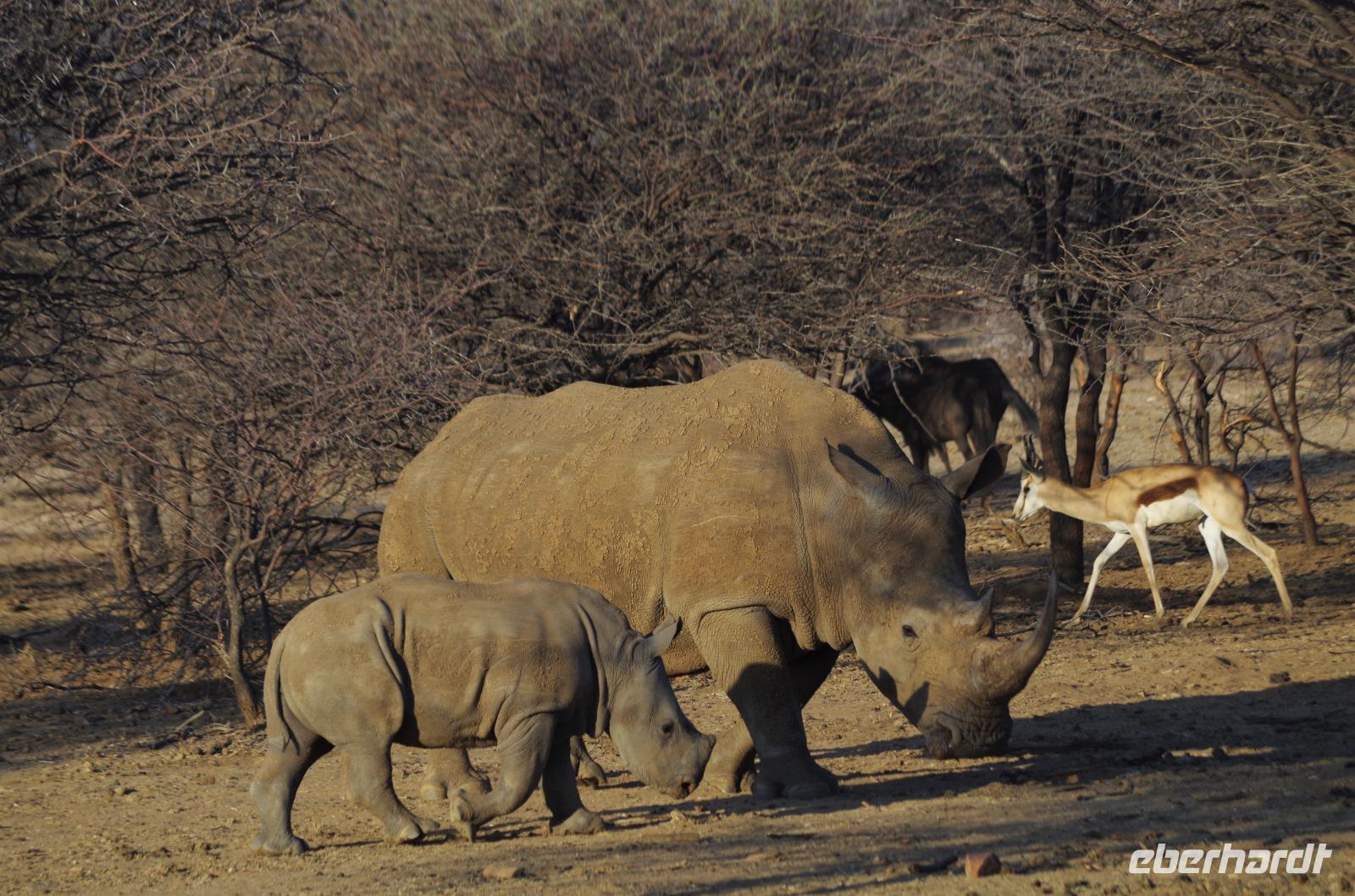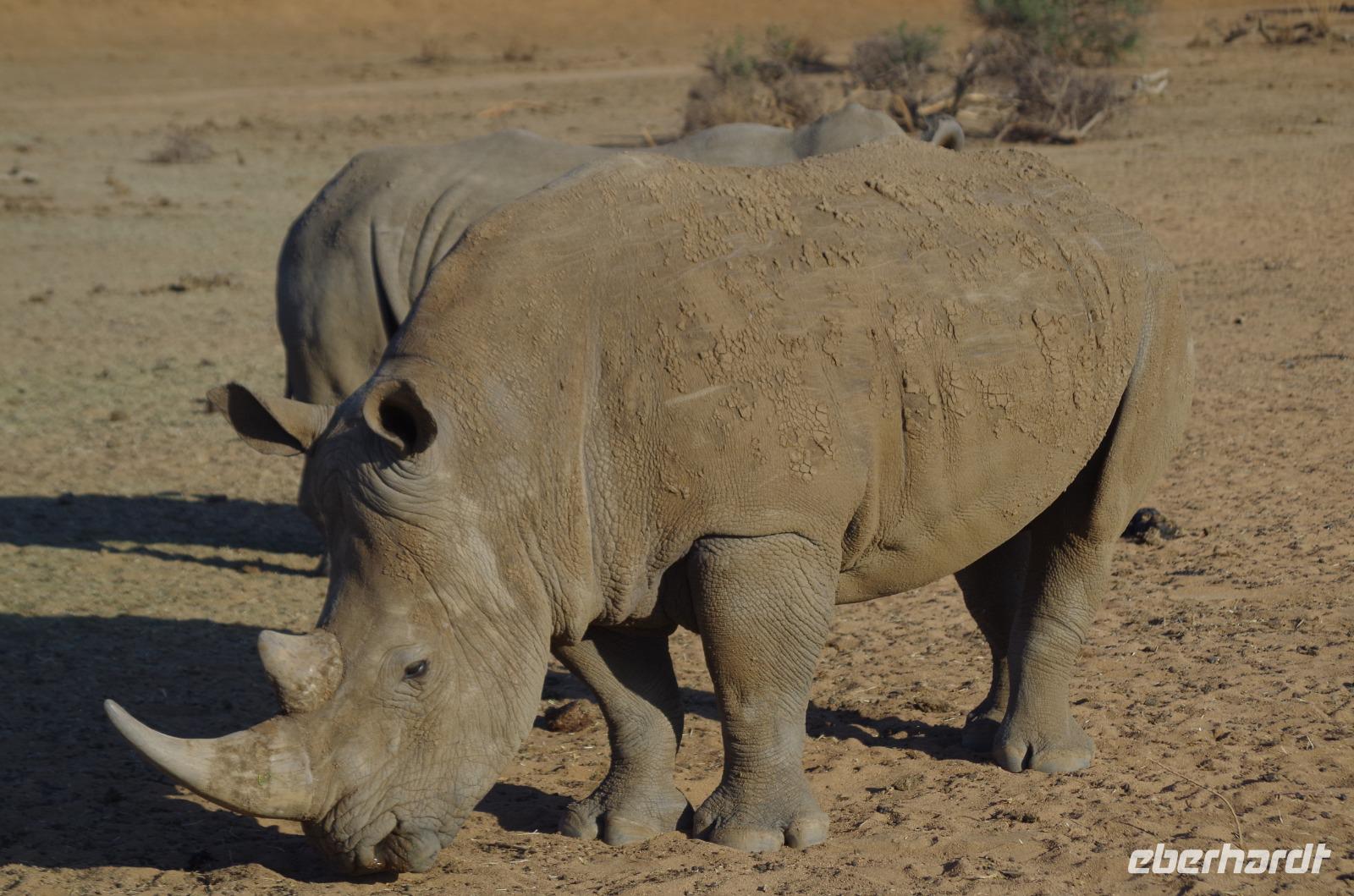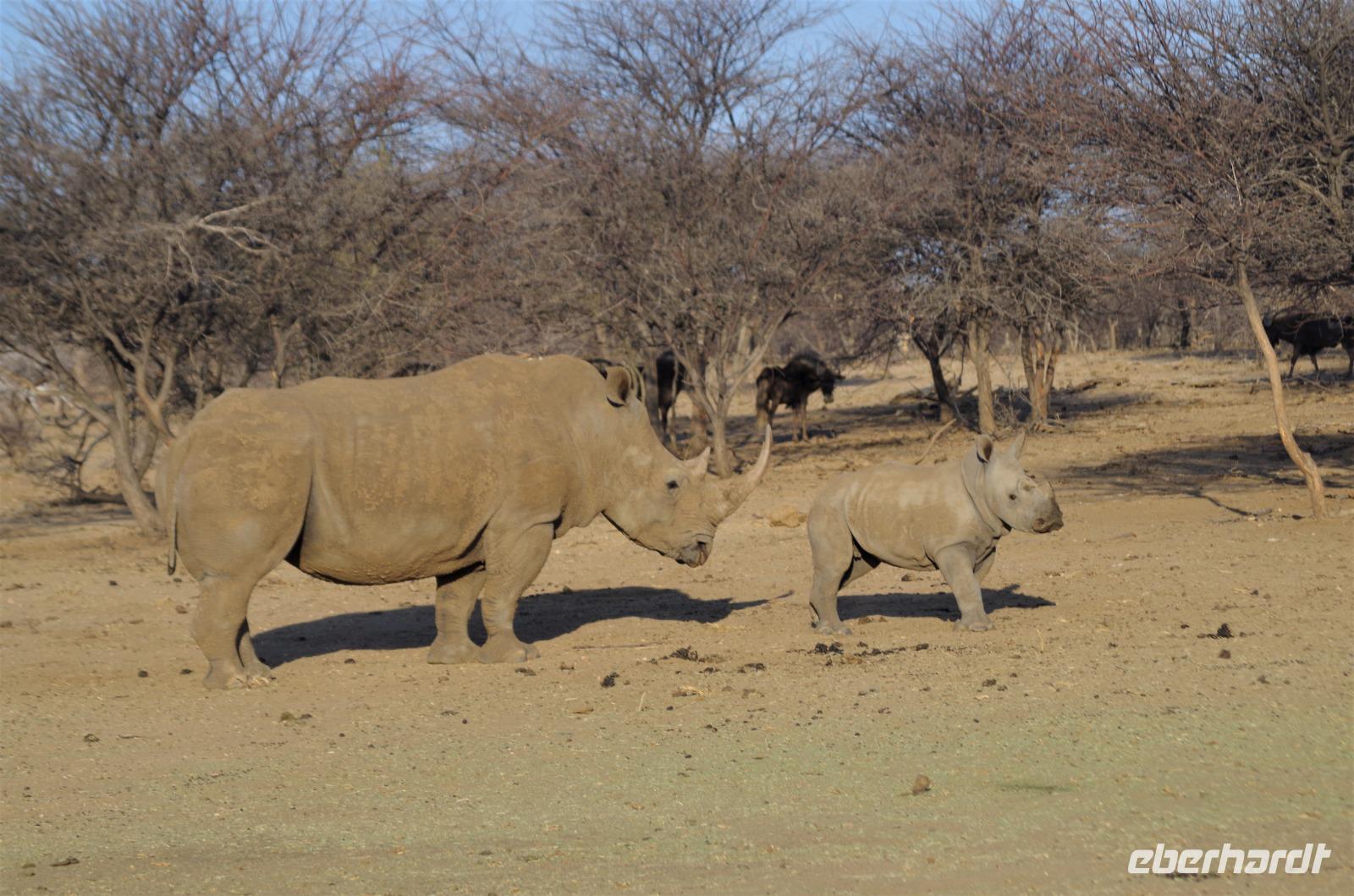 Zunächst fuhren wir nach Outjo (Kleiner Hügel). Die Stadt wir auch das Tor zum Etosha genannt, für uns eher der Ausgang, denn unsere Reise neigte sich dem Ende. Hier stöberten wir ausgiebig im schönen Souvenirladen, zogen noch einmal Namibische Rand am Geldautomaten und machten einen kleinen Kaffeeklatsch im netten Farmstall Cafe. Nach Outjo hörte die Asphaltstraße auf und es ging über die Schotterpiste via Kalkrand zur Mount Etjo Lodge weiter. Die Schotterpiste war aber weniger schlecht, als einige Strecken, die wir schon hinter uns hatten. Die Lodge befindet sich im privaten Okonjati Wildreservat, eines der ersten in Namibia. Die Lodge und das Reservat, wurden vom berühmten Wildschützer Jan Oelofse gegründet und aufgebaut. Heute werden sie von seiner Frau und seinem Sohn weitergeführt. Etjo bedeutet Zuflucht, sehr passend, denn hier finden tausende Tiere und 100 verschiedene Vogelarten Schutz. Besonderes Augenmerk wird auf den Schutz vor Wilderei gelegt. In der traumhaften Lodge wurden wir herzlich empfangen und genießen im Garten Kaffee und selbstgebackenen Kuchen. Im aufgestauten Fluss tummelten sich einige Hippos, später kam ein Elefant dazu und an Land sahen wir Eland, Warzenschwein, Wasserbock und Co. Kein schlechter Empfang! Am Nachmittag gingen wir auf unsere letzte Pirschfahrt dieser Reise. Dazu bestiegen wir einen Monstertruck mit Ranger Richard, der, extra für uns, die passende Sonnenbrille trug. Das riesige Wildreservat liegt in einer abwechslungsreichen Gegend, eingebettet zwischen Bergen und Flüssen. Auch hier ist es extrem trocken und aufgrund dieser Dürre werden die Tiere jetzt zugefüttert, um zu überleben. Wir erfahren, dass über 1.600 Schiraffen im Reservat leben und bekommen natürlich auch wieder reichlich zu Gesicht. Auch andere Tiere sehen wir reichlich: Eland-Antilopen, Springböcke, Impalas, Paviane, Warzenschweine, Bergzebras, Oryxe, Wasserböcke, Weißschwanzgnus, Kuhantilopen und Strauße. Besonders sind wir erfreut über den Tiernachwuchs. Sehr süß anzusehen, die kleine Giraffenfamilie mit einem wenige Wochen alten Baby. Richard erzählt, dass eine Giraffe bei der Geburt aus 2 m Höhe fällt. Später sehen wir eine große Anzahl von Breitmaulnashörnern, die sich relativ friedlich unserem Fahrzeug näherten. Etwas dichter im Gebüsch sehen wir noch eine Nashornfamilie mit einem ebenfalls wenige Wochen alten Baby. Das Kleine beäugt uns neugierig, uns geht das Herz auf. Giraffen begleiten uns und eine fliegende Riesentrappe kreuzt unseren Weg. Bevor die Sonne untergeht, hat Richard ein nettes Plätzchen gefunden. Schnell ist die mobile Bar aufgebaut und wir genießen einfach nur. Zum Abendessen werden wir In der Boma, auch Lapa genannt, erwartet und mit einem Cherry begrüßt. Es gibt traditionell afrikanische Küche, also auch gegrilltes Game, dazu verschiedene Beilagen wie Maisbrei und leckere Soßen. Besonders lecker schmeckt uns das Impalasteak und der süße Nachtisch. Ein Dankeschön an die Küche! Tagesetappe: 225 km
