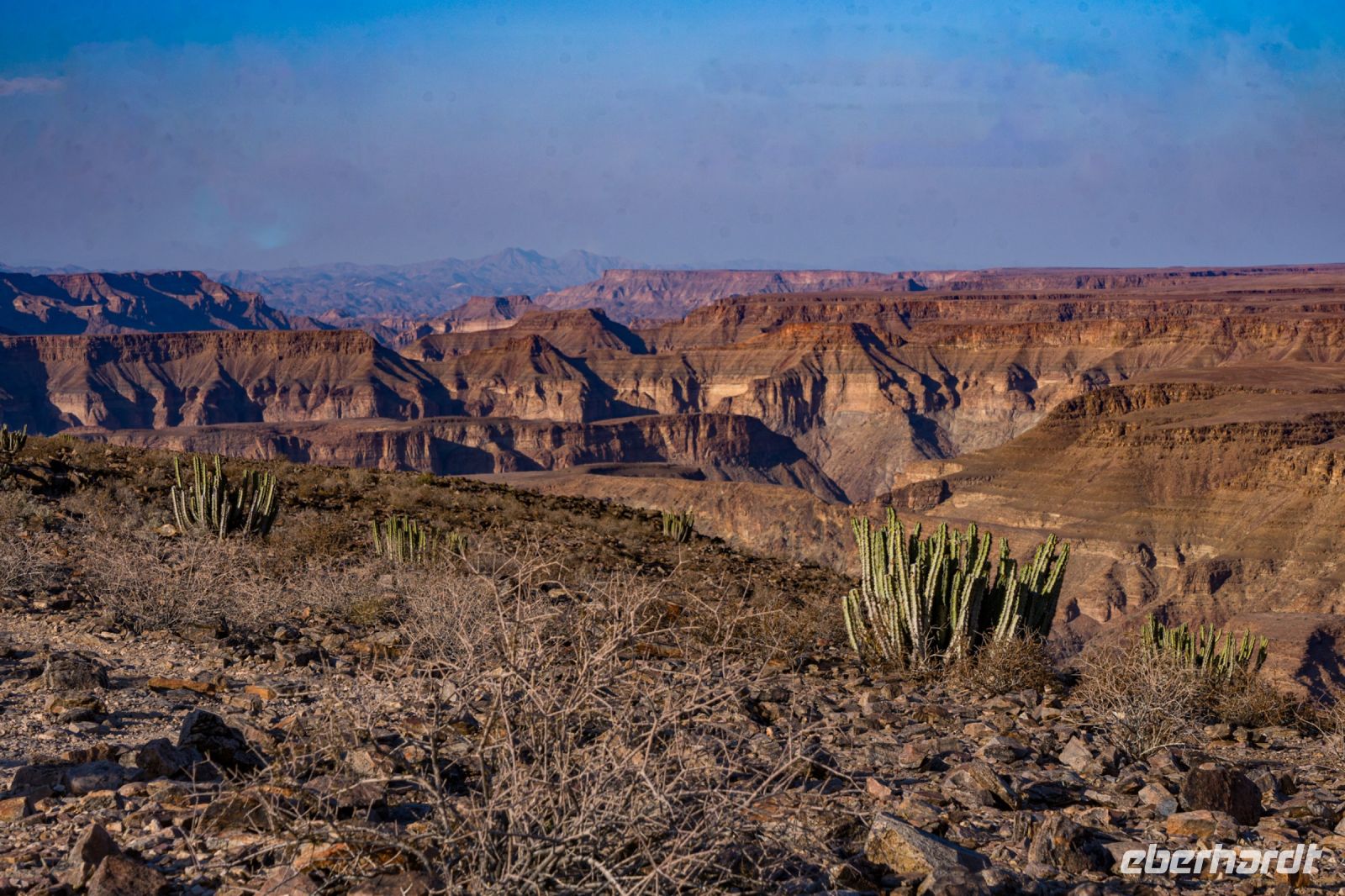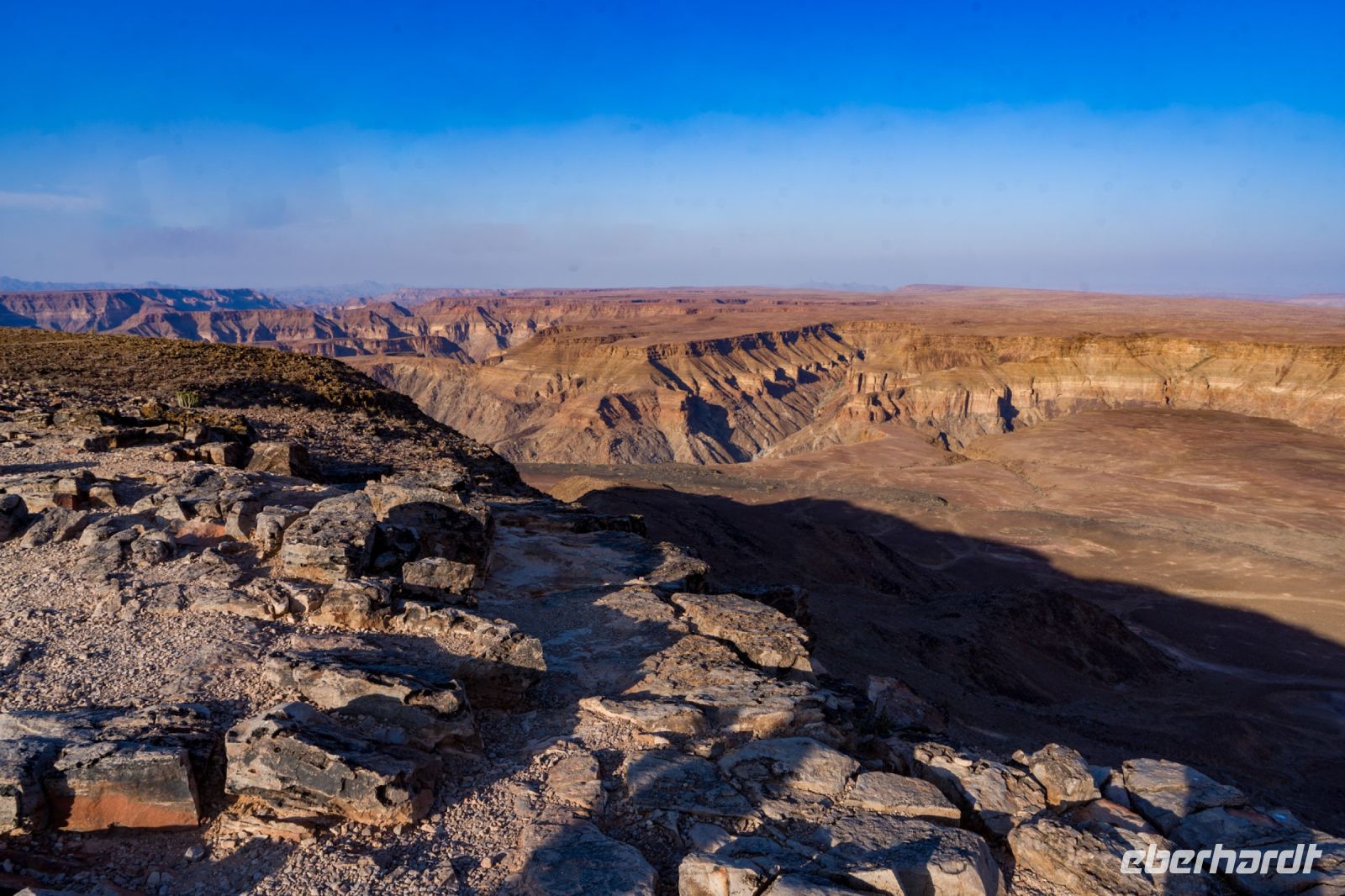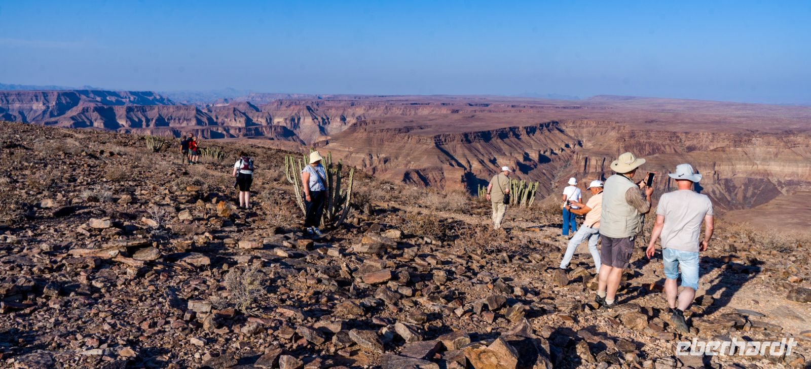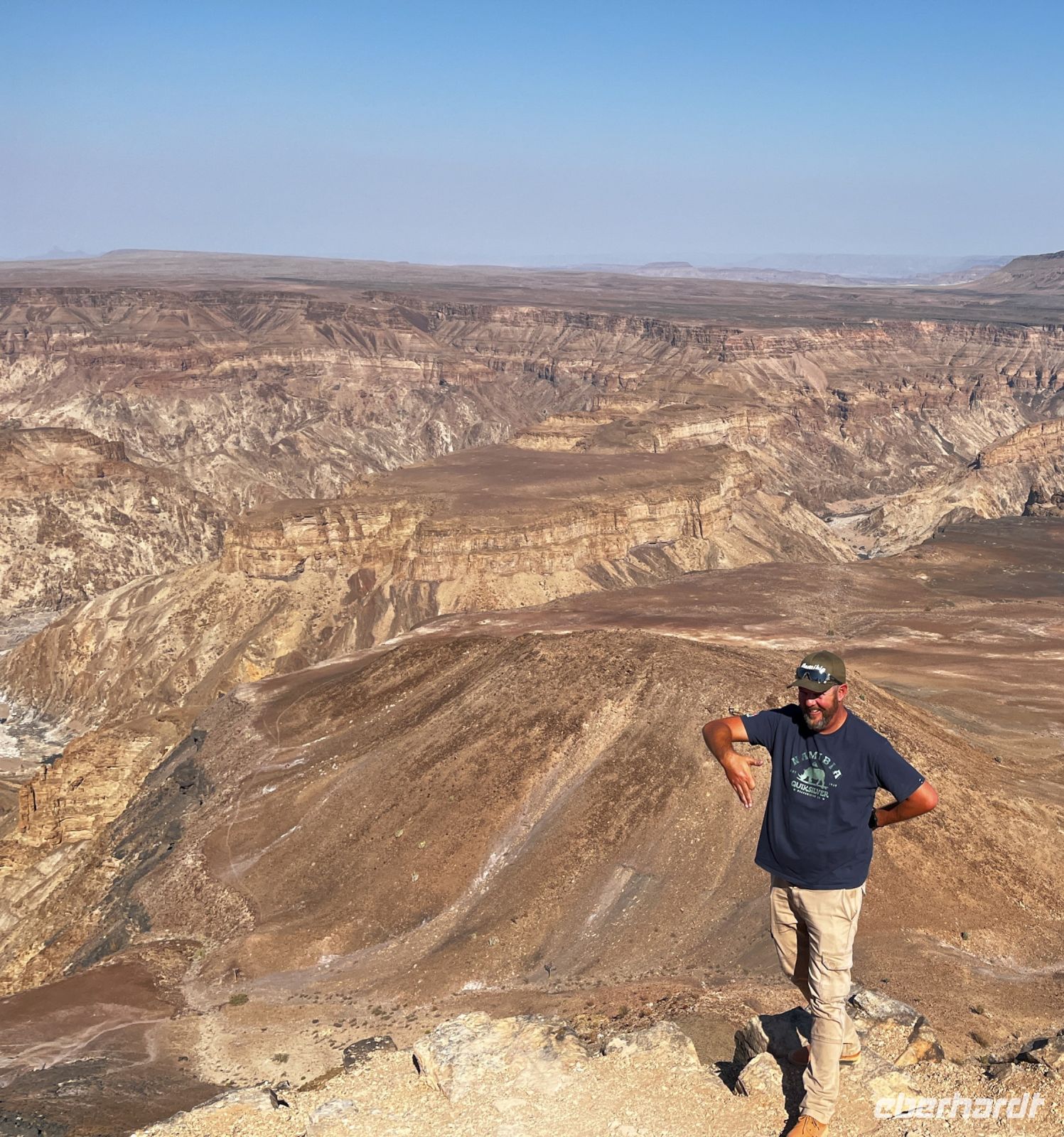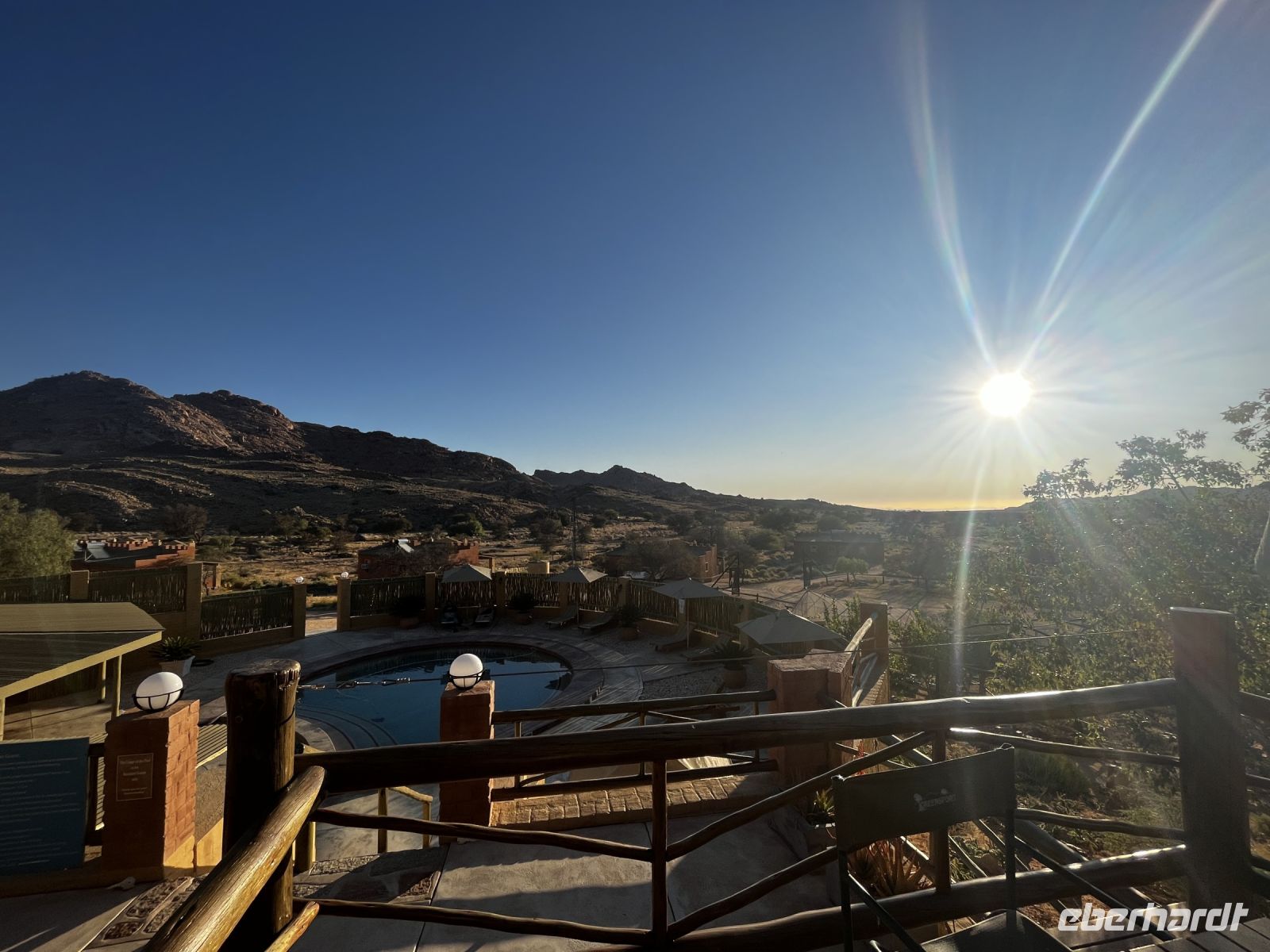Heute Morgen stand ein besonderes Highlight auf dem Programm. Der Fish River Canyon. Der wohl zweitgrößte Canyon der Welt. Um diesen bei besonderen Licht zu betrachten, starten wir zeitig. Zunächst fuhren wir etwas abseits der regulären Aussichtspunkte off-road, um die anderen Touristen zu meiden. Es lohnte sich, denn wir hatten den Punkt allein für uns und eine grandiose Aussicht. Danach ging es zum ersten Aussichtspunkt, von wo aus wir zum zweiten entlang der Kante wanderten. Joe machte sich auch immer wieder den Spaß ganz besonders nah an den Abhang zu fahren, um uns zu erschrecken. Ich meine natürlich um uns die bestmögliche Aussicht zu bieten ;). Gegen Mittag fuhren wir dann zurück zu Lodge, wo die meisten noch ein Sandwich oder Salat zum Lunch aßen, bevor die Entspannung am Pool oder den Terrassen begann. Gegen frühen Abend traf sich ein Großteil unserer Gruppe, um sich zu einen Sundowner Walk aufzumachen. Der kurze Anstieg auf den kleinen Felshügel machte uns nichts aus. Oben angekommen genossen wir die entspannte Abendstimmung bei einem Getränk währenddessen die Sonne langsam hinter der Bergkette versank. Im halbdunkel spazierten wir fröhlich zurück, um beim Abendessen den Tag gemütlich ausklingen zu lassen.