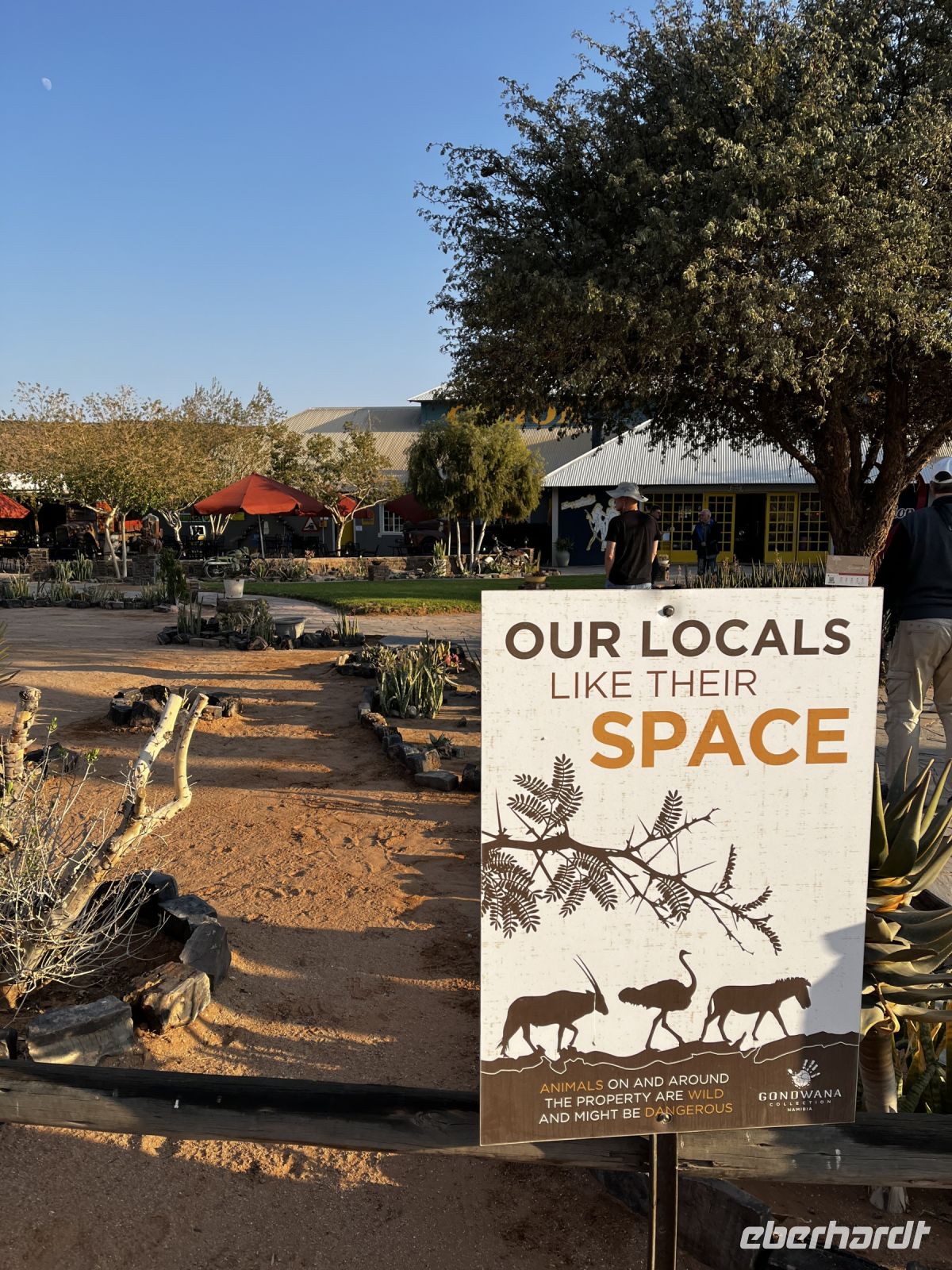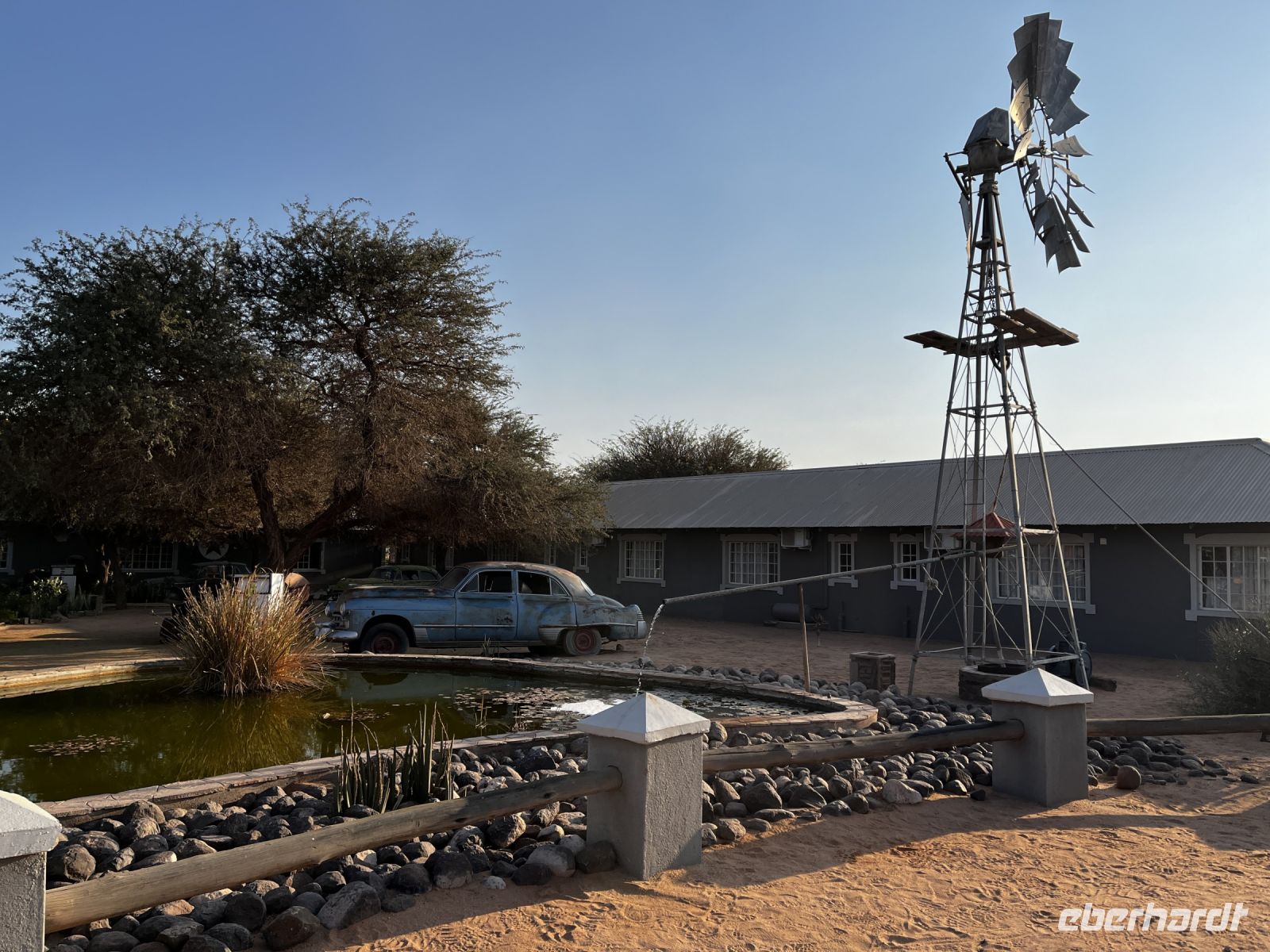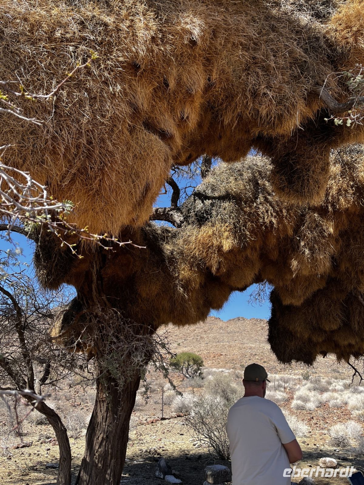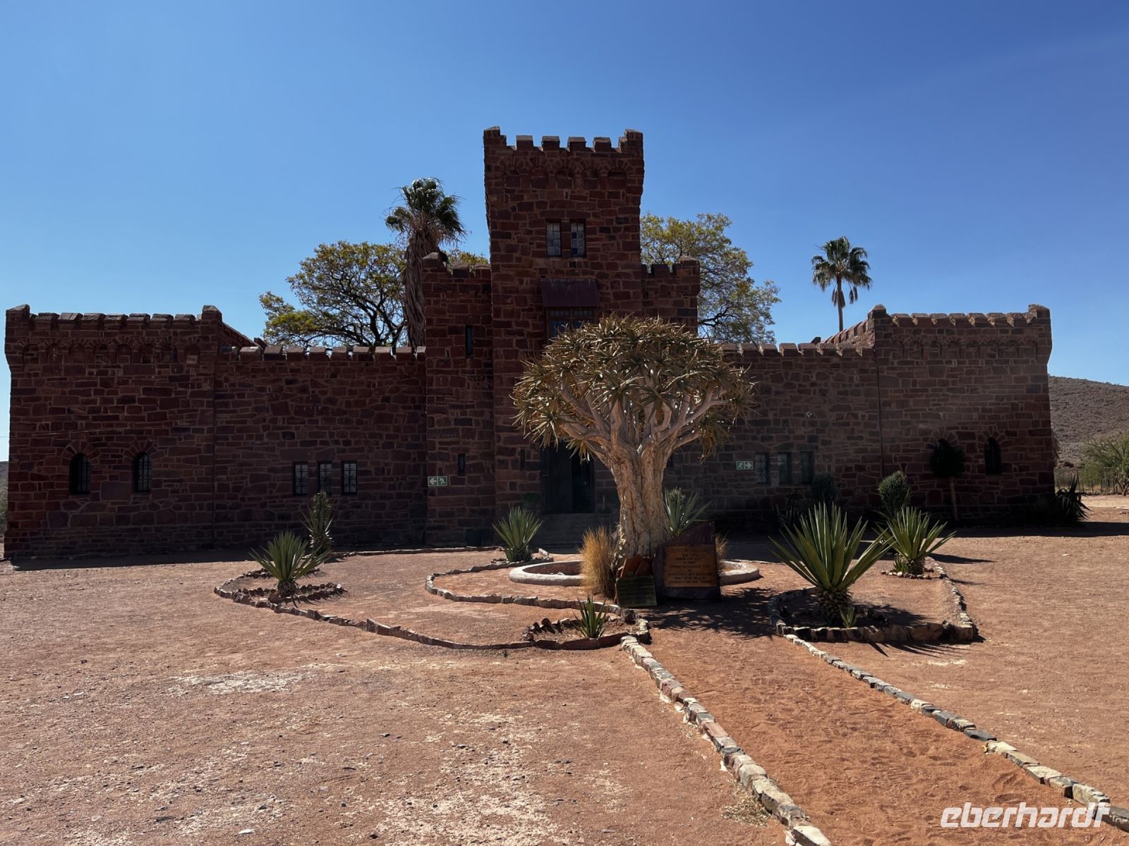 In Helmeringhausen legten wir unseren ersten Stopp ein. Der kleine beschauliche Ort besteht nur aus ein paar Häusern und einer Straße. Im örtlichen Hotel sollte es den besten Apfelkuchen geben! Den mussten wir natürlich testen. Oder wer wollte Bratwurst und Currywurst. Gut gestärkt fuhren wir weiter über die Schotterstraße Richtung Sessriem. Die Schotterstraße, war schon sehr speziell für uns, da wir ziemlich durchgerüttelt wurden. Dafür wurden wir mit vielen abwechslungsreichen Landschaft belohnt. Aber wie Joe immer so schön sagte: es wird noch schöner! Auch zeigte uns Joe am Wegesrand ein riesiges Siedelweber-Nest. Mehrere hundert Tieren nehmen den ganzen Baum ein. Auf halben Weg legten wir noch einen Stopp am Duswib Castle ein. Fast mitten im Nirgendwo wurde hier ein Schloss am Anfang des 20. Jahrhunderts errichtet. Außen erscheint dieses wie ein Fort und innen wie ein mitteleuropäisches Schloss. Mit einigen Bildern mehr im Gepäck, fuhren wir noch das letzte holprige Stück bis zu unserer nächsten Unterkunft, der Sossusvlei Lodge. Das Abendessen gab es als schönes BBQ auf der eigenen Terrasse.