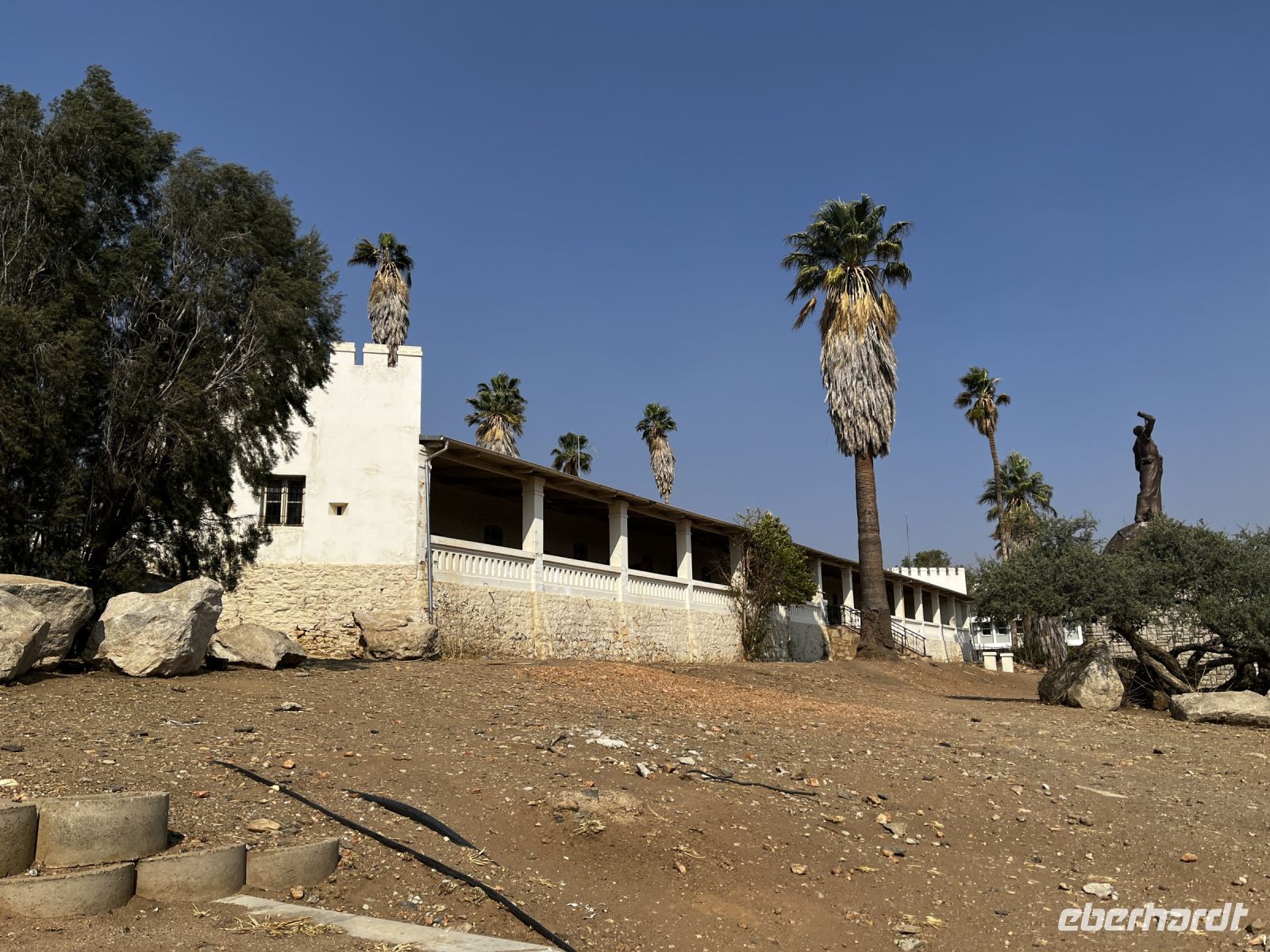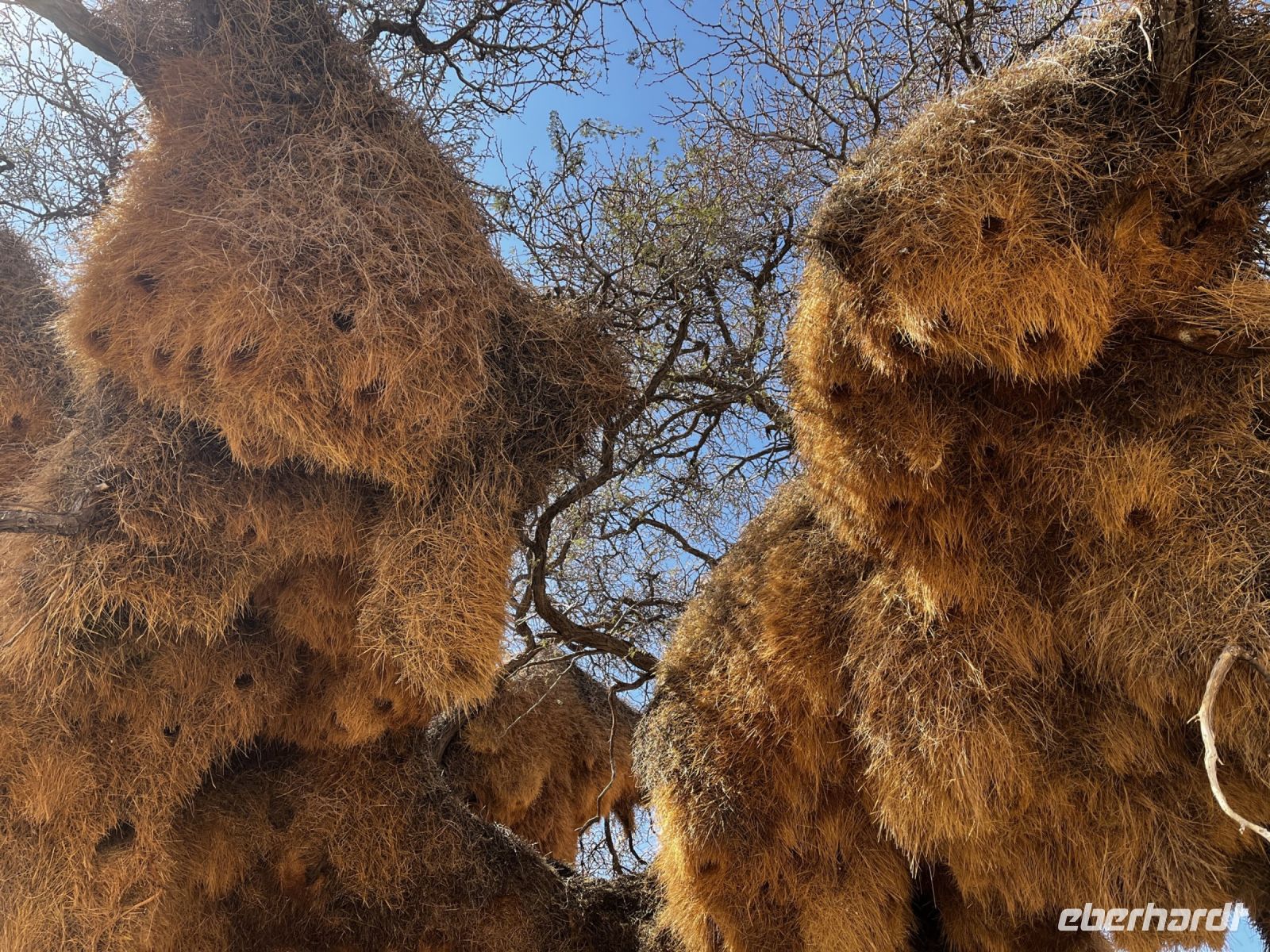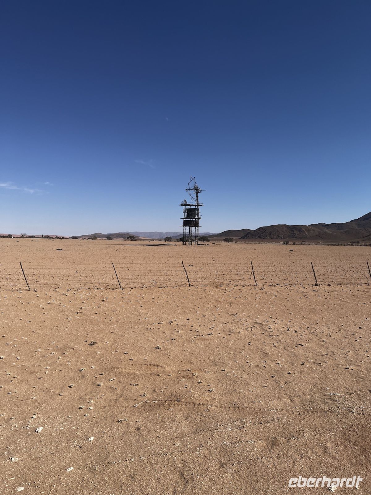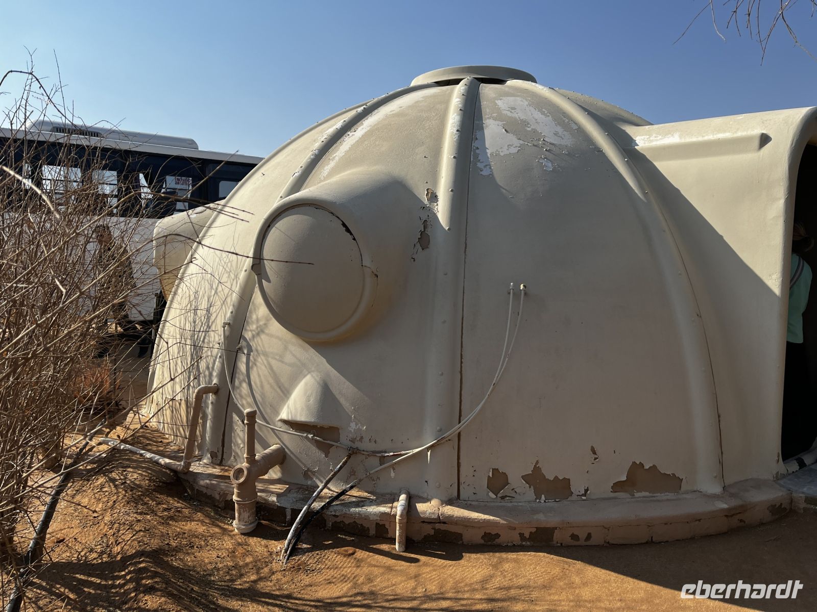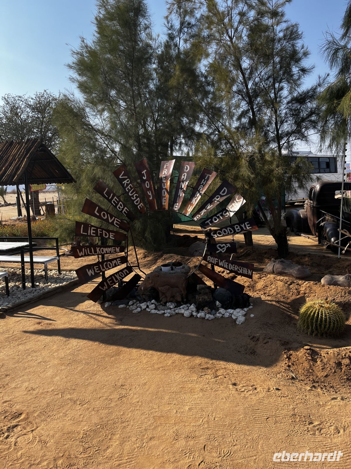 In Helmeringhausen legten wir unseren ersten Stopp ein. Der kleine beschauliche Ort besteht nur aus ein paar Häusern und einer Straße. Im örtlichen Hotel sollte es den besten Apfelkuchen geben! Den mussten wir natürlich testen. Oder wer wollte Bratwurst und Currywurst. Gut gestärkt fuhren wir weiter über die Schotterstraße Richtung Sessriem. Die Schotterstraße, war schon sehr speziell für uns, da wir ziemlich durchgerüttelt wurden. Dafür wurden wir mit vielen abwechslungsreichen Landschaft belohnt. Aber wie Joe immer so schön sagte: es wird noch schöner! Auch zeigte uns Joe am Wegesrand ein riesiges Siedelweber-Nest. Mehrere hundert Tieren nehmen den ganzen Baum ein. Auf halben Weg legten wir noch einen Stopp am Duswib Castle ein. Fast mitten im Nirgendwo wurde hier ein Schloss am Anfang des 20. Jahrhunderts errichtet. Außen erscheint dieses wie ein Fort und innen wie ein mitteleuropäisches Schloss. Mit einigen Bildern mehr im Gepäck, fuhren wir noch das letzte holprige Stück bis zu unserer nächsten Unterkunft, der Sossusvlei Lodge. Das Abendessen gab es als schönes BBQ auf der eigenen Terrasse.