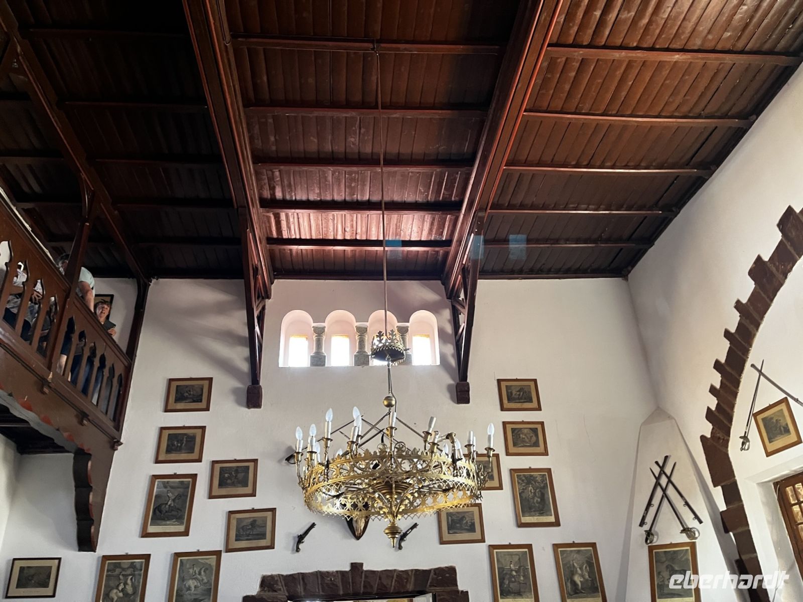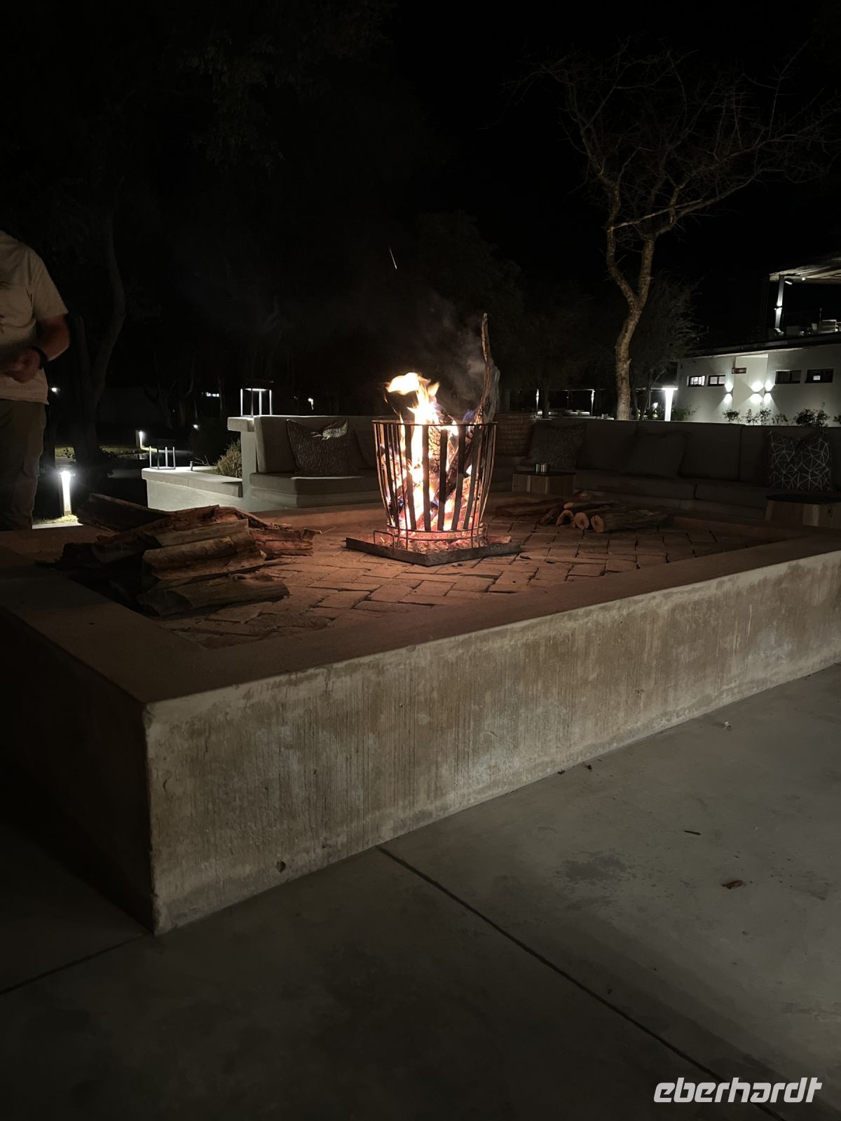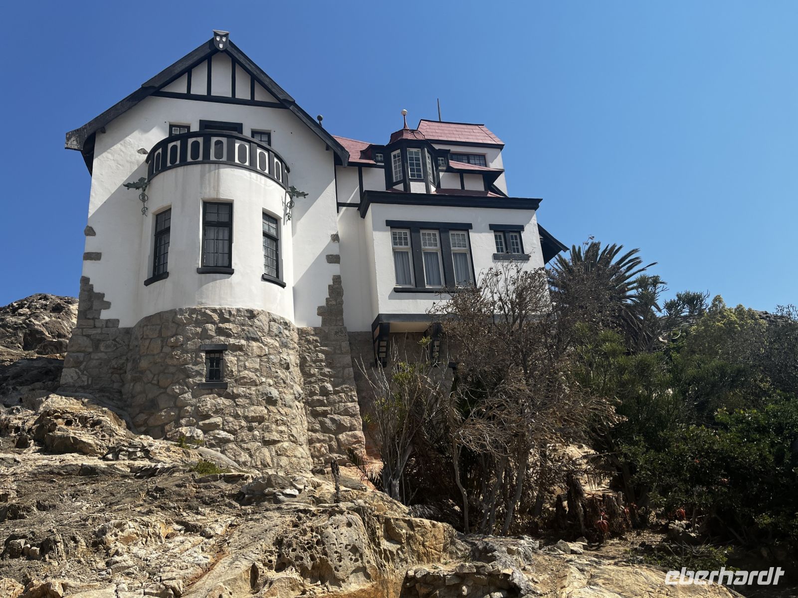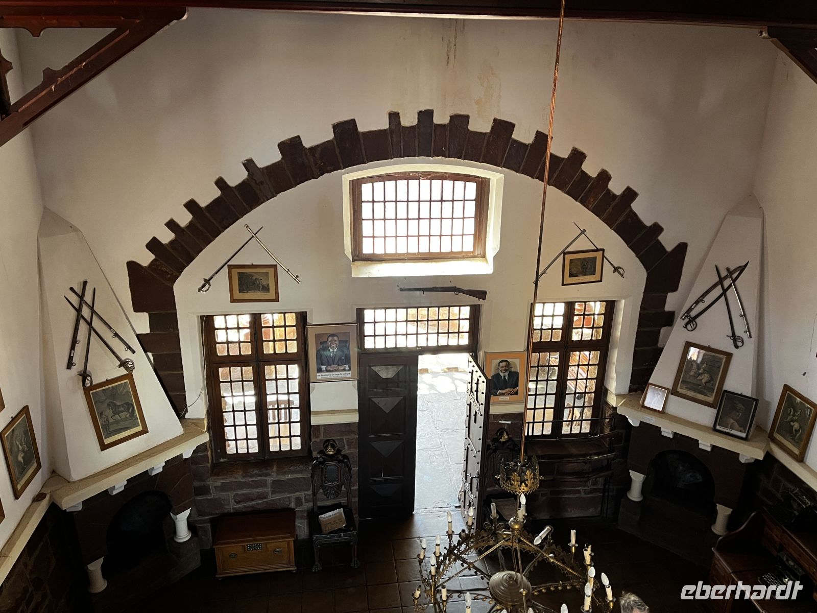 In Helmeringhausen legten wir unseren ersten Stopp ein. Der kleine beschauliche Ort besteht nur aus ein paar Häusern und einer Straße. Im örtlichen Hotel sollte es den besten Apfelkuchen geben! Den mussten wir natürlich testen. Oder wer wollte Bratwurst und Currywurst. Gut gestärkt fuhren wir weiter über die Schotterstraße Richtung Sessriem. Die Schotterstraße, war schon sehr speziell für uns, da wir ziemlich durchgerüttelt wurden. Dafür wurden wir mit vielen abwechslungsreichen Landschaft belohnt. Aber wie Joe immer so schön sagte: es wird noch schöner! Auch zeigte uns Joe am Wegesrand ein riesiges Siedelweber-Nest. Mehrere hundert Tieren nehmen den ganzen Baum ein. Auf halben Weg legten wir noch einen Stopp am Duswib Castle ein. Fast mitten im Nirgendwo wurde hier ein Schloss am Anfang des 20. Jahrhunderts errichtet. Außen erscheint dieses wie ein Fort und innen wie ein mitteleuropäisches Schloss. Mit einigen Bildern mehr im Gepäck, fuhren wir noch das letzte holprige Stück bis zu unserer nächsten Unterkunft, der Sossusvlei Lodge. Das Abendessen gab es als schönes BBQ auf der eigenen Terrasse.