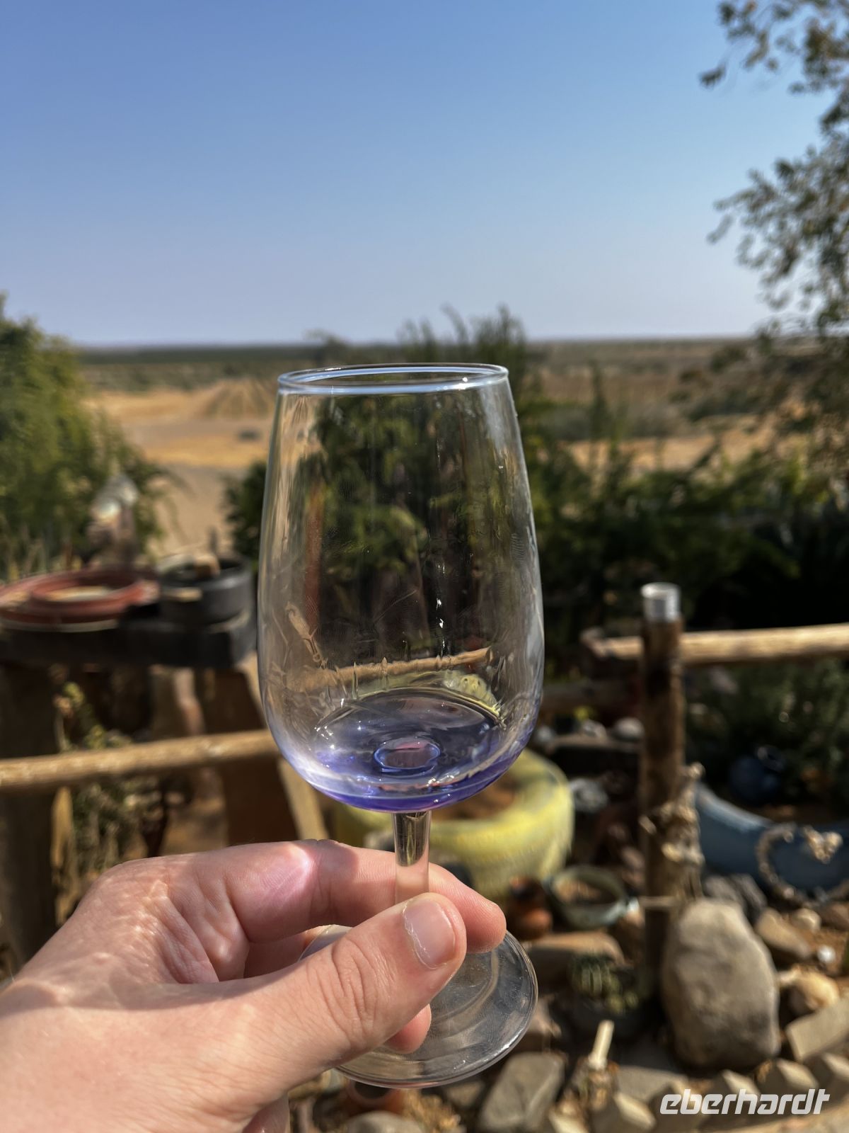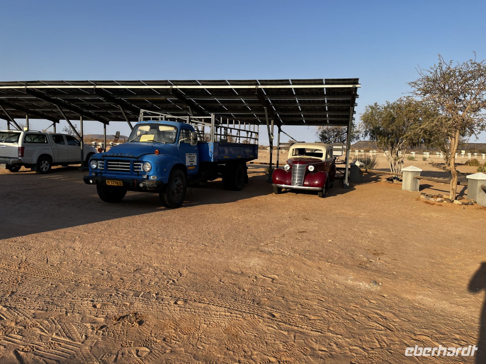 Heute hieß es Abschied nehmen vom Canyon Village. Nach dem Frühstück machten wir uns früh auf, denn wir wollten heute noch einiges auf unserer Weiterreise schaffen. Zunächst ging es zum nächsten Roadhouse, Joe musste tanken und wir konnten Bilder vom Gebäude im amerikanischen Diner Stil sowie der unzähligen Oldtimer auf dem Gelände schießen. Nachdem der Tank voll war, ging es ein kurzes Stück weiter. Joe brachte uns zu einer besonderen Farm, die er liebevoll Area 51 von Namibia nennt. Die Besitzer haben ihre Farm mit besonderen Accessoires gestaltet und bieten neben einem kleinen Shop, Unterkünften auch noch eine gute Apfeltarte an. Damit waren wir gut gesättigt und konnten weiter zu einem kleinen Tasting bei Naute Kristall fahren. Hier gab es neben verschiedenen Sorten Gin auch Wein und Nappa, den Namibischen Grappa, zu verkosten. Dadurch konnten wir unsere lange Fahrt nach Aus gut angeheitert starten. Ein kurzer Blick noch in den Damm und schon ging es wieder auf die Piste, vorbei an den unterschiedlichsten Landschaftsformen. Bevor wir die nächste Lodge erreichten, statteten wir noch den Wasserloch Garub einen Besuch ab. Hier kann man die Wildpferde Namibias gut beobachten. Leider zeigte sich bis auf eines, die Herde nur aus der Ferne durch das Fernglas. Der eine Hengst am Wasserloch kam aber so nah, dass einige ihn streicheln konnten. Ein kleines Erlebnis zum späten Nachmittag, bevor es zu unserer Lodge „Klein Aus Vista“ ging, wo wir die nächsten Nächte verbrachten. Beim leckeren Abendessen, begleitet von einem wunderschönen Sonnenuntergang, ließen wir den Abend ausklingen. ausklingen zu lassen.