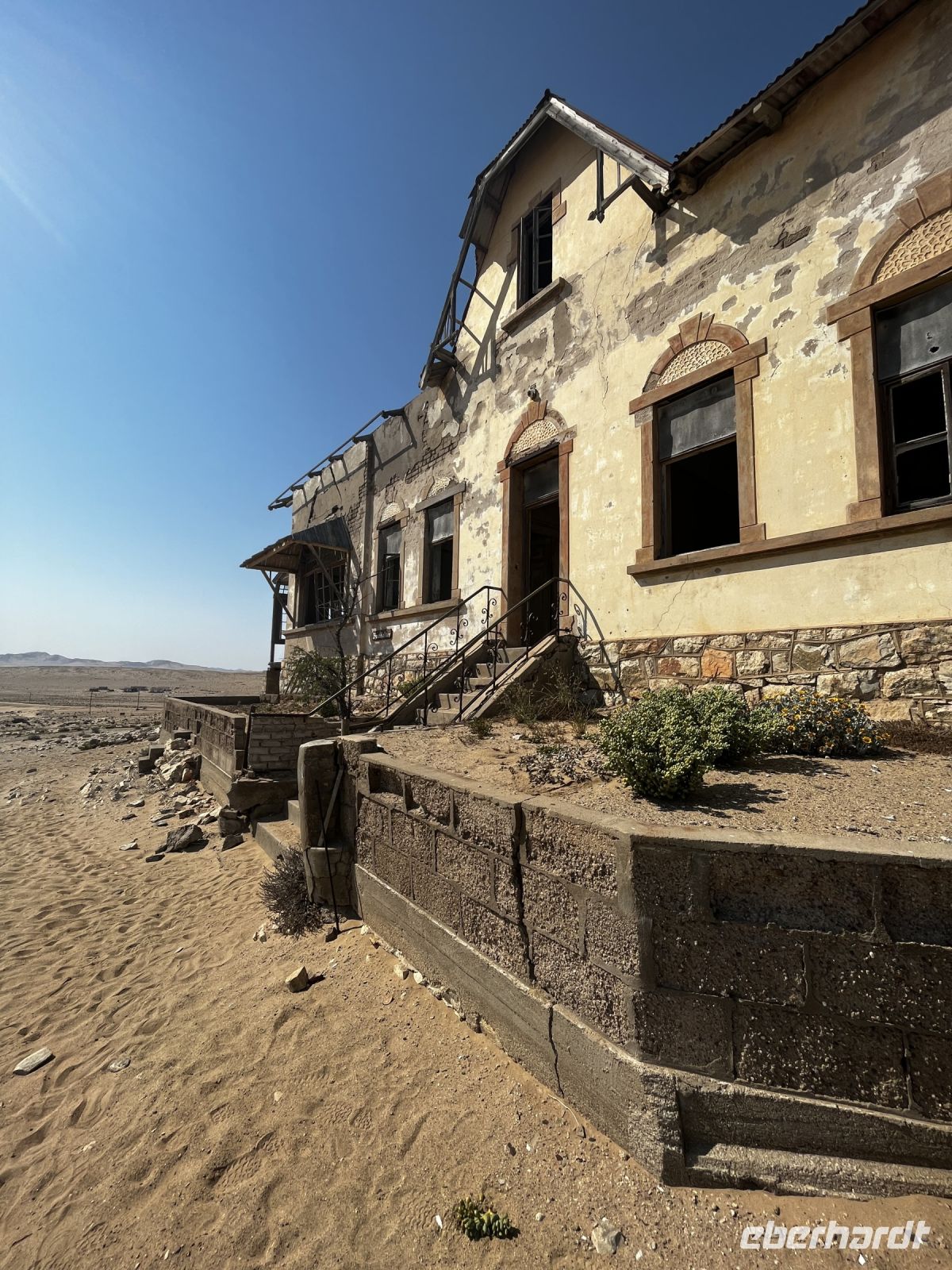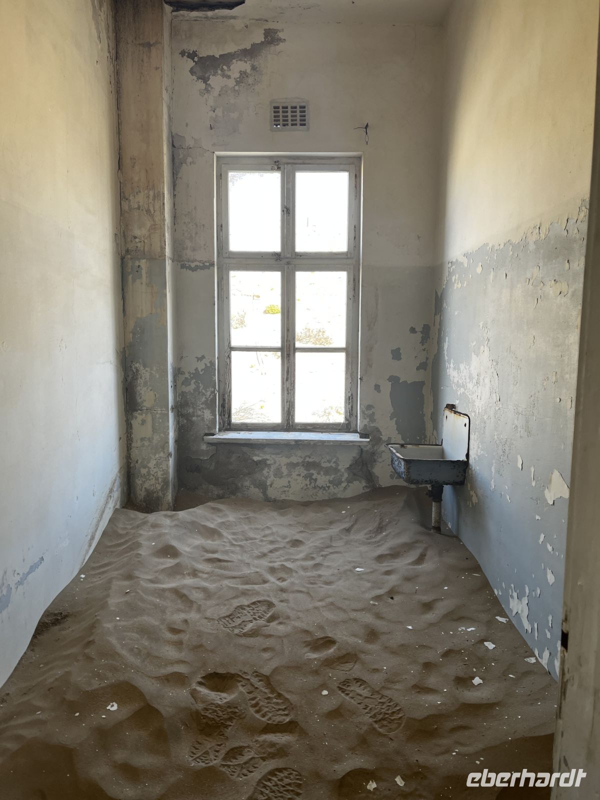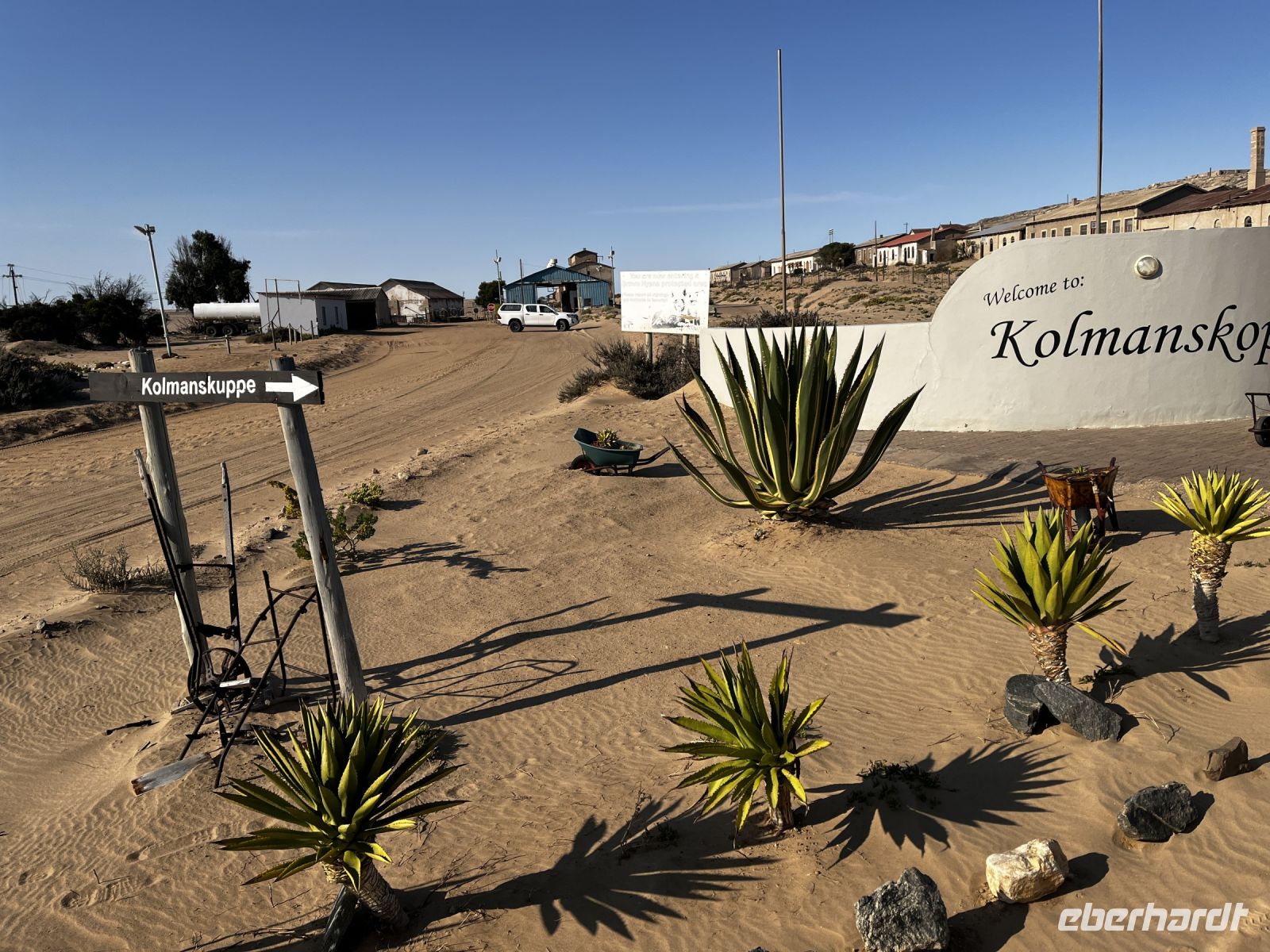 Am heutigen Morgen ging es für uns Richtung Westen, zur Küste. Als erstes steuerten wir die berühmte Kolmannskuppe an. Die einst ruhmreiche Minenstadt, liegt heute nur noch zwischen Sand als Geisterstadt. Dennoch kann man die meisten Gebäude noch gut erhalten besichtigen. Während eines Rundgangs erklärte uns unser Guide Nicole auf fröhliche, lockere Art die Entstehung und das Leben der Diamanten-Stadt. Danach blieb allen noch selbst genügend Zeit die Gebäude von innen und außen ausgiebig zu erkunden und selbst in die Zeit zurückzukehren. Weiter ging es führ uns Richtung Lüderitz. Bevor wir aber ins Zentrum fuhren, bogen wir ab, um entlang der Buchten zum Díaz Point zu fahren. Hier sollte eins der erste portugiesische Seefahrer an Land gegangen sein und das Land als unbewohnbar bezeichnet zu haben. Der Punkt ist heute durch ein Kreuz markiert. Den kurzen Aufstieg absolvierten wir mit viel Gegenwind. Noch bevor es zurück nach Lüderitz ging, wurde der Strand nach den besten Muscheln abgesucht, denn diese waren hier massenhaft zu finden. In Lüderitz zurück legten wir die Mittagspause beim hiesigen portugiesischen Restaurant ein. Hier wird hauptsächlich Fisch angeboten und die meisten unser Gruppen bestellten den so angepriesenen Kingklip. Mit etwas Geduld konnten wir uns diesen schmecken lassen. Auf den Rückweg nach Aus legten wir einige Stopps ein, um die für uns untypischen Straßenschilder zu Fotografieren. Auch die alte Bahnstation von Garub war vor unseren Kameras nicht sicher. Ein Versuch bei den Wildpferden blieb leider ohne Erfolg, aber wir hatten am nächsten Morgen noch eine Chance.