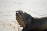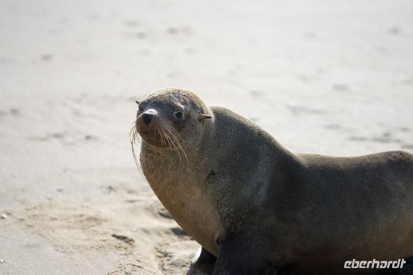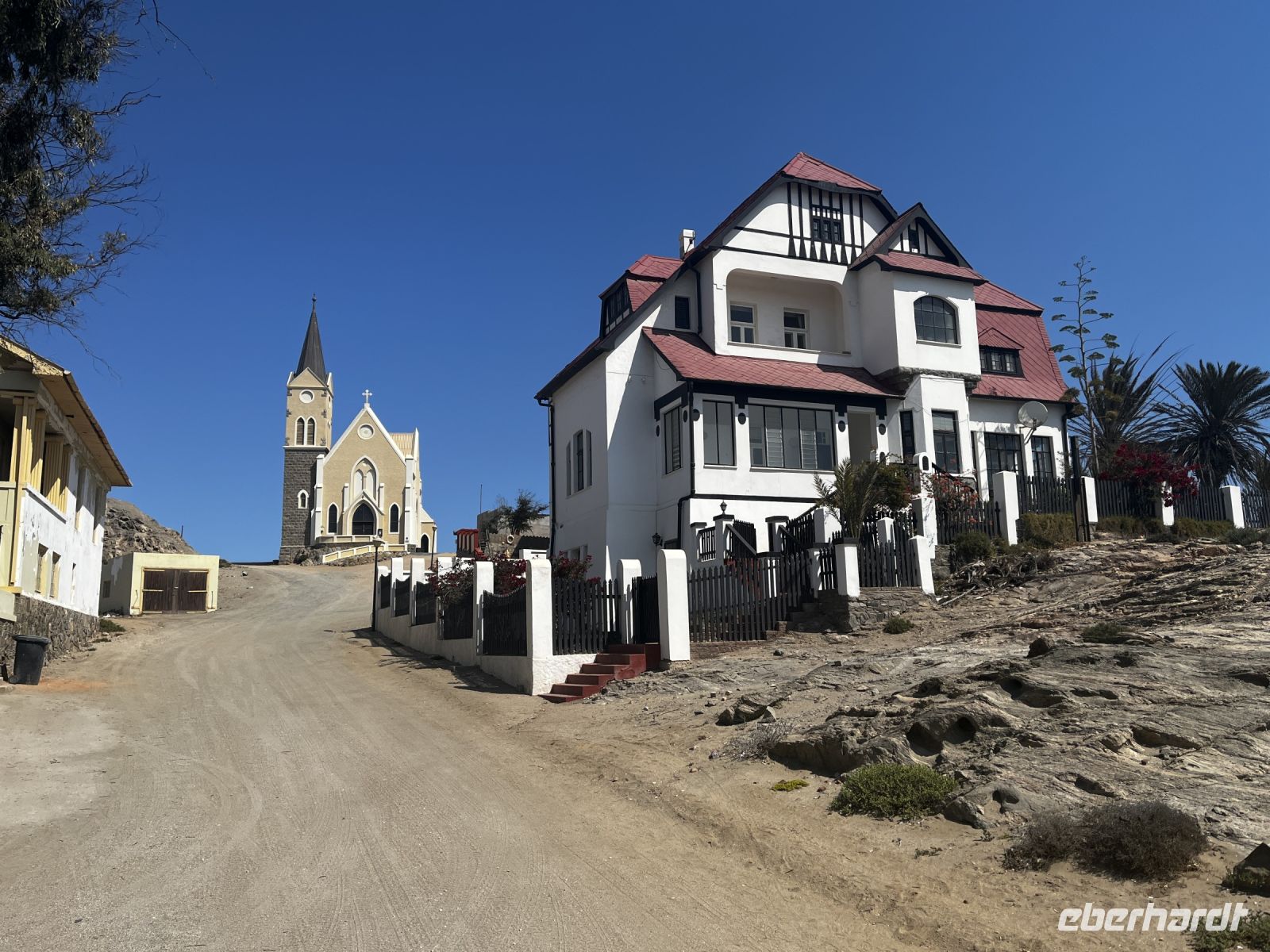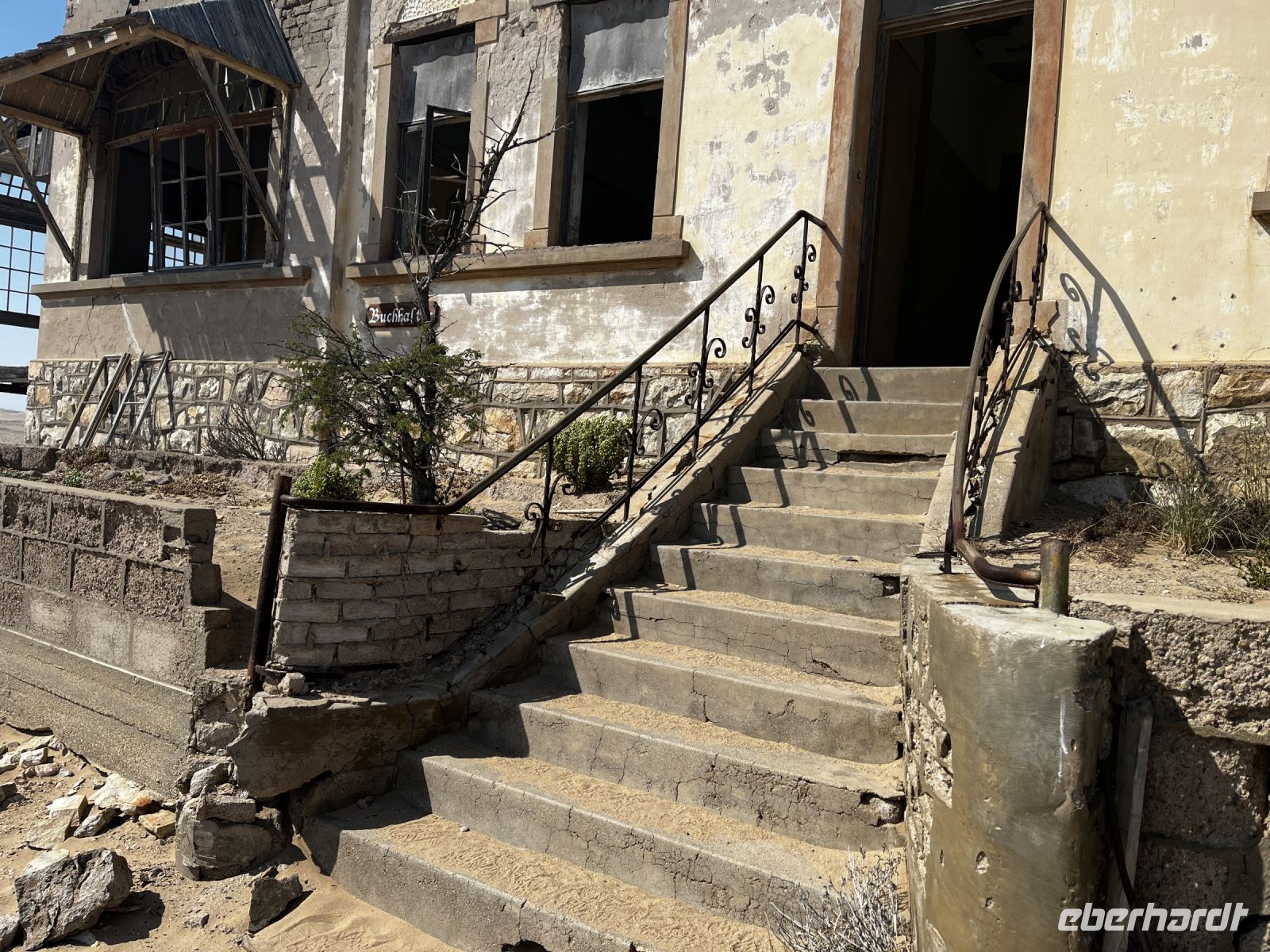Am heutigen Morgen ging es für uns Richtung Westen, zur Küste. Als erstes steuerten wir die berühmte Kolmannskuppe an. Die einst ruhmreiche Minenstadt, liegt heute nur noch zwischen Sand als Geisterstadt. Dennoch kann man die meisten Gebäude noch gut erhalten besichtigen. Während eines Rundgangs erklärte uns unser Guide Nicole auf fröhliche, lockere Art die Entstehung und das Leben der Diamanten-Stadt. Danach blieb allen noch selbst genügend Zeit die Gebäude von innen und außen ausgiebig zu erkunden und selbst in die Zeit zurückzukehren. Weiter ging es führ uns Richtung Lüderitz. Bevor wir aber ins Zentrum fuhren, bogen wir ab, um entlang der Buchten zum Díaz Point zu fahren. Hier sollte eins der erste portugiesische Seefahrer an Land gegangen sein und das Land als unbewohnbar bezeichnet zu haben. Der Punkt ist heute durch ein Kreuz markiert. Den kurzen Aufstieg absolvierten wir mit viel Gegenwind. Noch bevor es zurück nach Lüderitz ging, wurde der Strand nach den besten Muscheln abgesucht, denn diese waren hier massenhaft zu finden. In Lüderitz zurück legten wir die Mittagspause beim hiesigen portugiesischen Restaurant ein. Hier wird hauptsächlich Fisch angeboten und die meisten unser Gruppen bestellten den so angepriesenen Kingklip. Mit etwas Geduld konnten wir uns diesen schmecken lassen. Auf den Rückweg nach Aus legten wir einige Stopps ein, um die für uns untypischen Straßenschilder zu Fotografieren. Auch die alte Bahnstation von Garub war vor unseren Kameras nicht sicher. Ein Versuch bei den Wildpferden blieb leider ohne Erfolg, aber wir hatten am nächsten Morgen noch eine Chance.