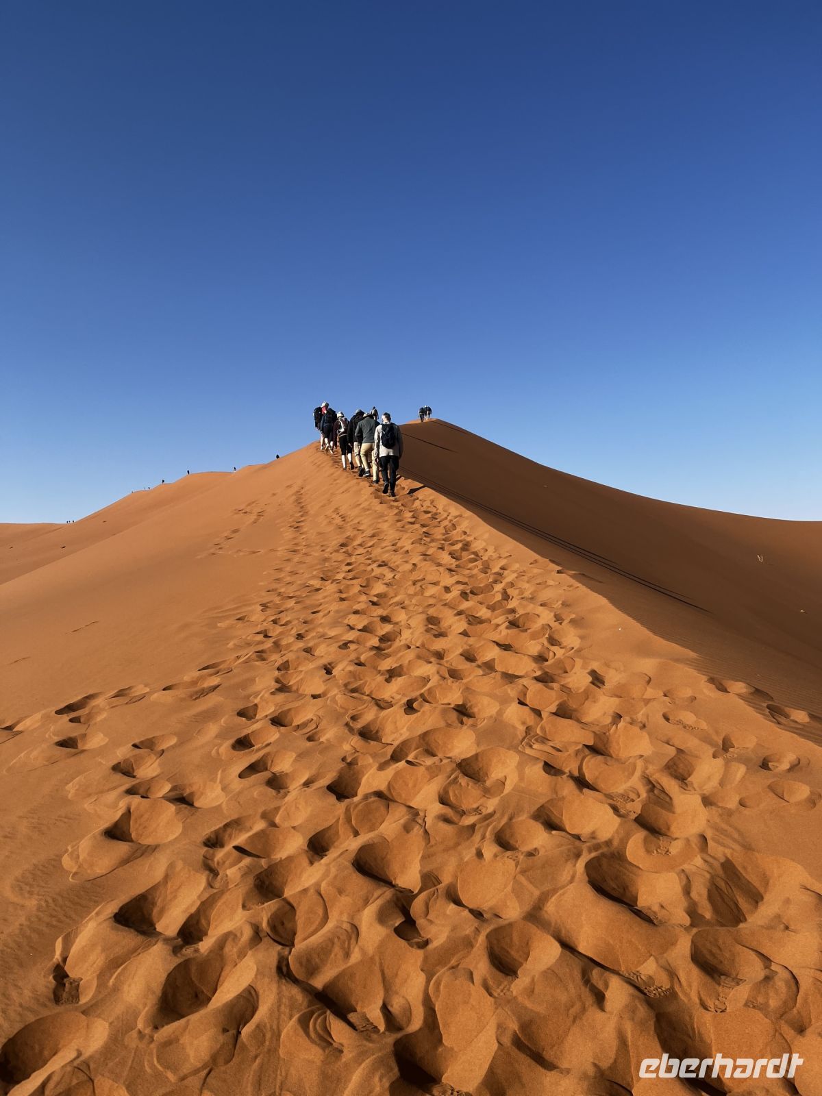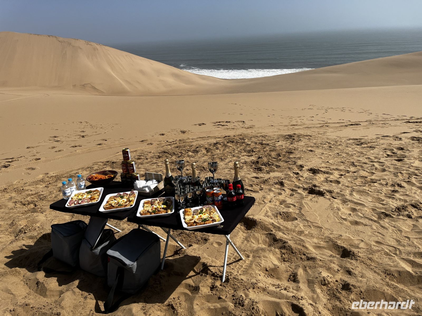 Am Ende der 60 km langen Teerstraße mussten wir in Allradfahrzeuge umsteigen, damit wir die letzten zwei Kilometer zu den wirklichen Highlights hoppeln konnten. Angekommen teilten wir uns in mehrere Grüppchen auf, denn es gab unterschiedlich schwere Wege zum weltbekannten Dead Vlei. Die meisten entschieden sich für die mittlere Düne. Nur einer aus unserer Gruppe traute sich den Big Daddy zu erklimmen. Der Aufstieg im Sand war anstrengend, aber dennoch gut zu bewältigen. Die Aussicht lohnte sich noch mehr. Den Abstieg konnte man auch auf unterschiedliche Wege absolvieren. Den gemütlichen vorgetretenen Weg oder etwas abenteuerlicher direkt quer die Düne durch den Sand herab. Im Dead Vlei angekommen zeigte uns das Tal, dass bekannte Postkartenmotiv mit seinem weißen Lehmboden, den toten Bäumen und den roten Dünen. Fotos wurden zahlreiche geschossen. Gegen Mittag waren wir zurück am Parkplatz, denn noch ein weiteres Highlight stand auf dem Tagesplan. Etwa vier Kilometer vom Eingang des Parks entfernt liegt der Sesriem Canyon. Um diesen zu erreichen, mussten wir eine der bisher für uns schlimmsten Schotterstraßen überwinden. Doch dies lohnte sich! Denn die schluchtenartigen Gänge mit den Konglomerat-Wänden boten ein einmaliges Schaubild. Zudem war es unten im Canyon erfrischend kühl. Im Anschluss ging es zurück zur Lodge um deren Annehmlichkeiten zu genießen. Viele entspannten sich bis zum späten Nachmittag am Pool. Doch der Tag war noch nicht vorbei, denn es gab noch etwas besonderes. Gegen späten Nachmittag ging es für unsere Gruppe mit zwei Jeeps auf eine Sundowner Pirschfahrt. Etwa 6 km fuhren wir Richtung Osten, auf der Suche nach der hiesigen Tierwelt. Zu sehen bekamen wir Erdhörnchen, Trappen und viele Oryxe. An der nächsten Bergkette angekommen, bereiteten unsere Guides Gabriel und Werner eine kleine Überraschung vor. Ein Buffet aus Snacks und kühlen Getränken, mit welchen wir den wunderbaren Sonnenuntergang zelebrieren konnten. Auch zeigten sich zwei Dassi Ratten, welche sich uns flink aus den Felsen immer wieder näherten. Im Dunkeln ging es zurück zur Lodge, wo wir wieder ein leckeres Brai Buffet uns schmecken lassen konnten.