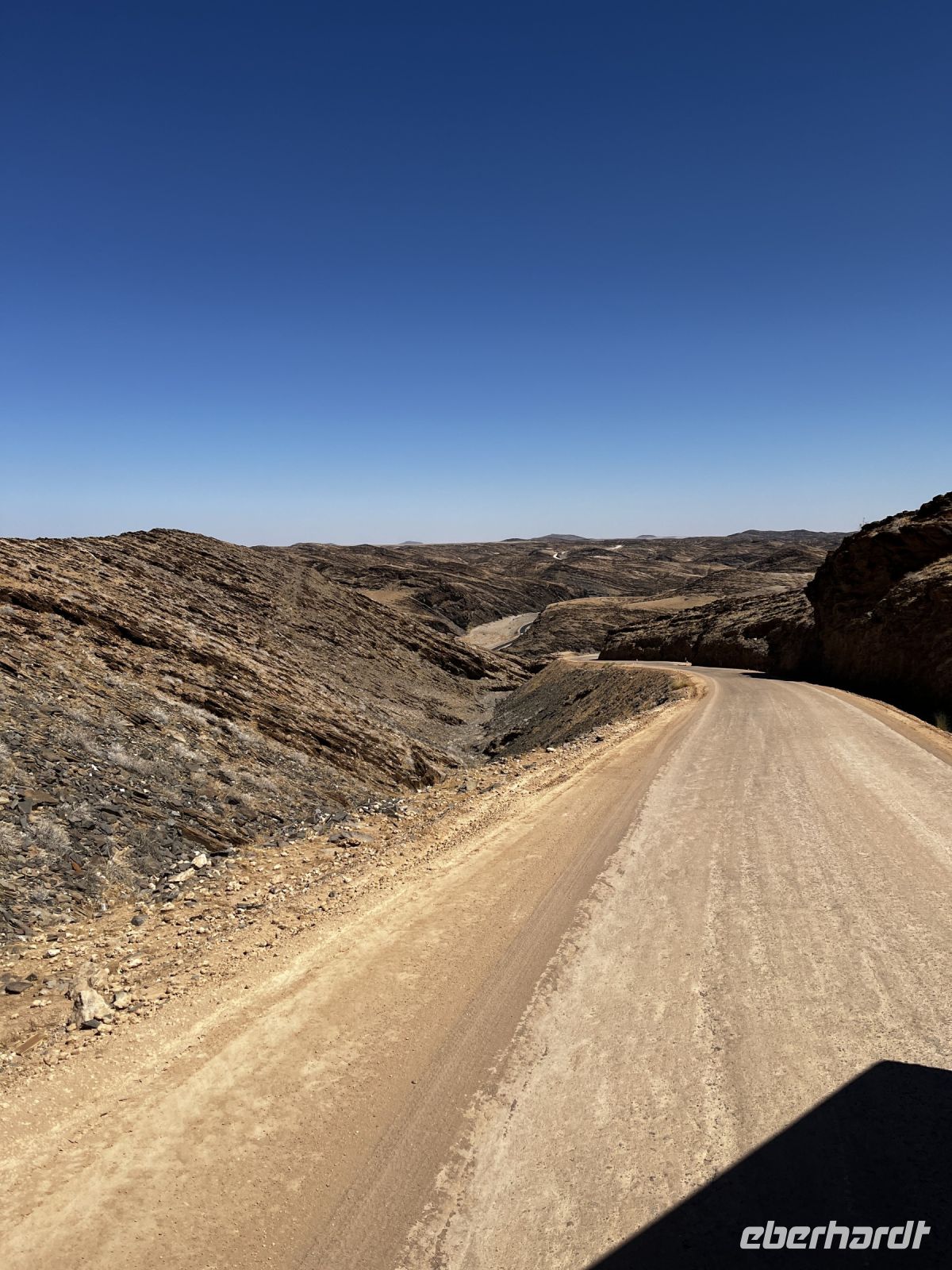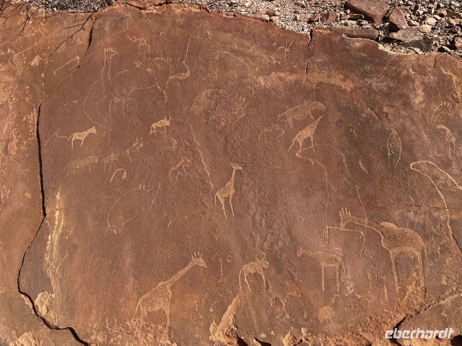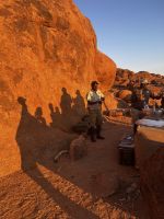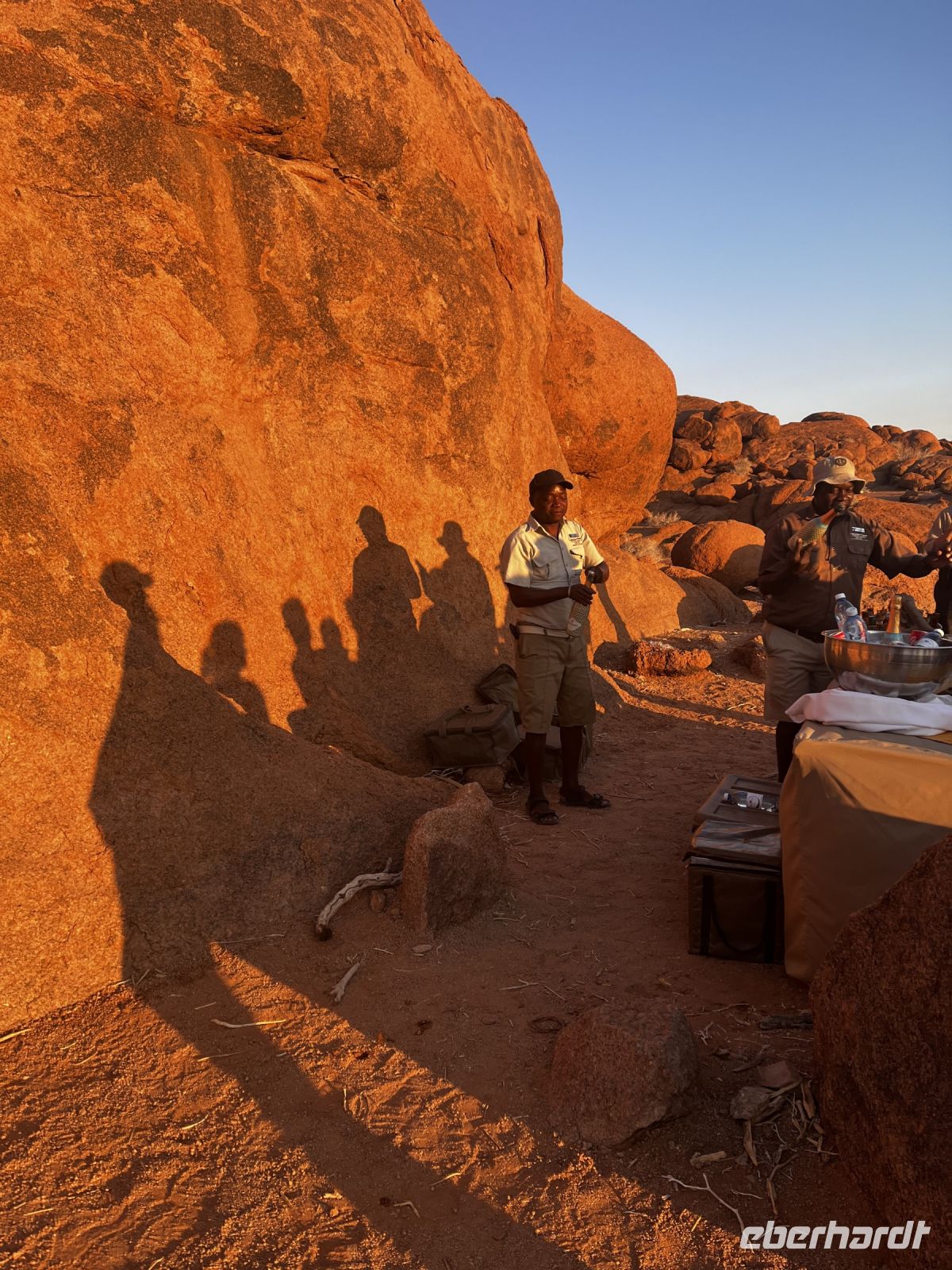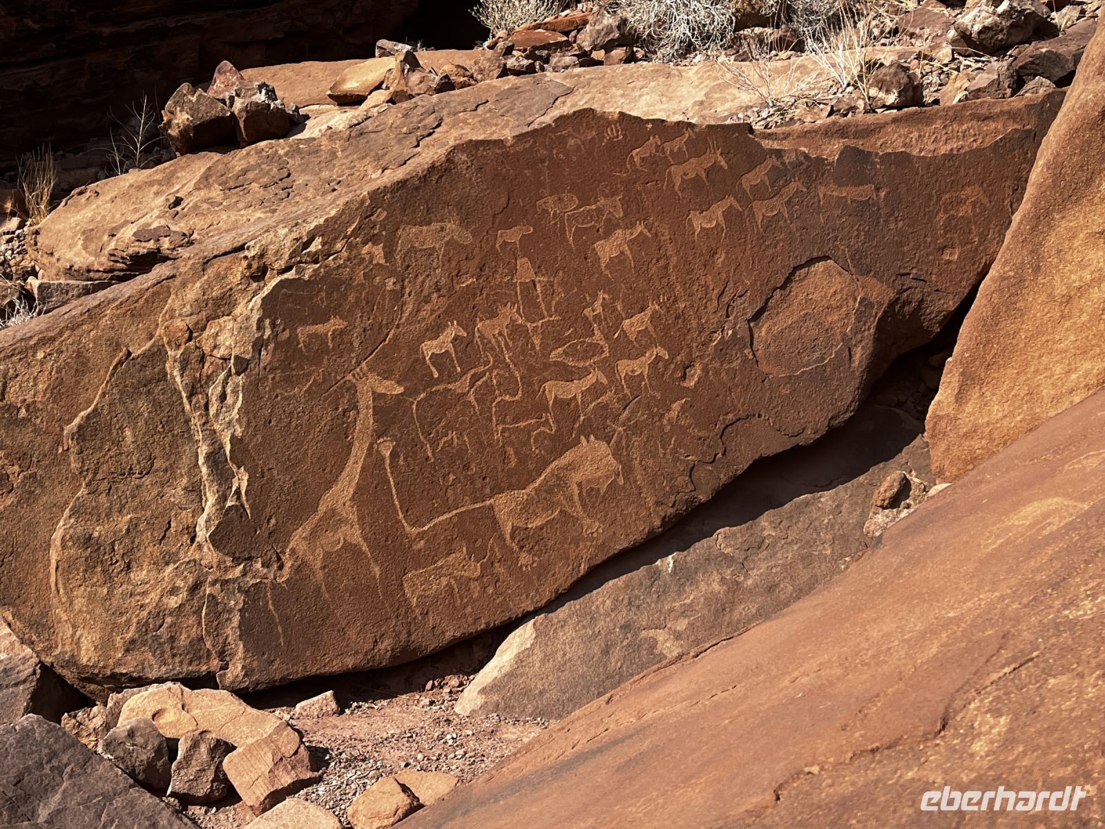 Der heutige Morgen startete ziemlich frisch von den Temperaturen. Deshalb waren viele froh, dass wir der Küste den Rücken zukehrten und ins wärmere Inland fuhren. Vor unserer Abfahrt hatte Joe aber noch ein paar hiesige Musiker organisiert, welche für uns afrikanische Melodien performten. So konnte der Tag gut starten. Zunächst ging es aber die Küstenstraße entlang Richtung Henties Bay. Einen kurzen Fotostopp legten wir am Schiffwrack der Zeilar ein, welche 2008 auf Grund lief. Von Henties Bay drehten wir ins Kernland des Damaravolkes ab und fuhren später entlang des Brandbergmassivs nach Uis. Die Zinnminenstadt bildet wie eine Oase inmitten der kargen Landschaft und vor allem das Café Cactus, wo wir zur Mittagspause einkehrten, brachte Abkühlung. Danach begann der Straßenabschnitt, den Joe gern als Highway to Hell bezeichnet, aufgrund des Pistenzustandes. Aber Joe zeigte auch hier wieder durch sein Fahrerisches Können, dass auch dieses Abschnitt ohne Probleme zu absolvieren war. Sehr gut durchgerüttelt, kamen wir bei unseren nächsten Besichtigungspunkt an, den Twyfelfontain. Diese sind, neben Sossusvlei, UNESCO Weltkulturerbe Namibias. Bei einer Führung durch das felsige Gelände, zeigte uns der Guide die unterschiedlichen Felszeichnungen und erklärte deren Bedeutung. So bekamen wir einen kleinen Eindruck in das Leben vor Tausenden von Jahren hier in der Region. Ein gutes Stück hatten wir noch vor uns bis zur nächsten Lodge, welche wir am Abend erreichten. Da der Bus nicht hinauf fahren konnte, stiegen wir in Geländefahrzeuge um und wurde auf die Hügelkuppe gefahren, wo die Lodge lag. Da Freitag war, gab es ganz landestypisch das Braai zum Abendessen. Im Anschluss fielen wir alle müde ins Bett.