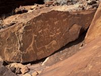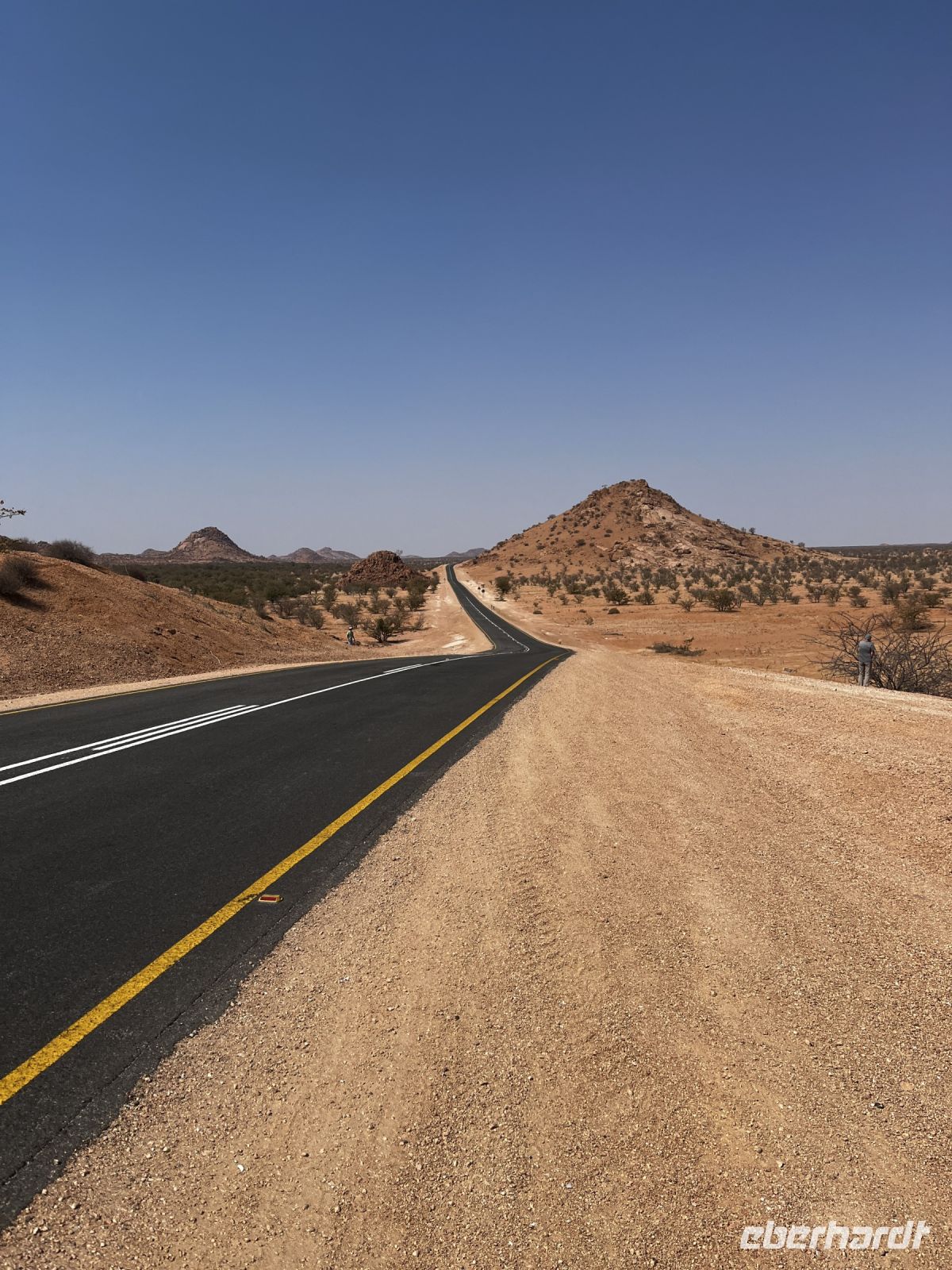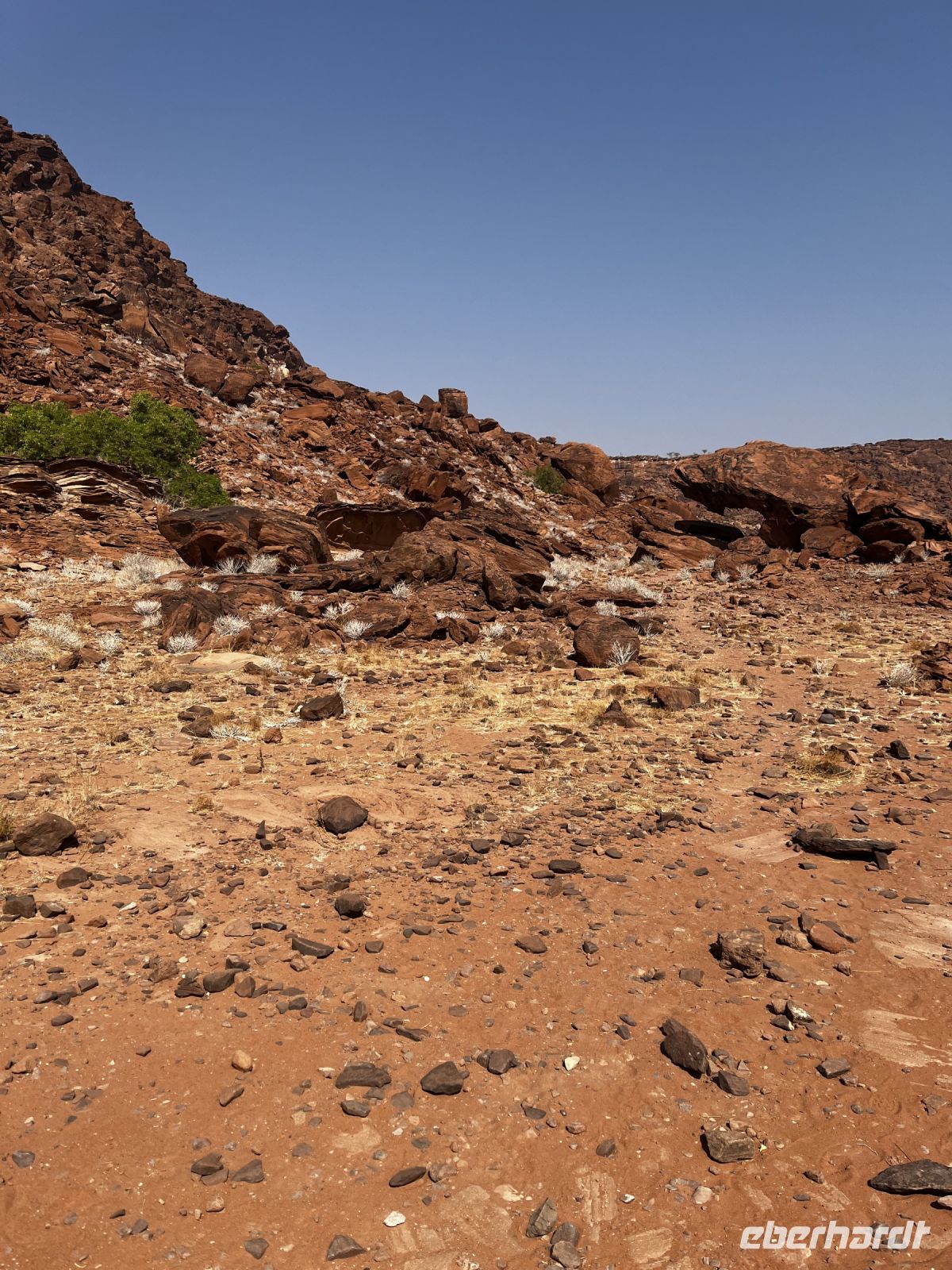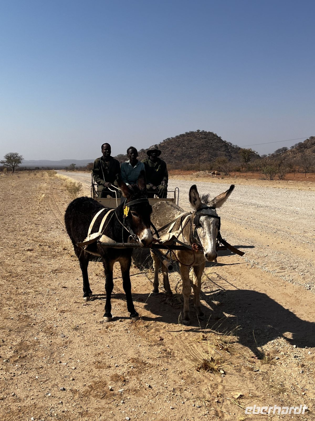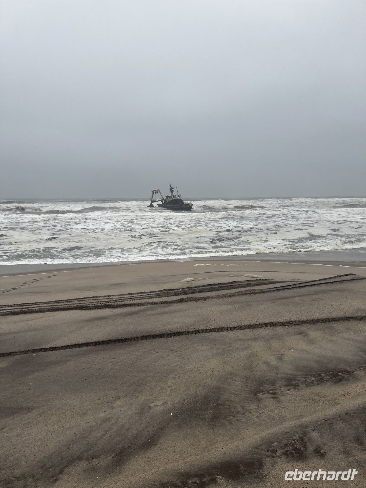 Der heutige Morgen startete ziemlich frisch von den Temperaturen. Deshalb waren viele froh, dass wir der Küste den Rücken zukehrten und ins wärmere Inland fuhren. Vor unserer Abfahrt hatte Joe aber noch ein paar hiesige Musiker organisiert, welche für uns afrikanische Melodien performten. So konnte der Tag gut starten. Zunächst ging es aber die Küstenstraße entlang Richtung Henties Bay. Einen kurzen Fotostopp legten wir am Schiffwrack der Zeilar ein, welche 2008 auf Grund lief. Von Henties Bay drehten wir ins Kernland des Damaravolkes ab und fuhren später entlang des Brandbergmassivs nach Uis. Die Zinnminenstadt bildet wie eine Oase inmitten der kargen Landschaft und vor allem das Café Cactus, wo wir zur Mittagspause einkehrten, brachte Abkühlung. Danach begann der Straßenabschnitt, den Joe gern als Highway to Hell bezeichnet, aufgrund des Pistenzustandes. Aber Joe zeigte auch hier wieder durch sein Fahrerisches Können, dass auch dieses Abschnitt ohne Probleme zu absolvieren war. Sehr gut durchgerüttelt, kamen wir bei unseren nächsten Besichtigungspunkt an, den Twyfelfontain. Diese sind, neben Sossusvlei, UNESCO Weltkulturerbe Namibias. Bei einer Führung durch das felsige Gelände, zeigte uns der Guide die unterschiedlichen Felszeichnungen und erklärte deren Bedeutung. So bekamen wir einen kleinen Eindruck in das Leben vor Tausenden von Jahren hier in der Region. Ein gutes Stück hatten wir noch vor uns bis zur nächsten Lodge, welche wir am Abend erreichten. Da der Bus nicht hinauf fahren konnte, stiegen wir in Geländefahrzeuge um und wurde auf die Hügelkuppe gefahren, wo die Lodge lag. Da Freitag war, gab es ganz landestypisch das Braai zum Abendessen. Im Anschluss fielen wir alle müde ins Bett.