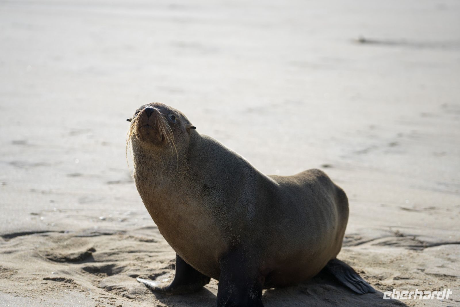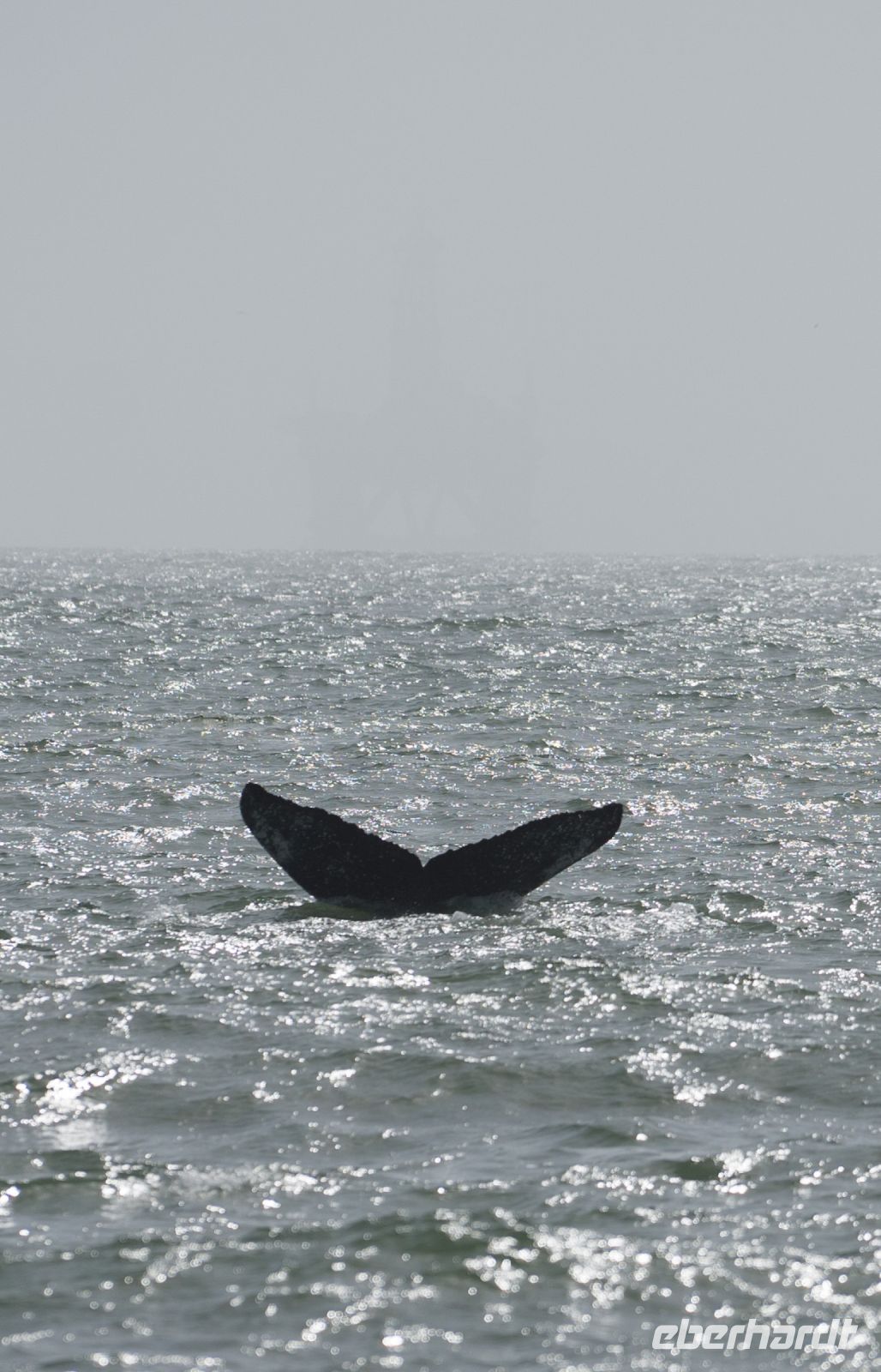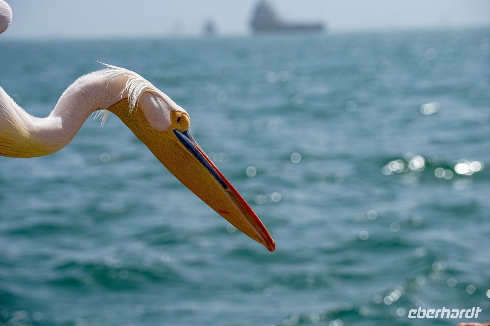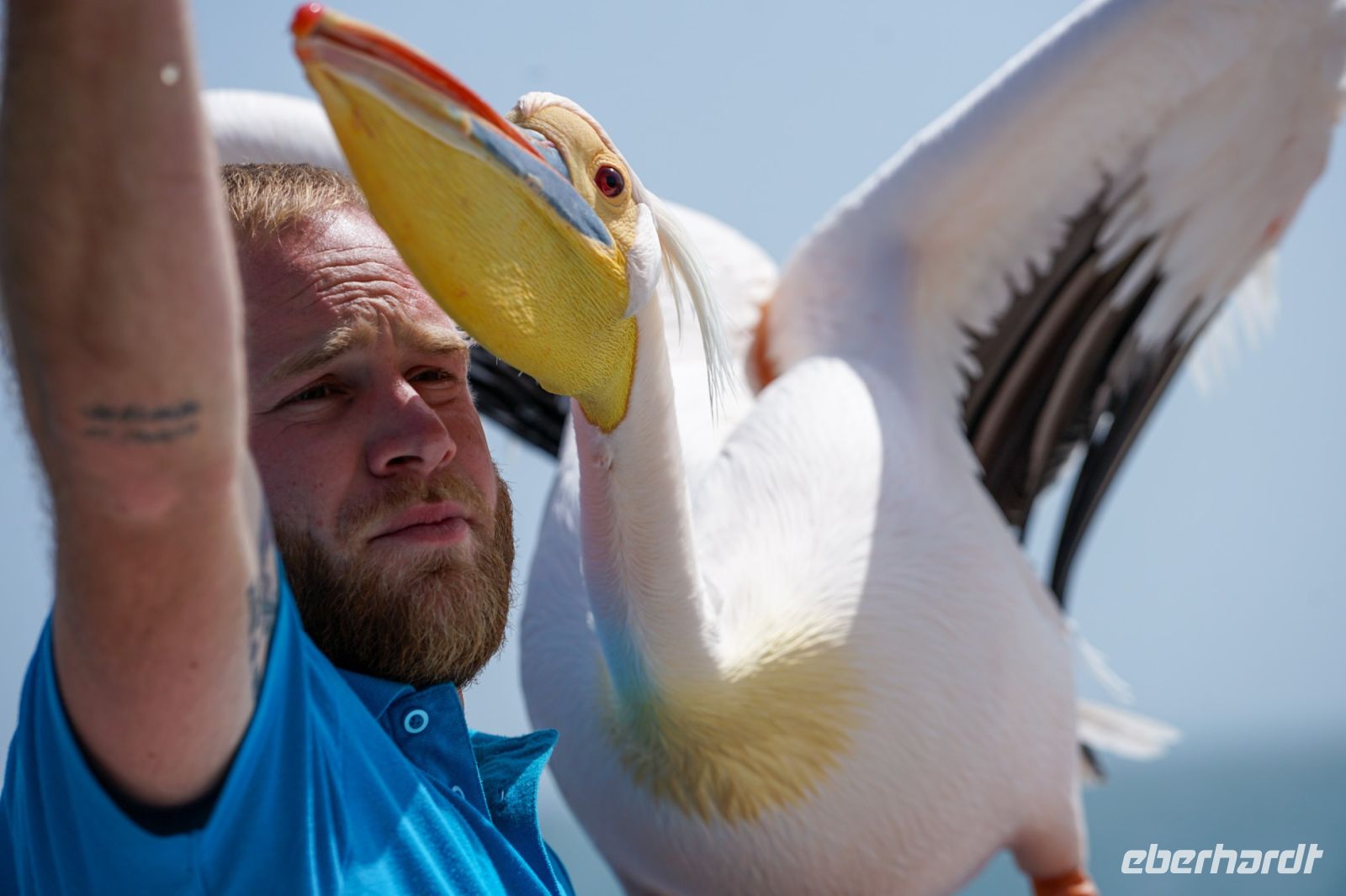 Mit etwas Nebel fuhren wir heute morgen nach Walvis Bay. Die etwa 40 km entfernte Küstenstadt beherbergt den größten Hafen Namibias und ist Startpunkt vieler Ausflüge. Zwei davon durften wir heute erleben. Als erstes ging es mit dem 50 Tonnen Katamaran Silversand auf den Atlantik. Die Bucht beheimatet eine Vielzahl maritimer Lebewesen. Gut eingehüllt in warme Decken, ging es auf die noch kühle See hinaus. Bootsguide Mirko erklärte uns die einzelnen Meeresbewohner, die man antreffen könnte. Als erstes steuerten wir die Austernfarmen an. Diese sind zwar nicht einheimisch hier, aber werden zahlreich produziert und sollen mit zu den besten weltweit gehören. Bevor wir aufs offene Meer fuhren, statteten wir den Robbenkolonien auf der Landzunge einen Besuch ab. Diese empfingen uns schon von weiten mit lauten Rufen. Auf dem offenen Meer angekommen begaben wir uns auf die Suche nach Walen und Delfinen. Die ersten großen Tümmler ließen nicht lang auf sich warten, zogen aber zügig von dannen. Dann kamen die Buckelwale. Mehre Exemplare kreuzten unseren Weg, zeigten aber immer nur den Rücken. Kurz bevor wir die Rückfahrt antreten wollten, tauchte einer noch ab und zeigte seine majestätische Schwanzflosse. Auf der Rückfahrt wurden wir ins Innere und Heck des Katamarans gebeten. Dort wurden uns neben Sekt und Austern, eine Vielzahl von Leckereien kredenzt. Umrandet wurde dies von einer kleinen Fütterung oder vielmehr schon Show durch Guide Mirko und seine tierischen Begleiter Robby und Lady Gaga. Glücklich kamen wir im Hafen an. Aber Joe hatte noch etwas mit uns vor, denn es sollte noch schöner werden. Ein paar Minuten vom Hafen entfernt, stiegen wir in mehrere Allradfahrzeuge um. Hier startete unsere Tour, die man laut Joe nicht wirklich beschreiben kann, sondern erleben muss. Dennoch versuche ich es einmal. Es ging los mit den hiesigen Erdbeerhühnern oder für uns besser bekannt als Flamingos. Weiter fuhren wir zu den nahegelegenen Salzwerken, welche einen großen wirtschaftlichen Faktor in der Region ausmachen. An der Küste am Strand entlang fuhren wir wieder in den Namib-Nauckluft-Park zu den Dünen von Sandwich Habour. Hier sollte der Spaß richtig losgehen. Düne auf und Düne herab sausten die Guides mit uns durch dieses traumhafte Landschaft. Wie Achterbahn fahren, nur in einem riesigen Sandkasten. Kurz verschnaufen, hieß es an dem Ort, wo Düne und Meer aufeinander treffen. Dazu noch ein kleines Buffet und leckere Getränke. Weiter ging die Post durch die Dünen. Was für ein Spaß. Irgendwann mussten wir leider den Rückweg antreten, doch auch da traten noch ein paar Überraschungen auf. Zwischen den Dünen tauchten mehrere Oryx samt Nachwuchs sowie Springböcke auf. In Walvis Bay zurück, schwelgten wir schon in Erinnerungen des Tages. Am Abend genossen wir im gelobten Restaurant the Tug in Swakopmund noch ein leckeres Abendessen zum Ausklang.