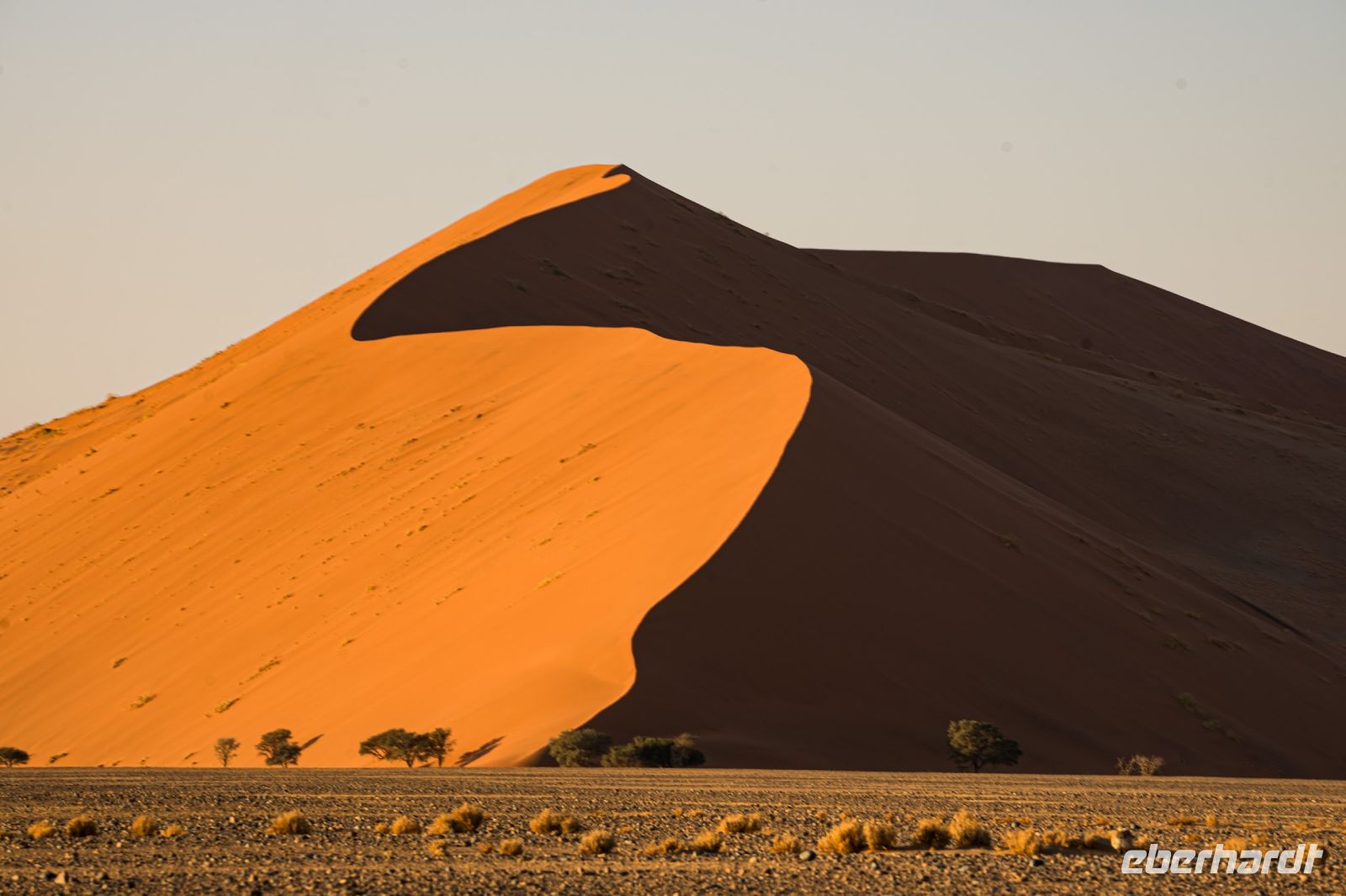 Besonders zeitig für unsere Verhältnisse ging es heute für uns los, denn wir mussten noch vor Sonnenaufgang am Tor zum Nationalpark sein. Da unsere Lodge direkt am Tor lag, waren wir auch rechtzeitig da und nur die Nummer 22 in der Reihe. Als das Tor geöffnet wurde ging es schnurstracks Richtung Sossusvlei. Zwischendrin legten wir ein paar Stopps ein, um die Dünen beim morgendlichen Licht mit ihren Schattenspiel zu fotografieren. Unter anderem die Düne 36.