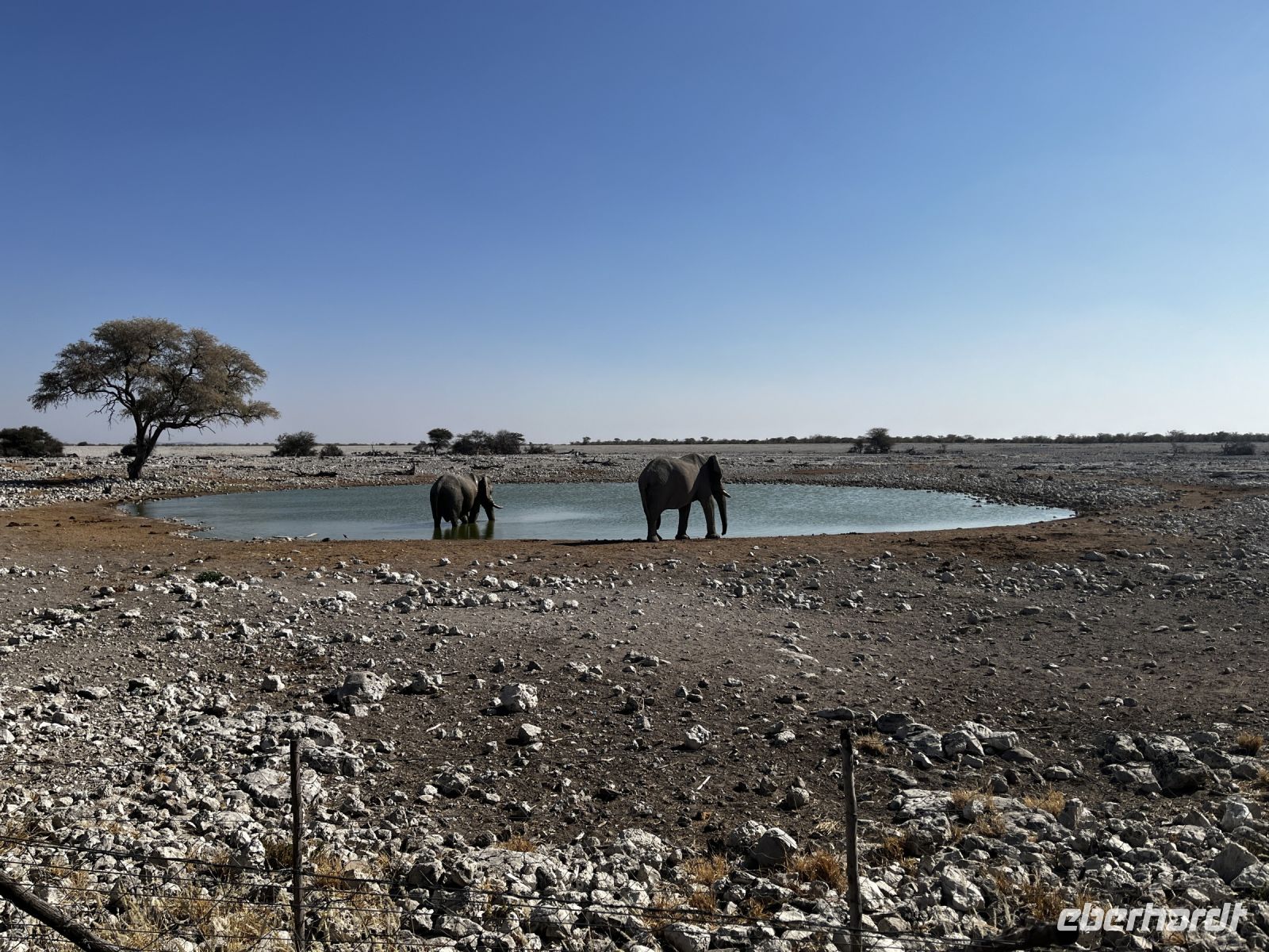 Die zweite Woche unserer großen Namibia Reise brach an und für uns hieß es Abschied nehmen vom Kaokoland. Noch ein letztes Mal in Opuwo tanken und den doch anderen Stil der Stadt mitbekommen, bevor es wieder Richtung Süden fuhren. Der erste Teil der Fahrt verlief ruhig über die geteerte Straße, wodurch wir Energie für den restlichen Tag sammeln konnten. Nach der roten Linie begann am Galton Gate das Abenteuer Etosha für uns. Augen weit aus und Kameras gezückt ruckelten wir langsam über die Piste des westlichen Etosha Nationalpark. Die ersten Bewohner ließen nicht lang auf sich warten. Links und rechts im Gebüsch tauchten ein paar Zebras auf. Die ersten Fotos wurden geschossen. Ein Stück weiter kam dann das nächste Tier, ein selteneres Exemplar. Ein Waran kreuzte die Straße. So schnell wie er im Gebüsch aber verschwunden war, konnte wir nur wenige Bilder ergattern. Vorbei an einigen Impalas, kam plötzlich der Ruf: Elefanten. Und da waren sie, die großen grauen Dickhäuter. Eine ganze Familie mit Jungtieren. Durch Joes Erfahrung konnte er erahnen, wo die Tiere die Straße kreuzten und da war es, dass Postkartenbild mit einer Reihe Elefanten über die Straße laufen. Weiter fuhren wir durch den Park von West nach Mitte West und klapperten die Wasserlöcher ab. Wir sahen: Gnu’s, Zebras, Springböcke und Kuhantilopen. Aber es war sehr windig, die Luft dadurch staubig und die Tiere sehr unruhig. Als letzen Stopp hielten wir am Okaukuejo Wasserloch und da waren sie wieder, zwei Elefanten die tranken und badeten. Der perfekte Moment und wir konnten sie in Ruhe beobachten, bei ihren Handlungen. Danach fuhren wir in unsere nächste Lodge, die Toshari Lodge, um den Abend gemütlich bei guten Essen und den Gedanken an die ersten Erlebnisse im Etosha, ausklingen zu lassen