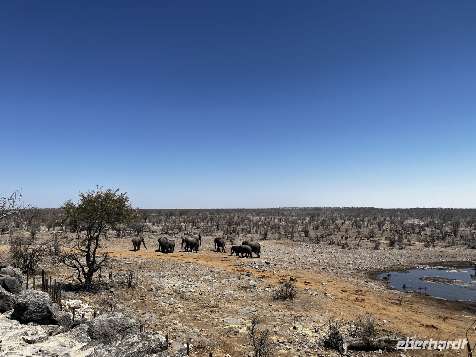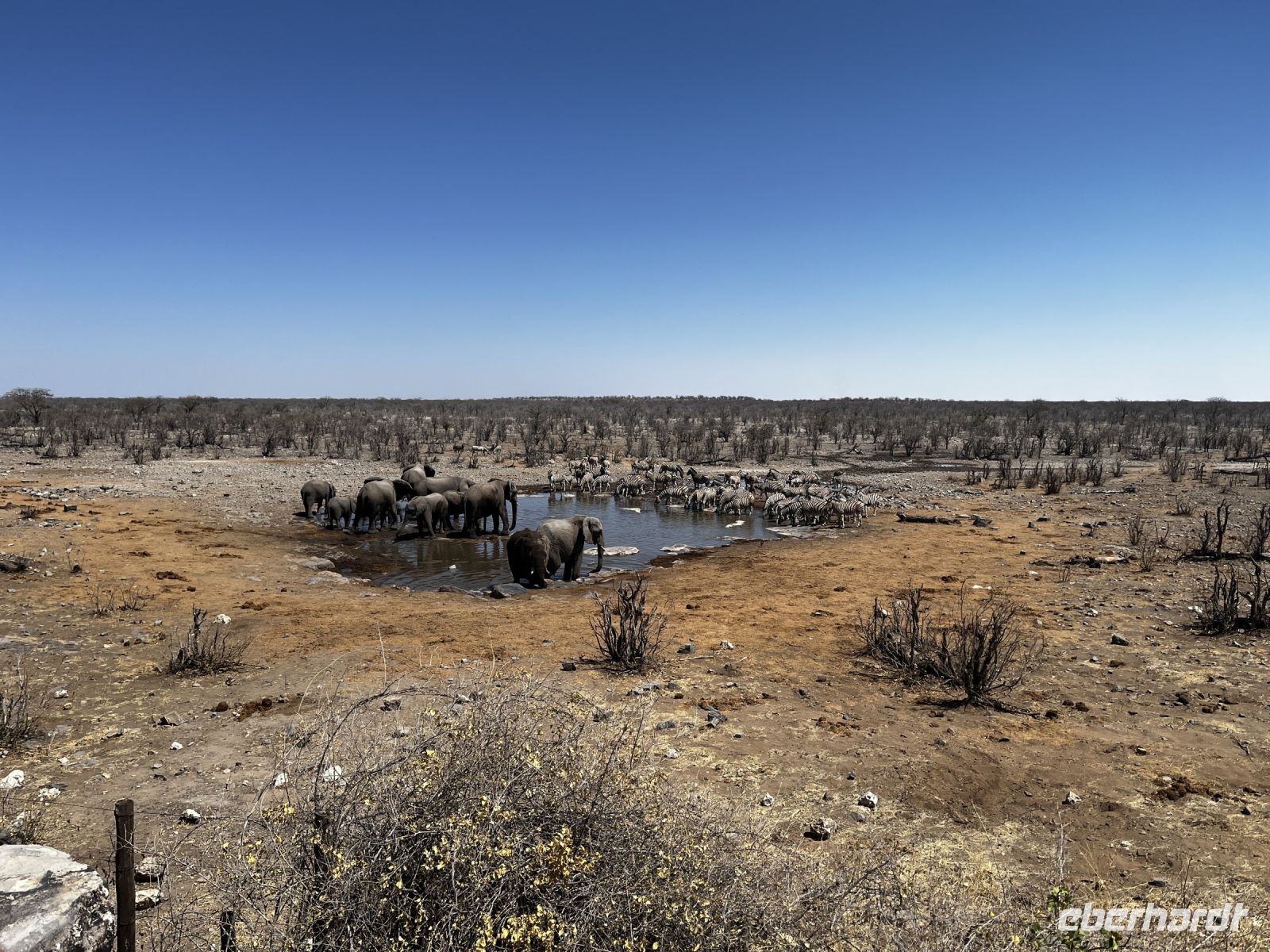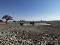 Um die Tiere bestmöglich zu finden und gutes Licht für Bilder zu haben, fuhren wir heute vor Sonnenaufgang los. Erster Stopp war wieder Okaukuejo. Während Joe die Gebühren zahlte und tankte, prüften wir das Wasserloch. Leider waren dieses Mal nur wenige Tiere wie ein paar Oryxe dort. Danach fuhren wir Richtung Ost . Ziel waren die Wasserlöcher, da sich die Tiere dort sammelten in der Trockenzeit. Wir fanden wieder die uns schon bekannten Zebras, Gnu’s und Springböcke in großer Zahl. Ein dennoch schönes Bild. Joe steuerte aber zielstrebig das Wasserloch bei Aus an, da er einen Insidertip erhalten. Und er behielt recht. Denn durch einen toten Elefanten sammelten sich hier ein paar Tüpfelhyänen und im Gebüsch, kaum zu erkennen lagen gut versteckt Löwen. Nachdem die Hyänen vom Wasser verschwunden waren, kamen auch wieder andere Tiere wie ein Warzenschwein. Zur Mittagspause fuhren wir nach Halali. Hier ist auch ein Wasserloch, welches man zu Fuß erreichen kann. Da waren sie wieder. Eine Familie von Elefanten beim Bad umringt von Zebras und Springböcken. Leider zog die Familie nach wenigen Minuten schon ab. Aber ein einzelnes Tier kam zurück und präsentierte uns eine Show. Von Halali fuhren wir wieder zurück nach Mitte West zum Andersson Gate. Bevor wir den Park aber verließen, bog Joe kurz zu einem Wasserloch ab. Und wieder der richtige Riecher. Denn hier Stand eines der seltenen Spitzmaulnashörner. Etwa 5300 Exemplare gibt es nur noch in ganz Afrika und wir konnten eines beobachten beim dösen. Mit diesem tollen Abschluss verließen wir den Park, um in der Lodge etwas zu entspannen.