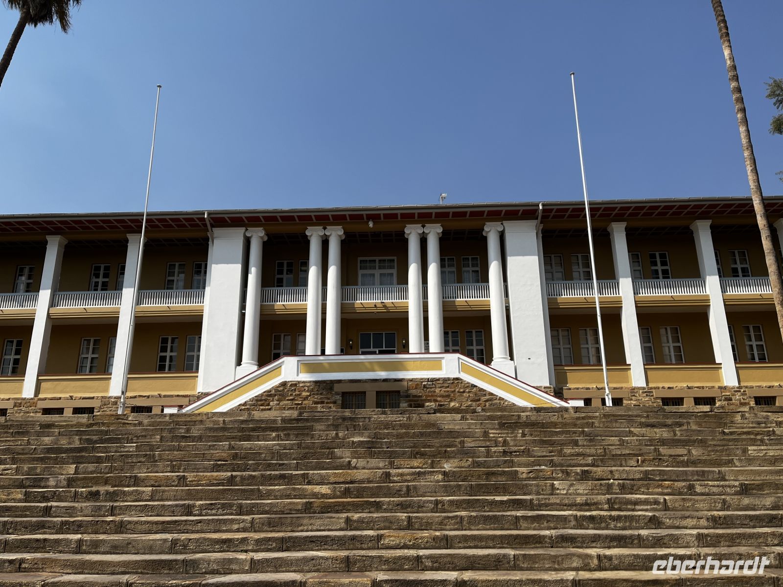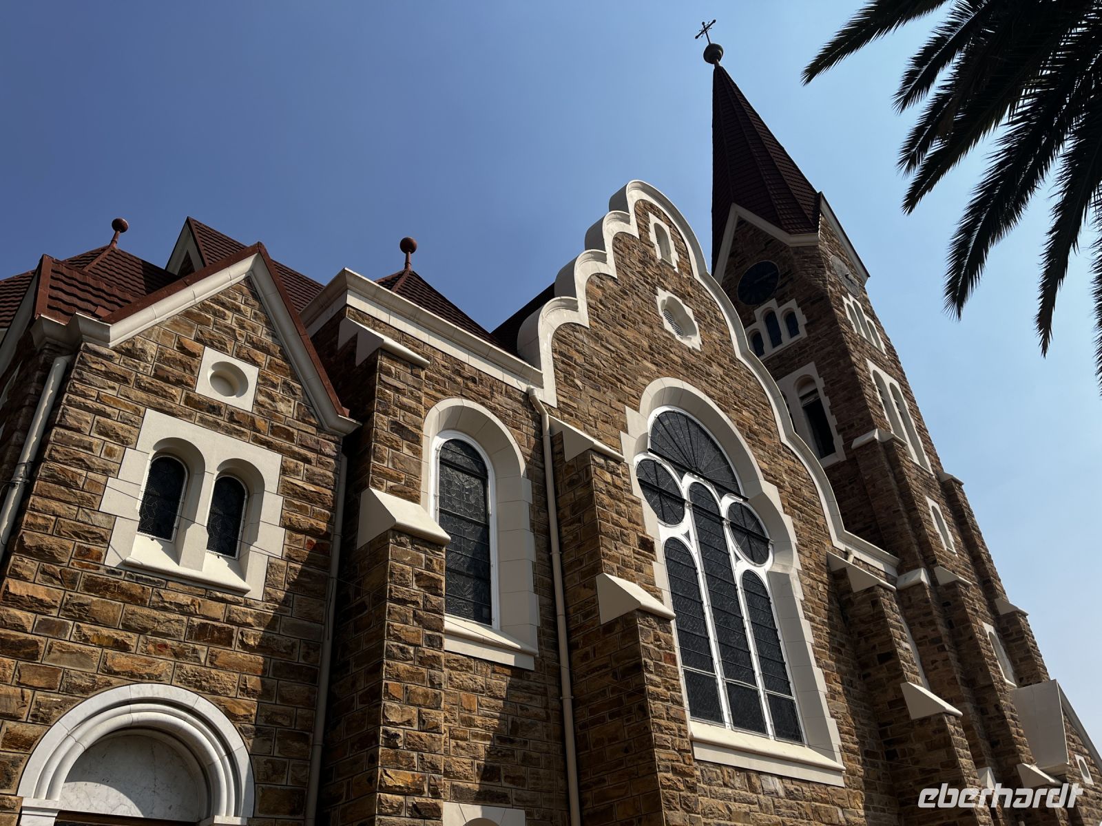 Ganz entspannt startete unser letzter Tag in Namibia. Gemütlich gefrühstückt, die Koffer eventuell nochmal umgepackt und die traumhafte Aussicht über die Stadt genossen. Dann holte uns Joe ab und wir fuhren zu unserer kleinen Stadtrundfahrt. Zunächst ging es nach Katutura, das Armenviertel Windhoeks. Hier sah man die andere Seite Namibias nochmal deutlich. Die Stimmung im Viertel war aus gelassen und es wurde gegrillt, da Sonntag war. Manchmal auch auf einen Einkaufswagen. Joe erklärte uns aber, dass nicht jeder der hier lebte Arm sei, sondern das Leben in den Hütten bevorzugte. So sah man teilweise teure PKW vor den Blechhütten. Wir besuchten auch ein soziales Frauenprojekt. Hier wird durch Arbeit an Kleidung und Schmuck aus recycelten Materialien, behinderten Frauen eine Möglichkeit für ein selbstbestimmtes Leben zu geben. Eine wirklich tolle Sache. Dann fuhren wir zurück ins Stadtzentrum und machten zunächst eine Bierverkostung mit kleiner Führung im Roof of Afrika. Hier wird das Bier nach deutschen Vorgaben gebraut und wir konnten einige Sorten davon probieren. Dazu wurde eine Wurstplatte aus hauseigener Produktion gereicht. Gut angeheitert fuhren wir zu den Sehenswürdigkeiten Windhoeks, wie dem Tintenpalast, der Christuskirche, der alten Festung und das Nationalmuseum, welches liebevoll Kaffeemühle genannt wird. Bevor es zum Flughafen ging, machten wir einen letzten Stopp am Bahnhof von Windhoek, wo man noch alte Züge bestaunen kann und dann hieß es schon Abschied nehmen von Namibia und Joe, welches uns so gut, durch das Land gebracht hatte.