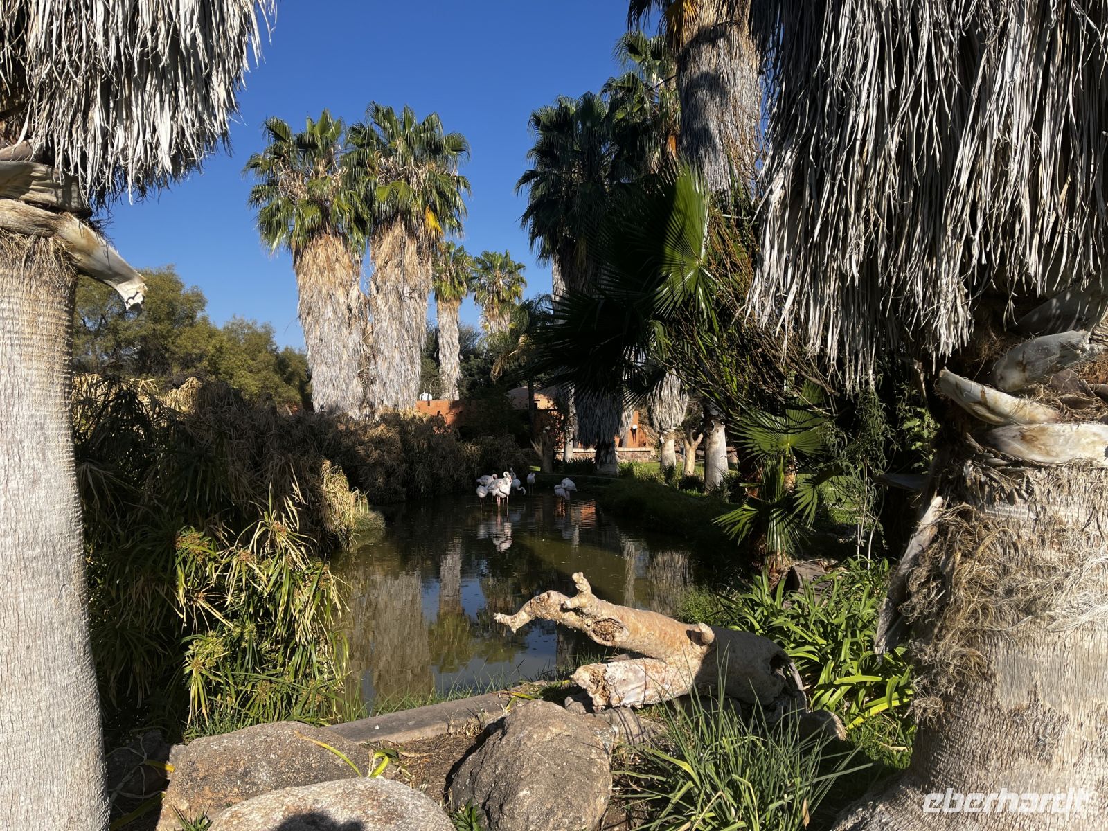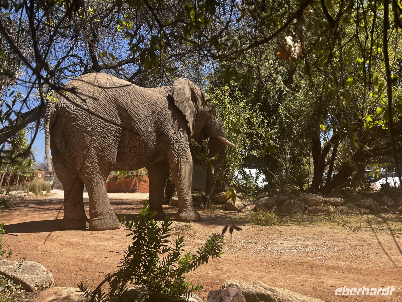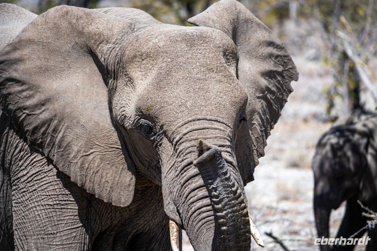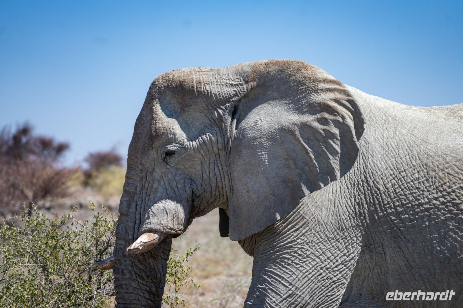 Koffer gepackt, gefrühstückt und auf ging es wieder in den Etosha Nationalpark. Kurz nach Einfahrt in den Park, bekamen wir einige Giraffen sehr nah zu sehen. Aber leider liefen diese immer direkt weg, um einen gewissen Abstand zum Bus zu halten. Es sollten aber nicht die letzten sein, wie sich noch herausstellte. Bis kurz vor Halali gab es überraschenderweise sehr wenige Tiere zu sehen. Doch plötzlich standen sie da. Mitten im Gebüsch am Straßenrand eine ganz Familie Elefanten. Wir waren die ersten vor Ort und hatten damit den VIP Platz. Während diese friedlich die Blätter der Bäume und Sträucher fraßen, machten wir ein Bild nach dem anderen und genossen den Anblick. Wieder mal ein wunderbares Erlebnis. In Halali angekommen liefen wir wieder zum bekannten Wasserloch. Zunächst waren bis auf einige Zebras und Impalas zusehen. Doch von weitem näherte sich schon gemächlich ein Elefantenbulle. Die anderen Tiere machten Platz als er das Wasserloch betrat, um zunächst zu trinken und dann uns eine Vorstellung zu geben, wie im Buche. Man kann es gar nicht beschreiben, was er alles machte. Pünktlich nach einer halben Stunde trabte er nach Verabschiedung wieder in die Weite an, als wäre er genau dafür bestellt wurden. Nun ging es für uns tiefer in den Osten des Etosha, genauer weiter zum Lookout, wo man ein Stück in die Etoshapfanne fahren kann. Und hier war wirklich viel von nichts. Endloses weiß soweit das Auge schauen konnte. Besondere Fotos mit optischen Täuschungen wurden hier gemacht. Entlang der Pfanne fuhren wir da und Joe sagte uns, dass hier gerne mal die seltenen weißen Elefanten zu sehen sein. Kaum gesagt erschien schon genau ein Exemplar von diesem. Ein großer Bulle kreuzte den Weg und wir konnten ganz besondere Bilder machen. Entlang der sogenannten Giraffenallee, wo rechts und links zahllose Giraffen am Straßenrand zu beobachten waren, verließen wir den Park durch das Von Lindequist Tor, um direkt an diesem in unsere nächste Lodge einzuchecken. Die Mokuti Lodge bietet ein riesiges Areal mit zahlreichen Möglichkeiten und wir konnten eine Nacht wie im Paradies verbringen.