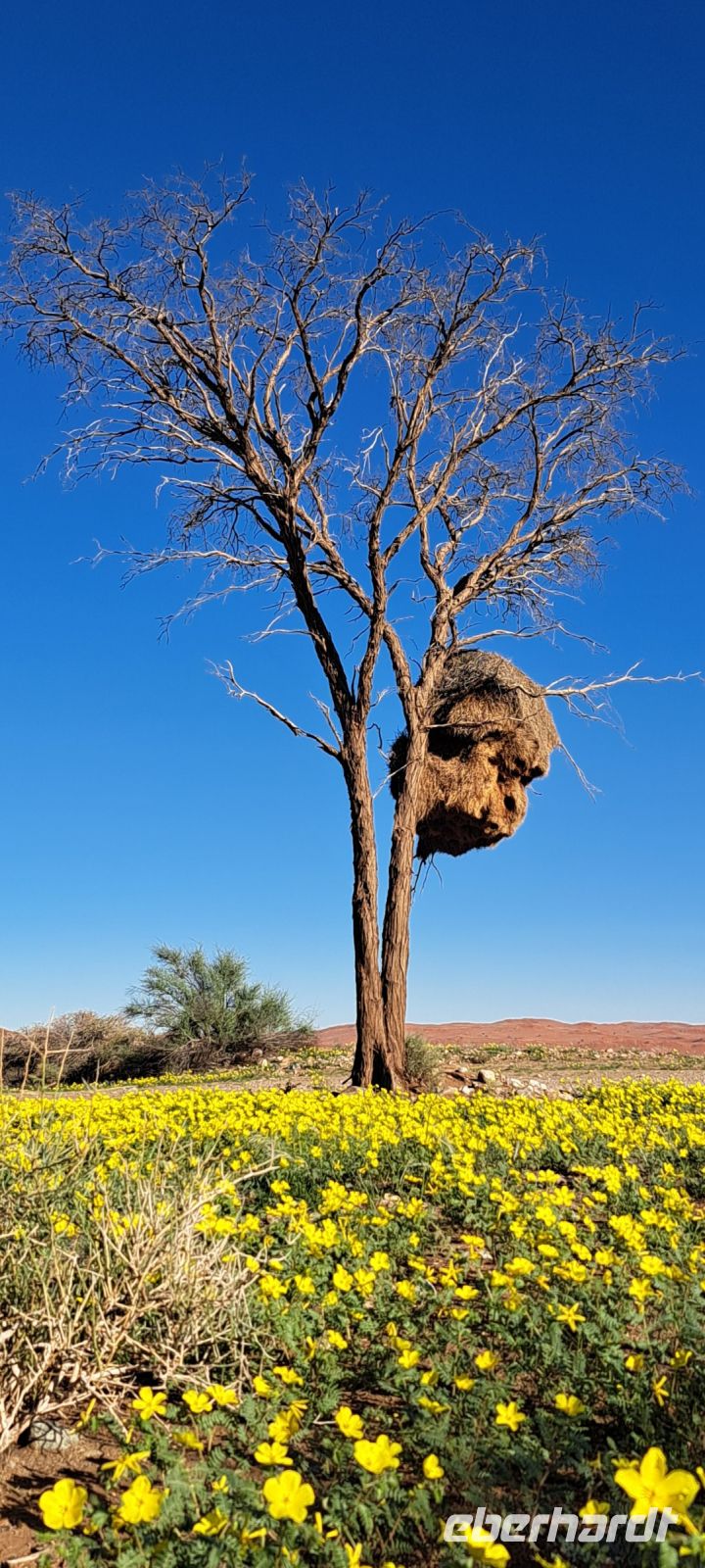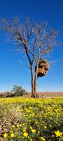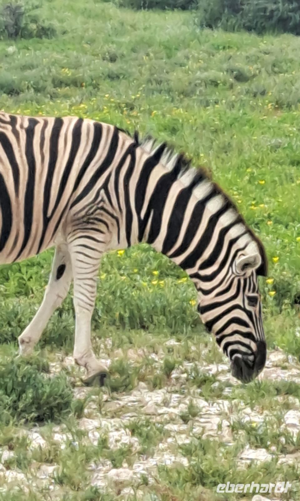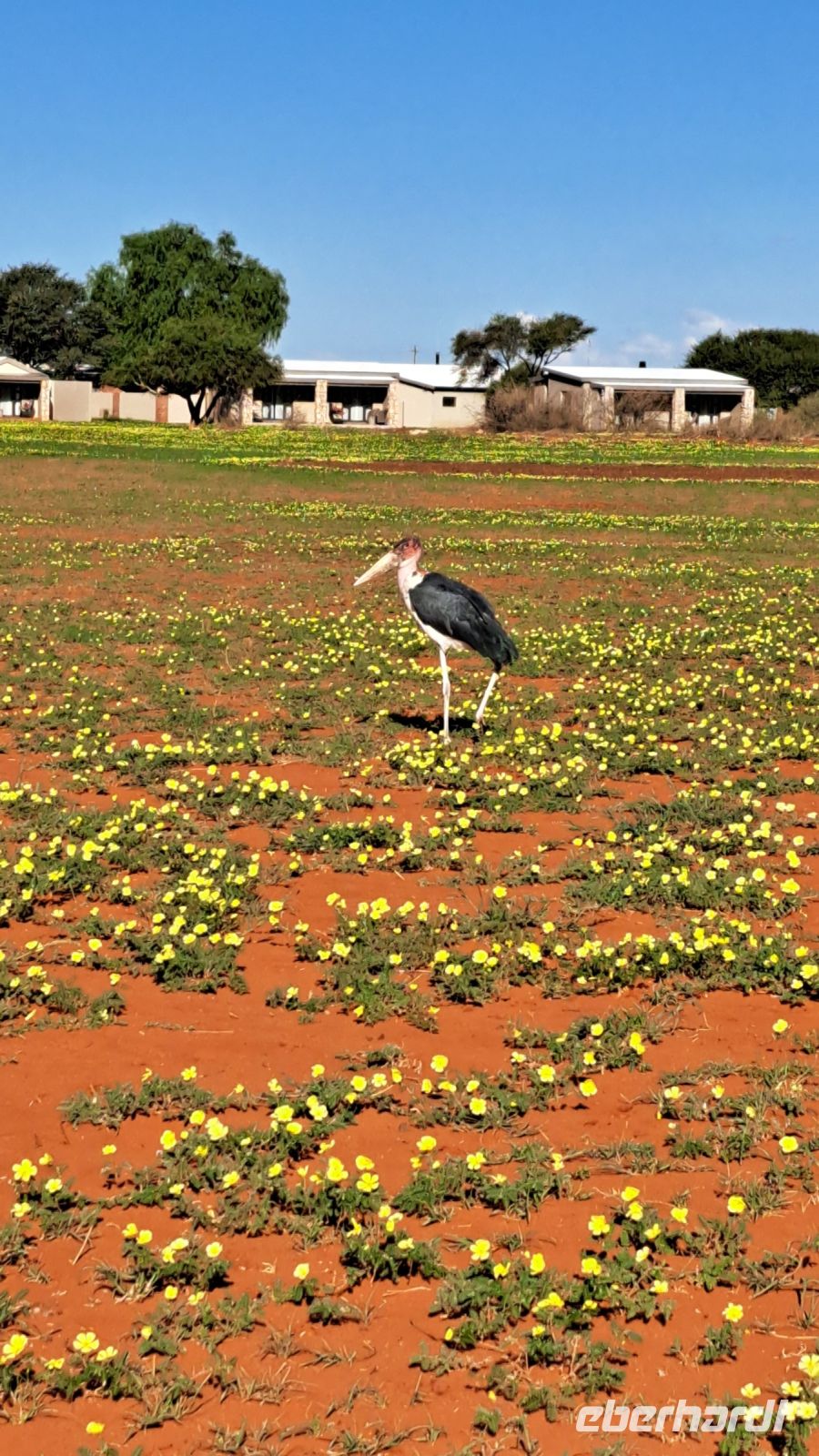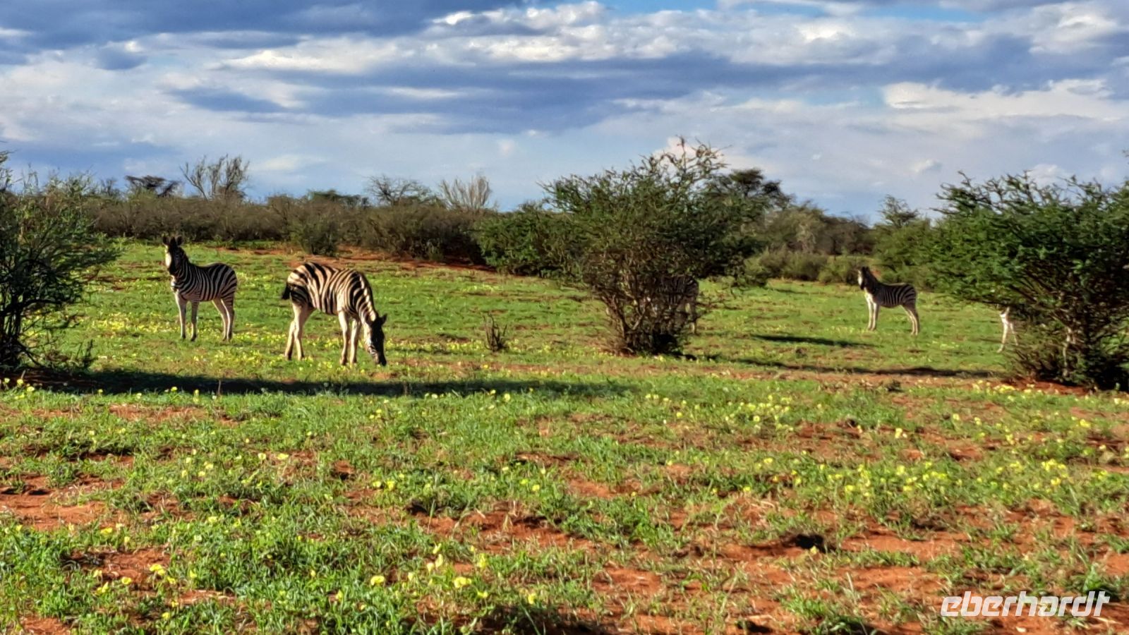 Die Landschaft ist ungewohnt bunt – überall blühen gelbe Wildblumen und verwandeln die trockene Savanne in ein leuchtendes Farbenmeer. Das viele Regenwasser hat die Landschaft verwandelt. Unterwegs begleiten uns unzählige Springböcke und Zebras, die in großen Herden über die Savanne ziehen.
