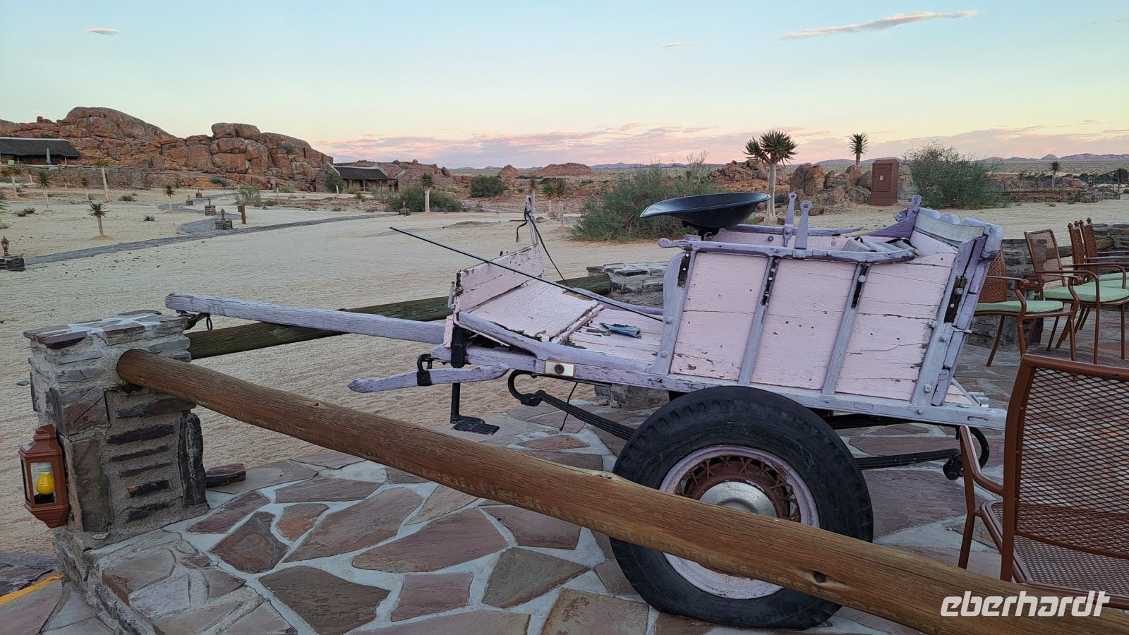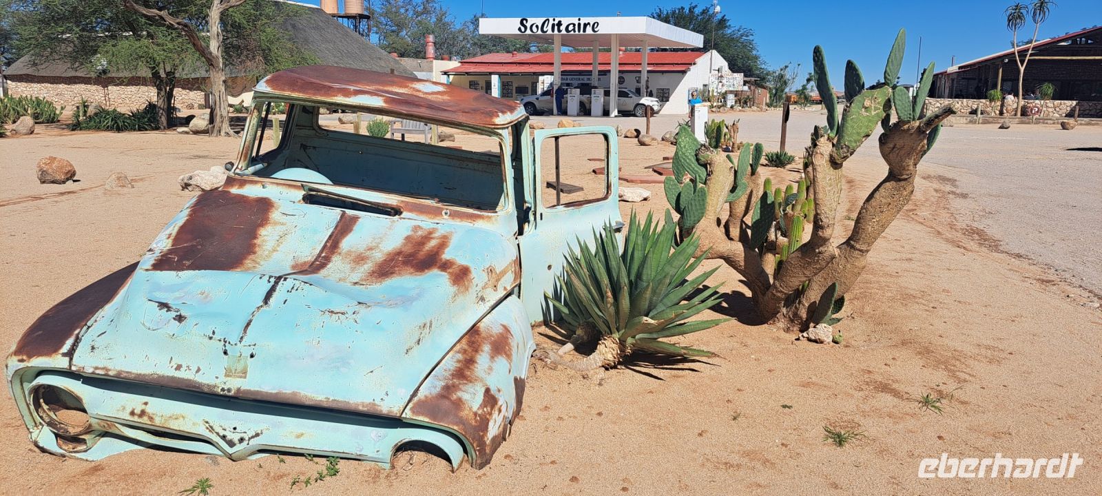 Ein weiterer kurzer Halt am Canyon Roadhouse bringt uns zurück in die Welt der klassischen Roadtrip-Romantik. Alte, rostige Autos stehen dekorativ in der Wüstenlandschaft herum, und das Diner versprüht den Charme einer Route-66-Tankstelle – nur eben mitten in Namibia.