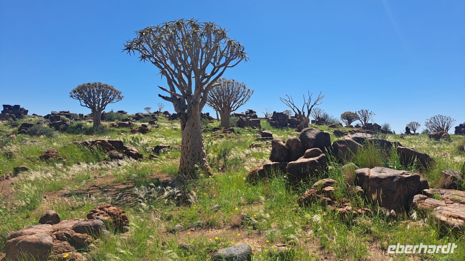 Die Strecke führt uns erst einmal weiter südlich, und die Landschaft beginnt sich zu verändern: Die roten Dünen weichen felsigem Terrain, und bald erreichen wir den Köcherbaumwald. Diese uralten Aloen, manche über 500 Jahre alt, stehen wie stumme Wächter in der kargen Landschaft. Direkt drumherum sehen wir den Spielplatz der Riesen, ein faszinierendes Labyrinth aus riesigen Dolerit-Felsen, die wirken, als hätte ein Riese sie hier wie Bauklötze gestapelt.