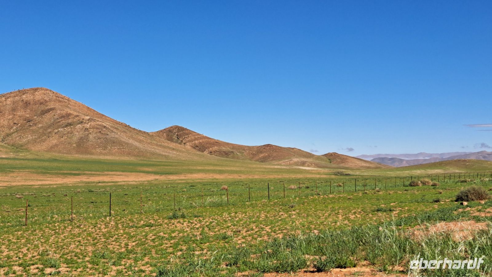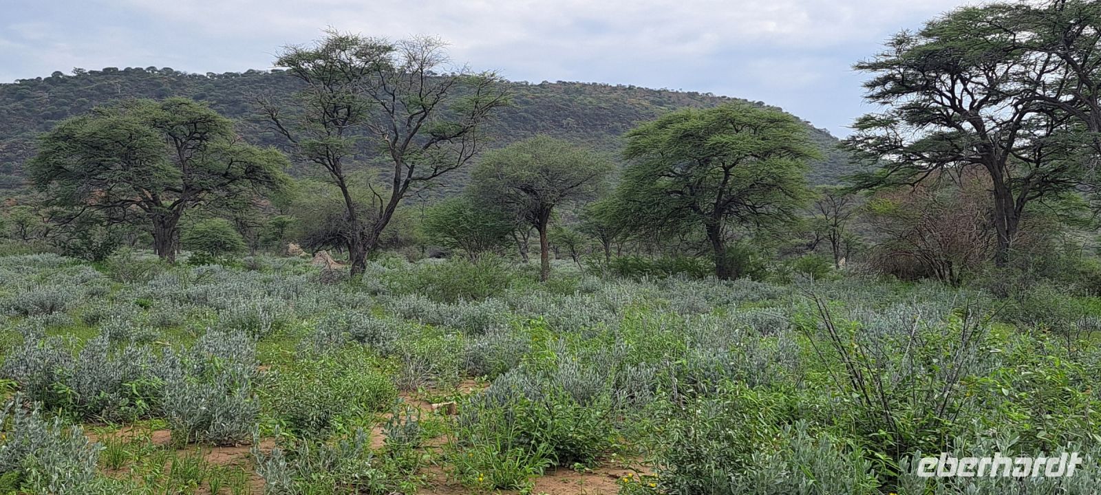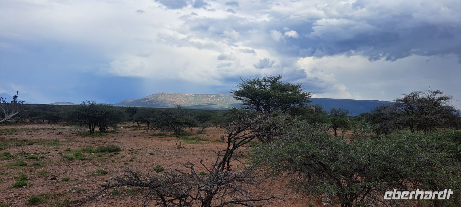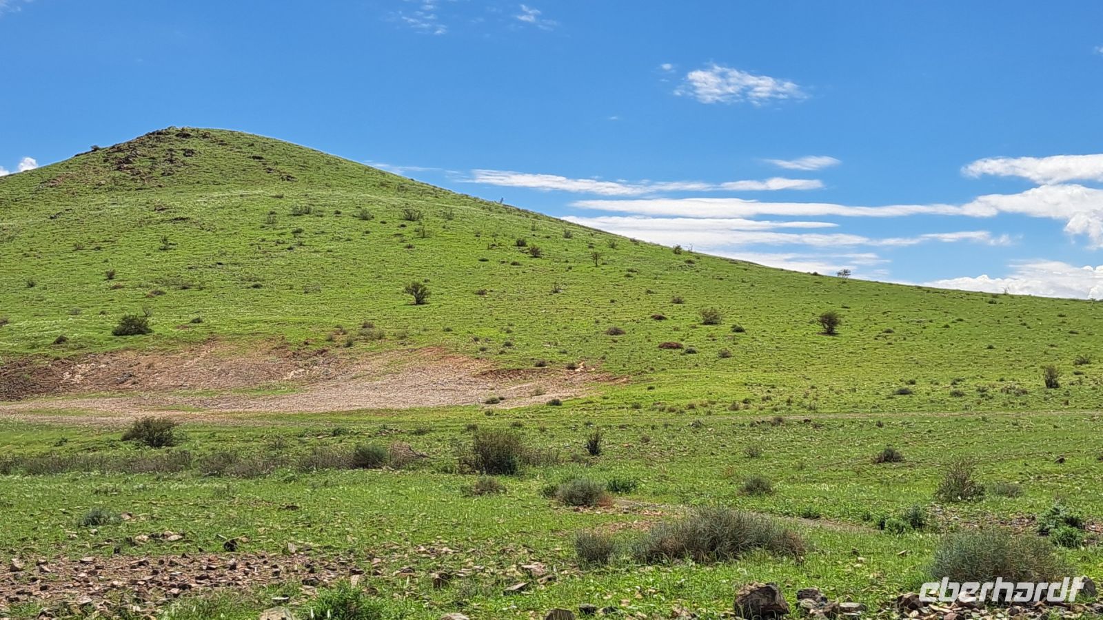 Dann erreichen wir die Tirasberge, die sich spektakulär aus der weiten Ebene erheben. Doch das wirklich Beeindruckende ist die Farbe der Landschaft: Überall sattes Grün! Das Gras steht hoch, der Boden ist feucht, und die Luft ist erfüllt von einem Duft, den man kaum beschreiben kann – frisch, erdig, lebendig. So sieht man die Namib nur selten!
