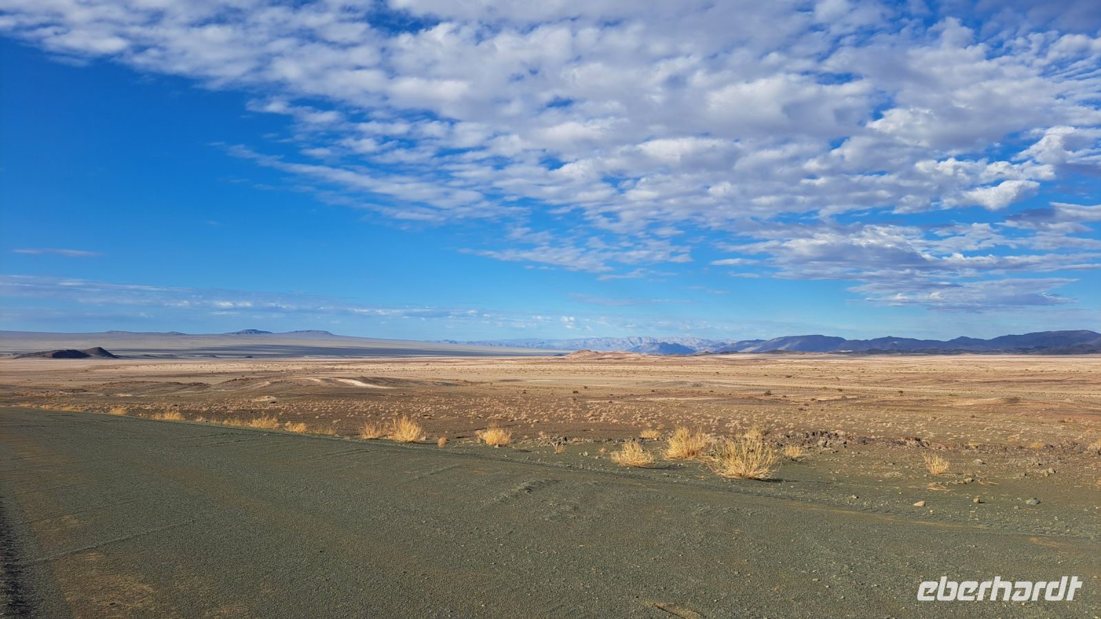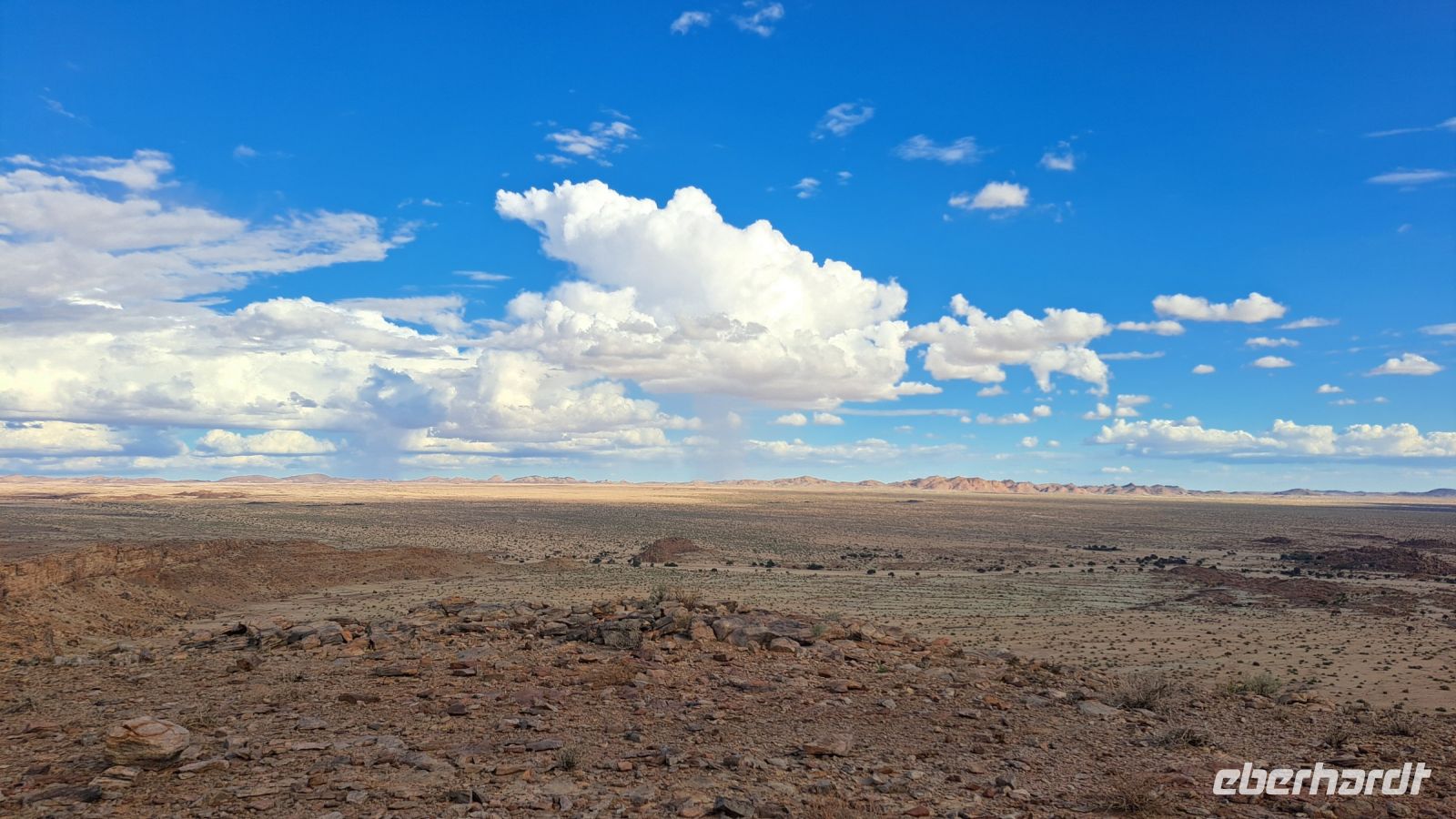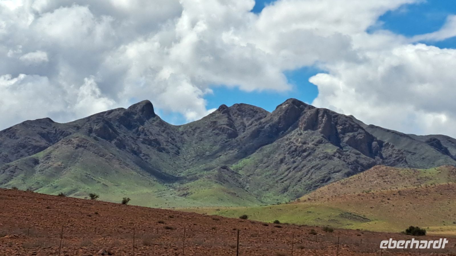 Dann erreichen wir die Tirasberge, die sich spektakulär aus der weiten Ebene erheben. Doch das wirklich Beeindruckende ist die Farbe der Landschaft: Überall sattes Grün! Das Gras steht hoch, der Boden ist feucht, und die Luft ist erfüllt von einem Duft, den man kaum beschreiben kann – frisch, erdig, lebendig. So sieht man die Namib nur selten!
