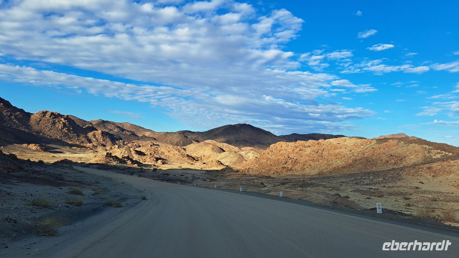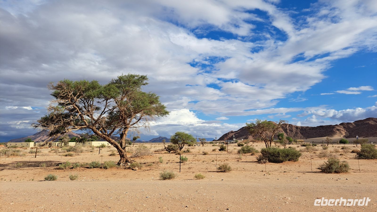 Heute starten wir gemütlich in den Tag, bevor es auf die abenteuerliche Strecke Richtung Sesriem geht. Unser Guide hat nicht zu viel versprochen: Die Straße ist eine Herausforderung! Dank der Regenfälle der letzten Tage erwartet uns eine African Massage at its best – tiefe Spurrillen, schlammige Passagen und trockene Flussbetten voller Geröll und sogar mit etwas Wasser, die unser Landcruiser Dank Jaco mit Bravour meistert.