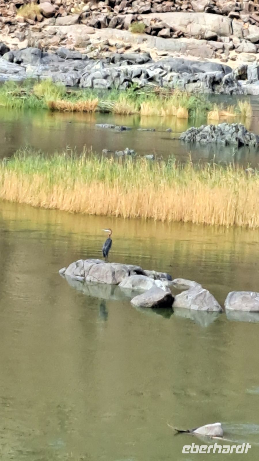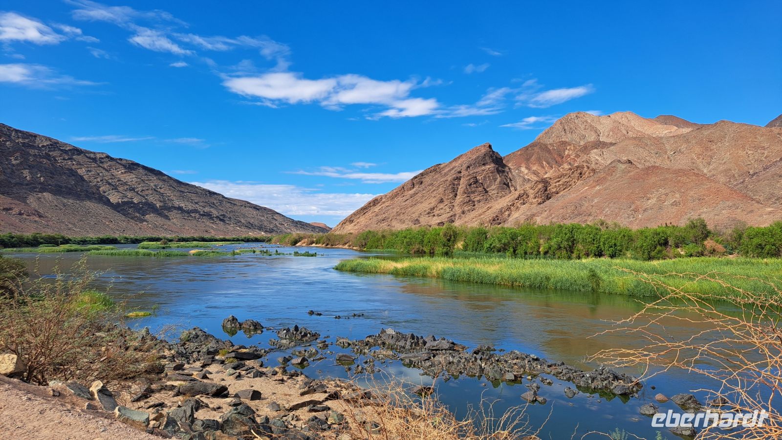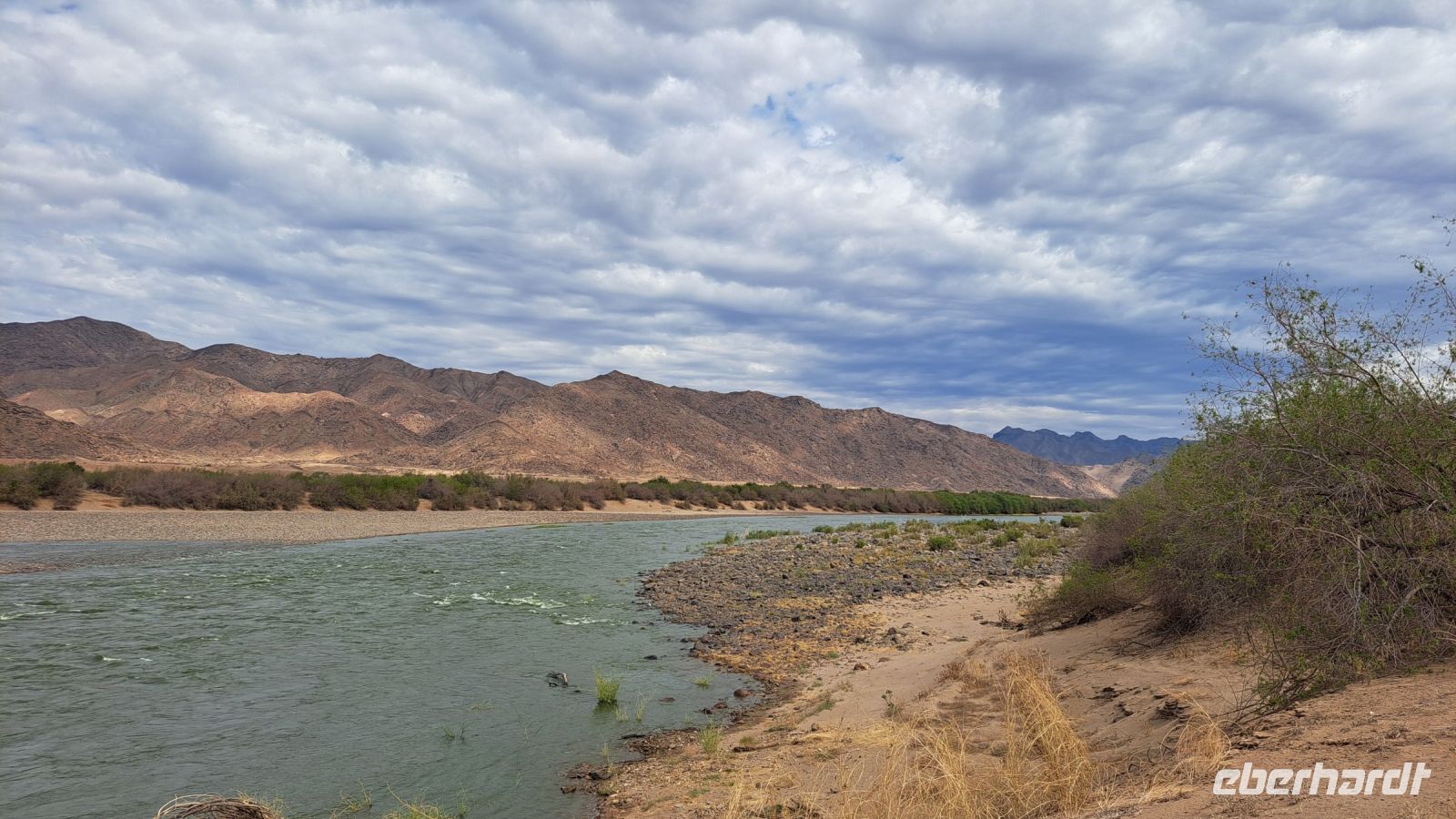 Nach dem Frühstück brechen wir auf und folgen dem Fish River nach Süden, wo er schließlich in den mächtigen Oranje-Fluss mündet – die natürliche Grenze zwischen Namibia und Südafrika. Die Landschaft wirkt rau und unberührt, mit beeindruckender Weite, die sich auf Bildern nur schwer einfangen läßt. Es ist faszinierend, wie sich die Landschaft hin zur Grenzregion verändert. Entlang des Oranje Flusses tauchen immer wieder kleine Diamantenminen auf – Zeugen einer Zeit, in der hier das große Glück gesucht wurde. Unser Guide erzählt uns von den Diamanten und dem Wandel der Region um Oranjemund und den streng bewachten Sperrgebieten, die bis heute existieren.