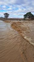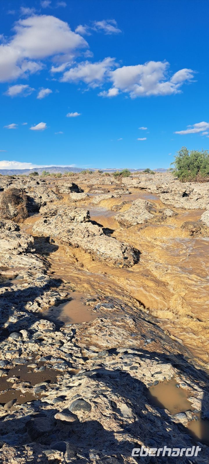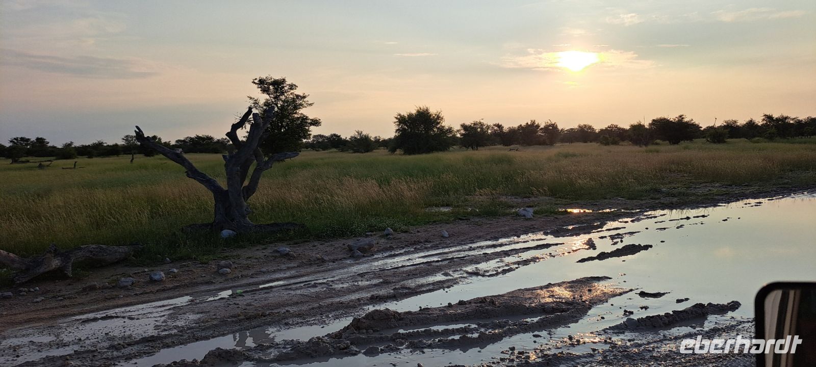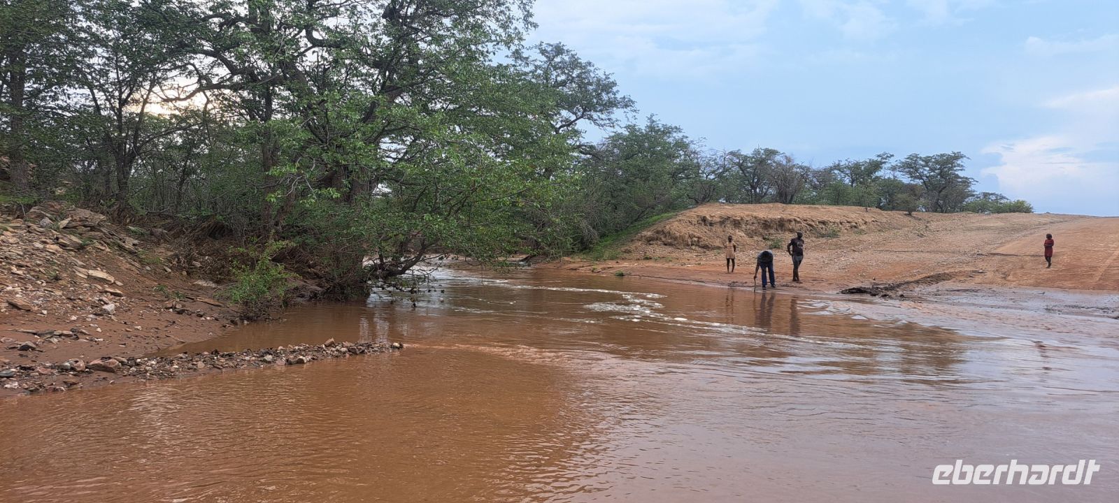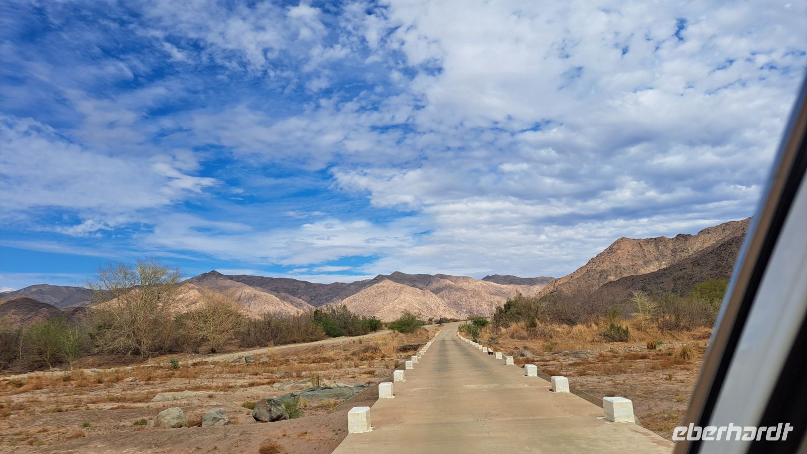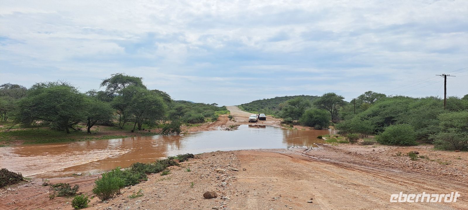 Dann wird es spannend – ein plötzlicher Regenschauer sorgt für Spaß auf der Fahrt: Pfützen-Durchfahren wie große Kinder! Doch kurz darauf ein echtes Abenteuer: Ein Fluss versperrt uns die Weiterfahrt nach Khorixas. Also heißt es warten – doch die Natur regelt es selbst. Nach 20-30 Minuten ist das Wasser bereits so weit gesunken, dass wir sicher durchfahren können.