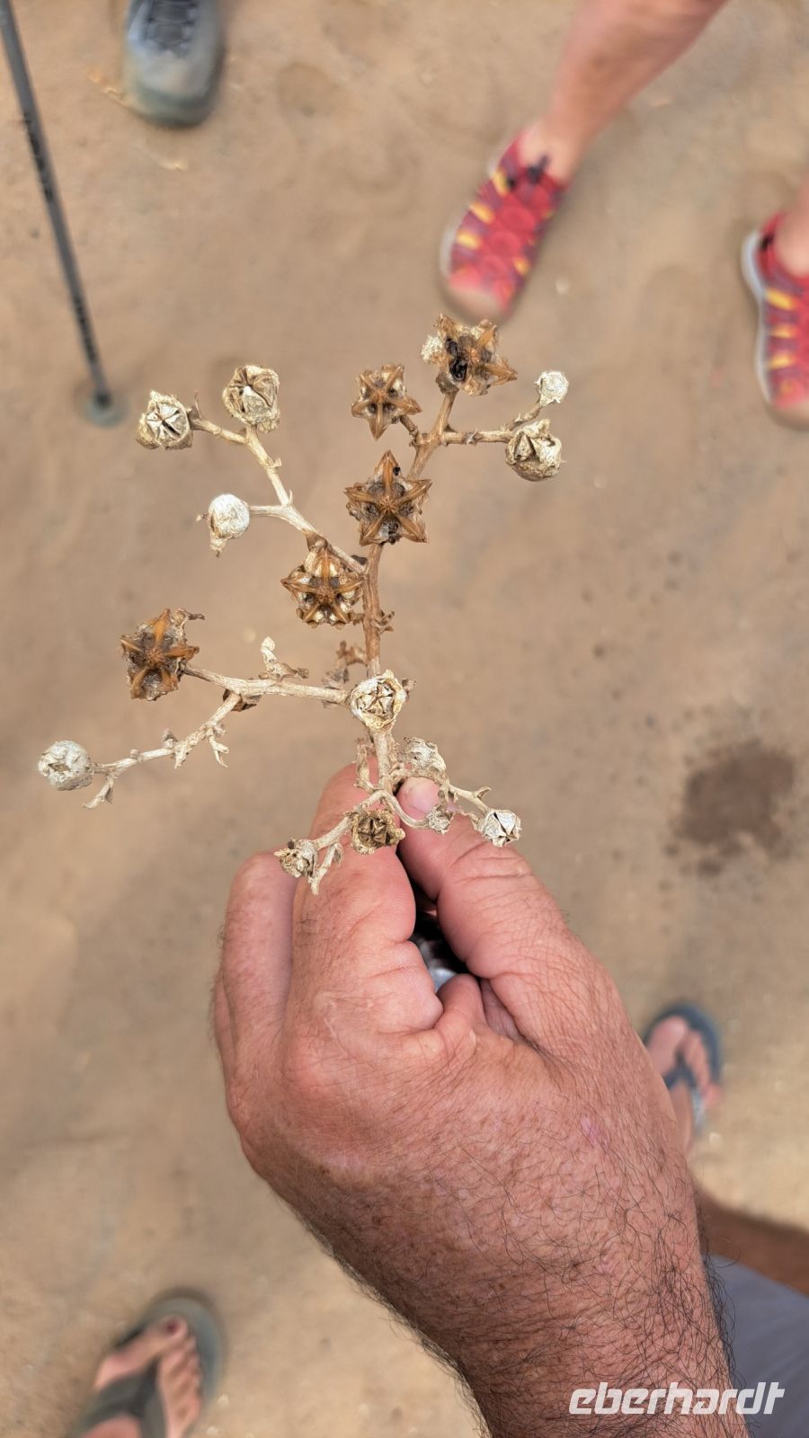 Am Flussufer sehen wir Reiher und Pelikane und die kleinen Klippschliefer, die erschreckt davon huschen als wir anhalten, ab und zu auch ein paar Paviane. Ein besonderes Highlight ist die unscheinbare Eispflanze: Sie sammelt in ihren dicken grünen Blättern Feuchtigkeit aus dem Nebel und dient so als Wasserquelle für Tiere in der Wüste. Jaco wringt das Blatt aus und wir können von dem salzigen Wasser kosten. Sollte es regnen, öffnen sich blitzschnell ihre trockenen Samen, was uns Jaco mit ein paar Tropfen aus seiner Trinkflasche demonstriert – eine geniale Überlebensstrategie in dieser trockenen Region.