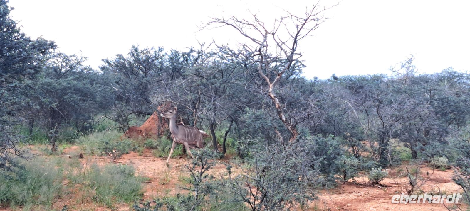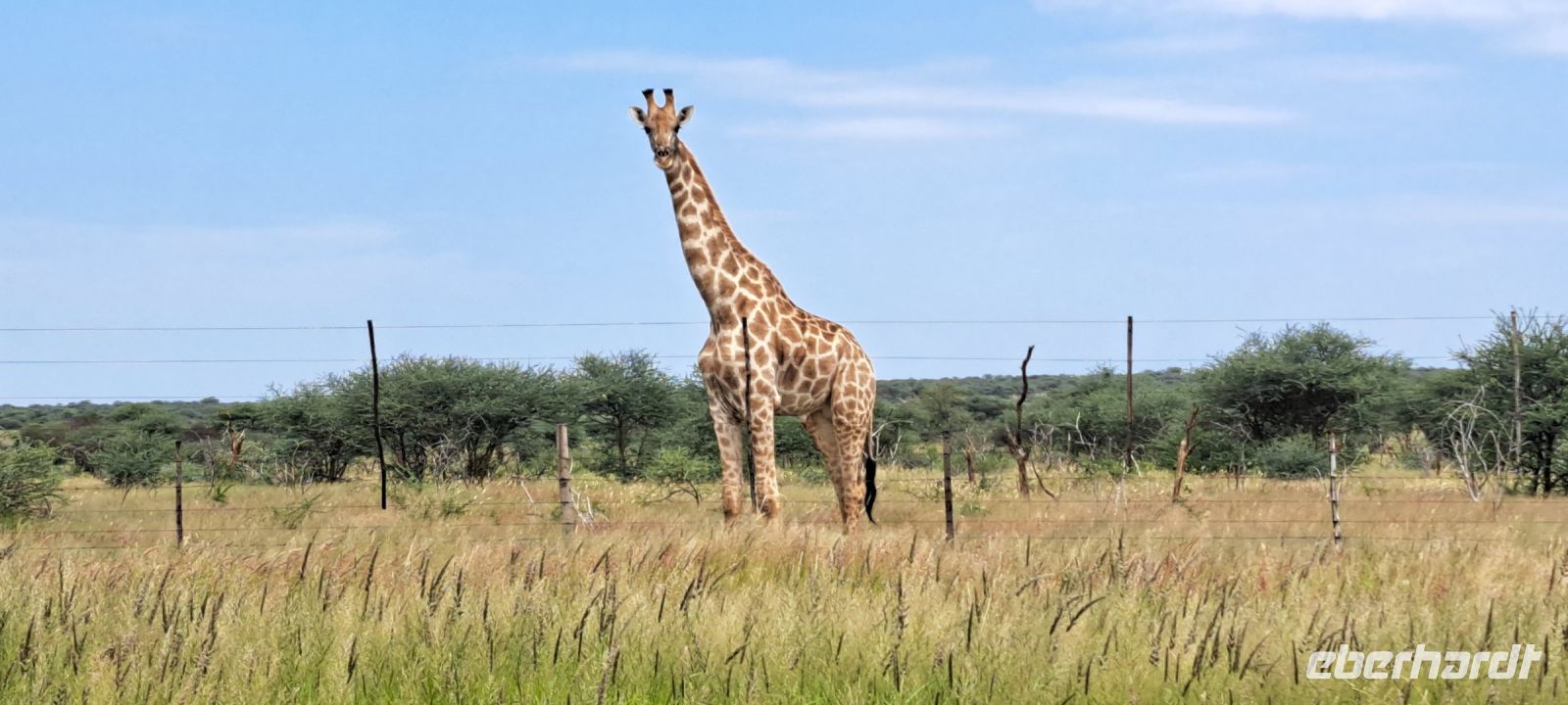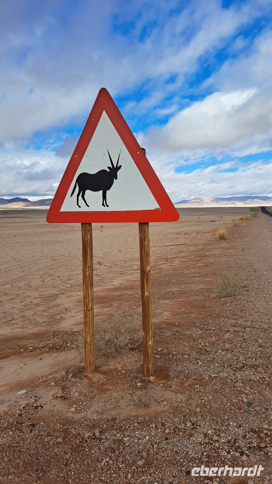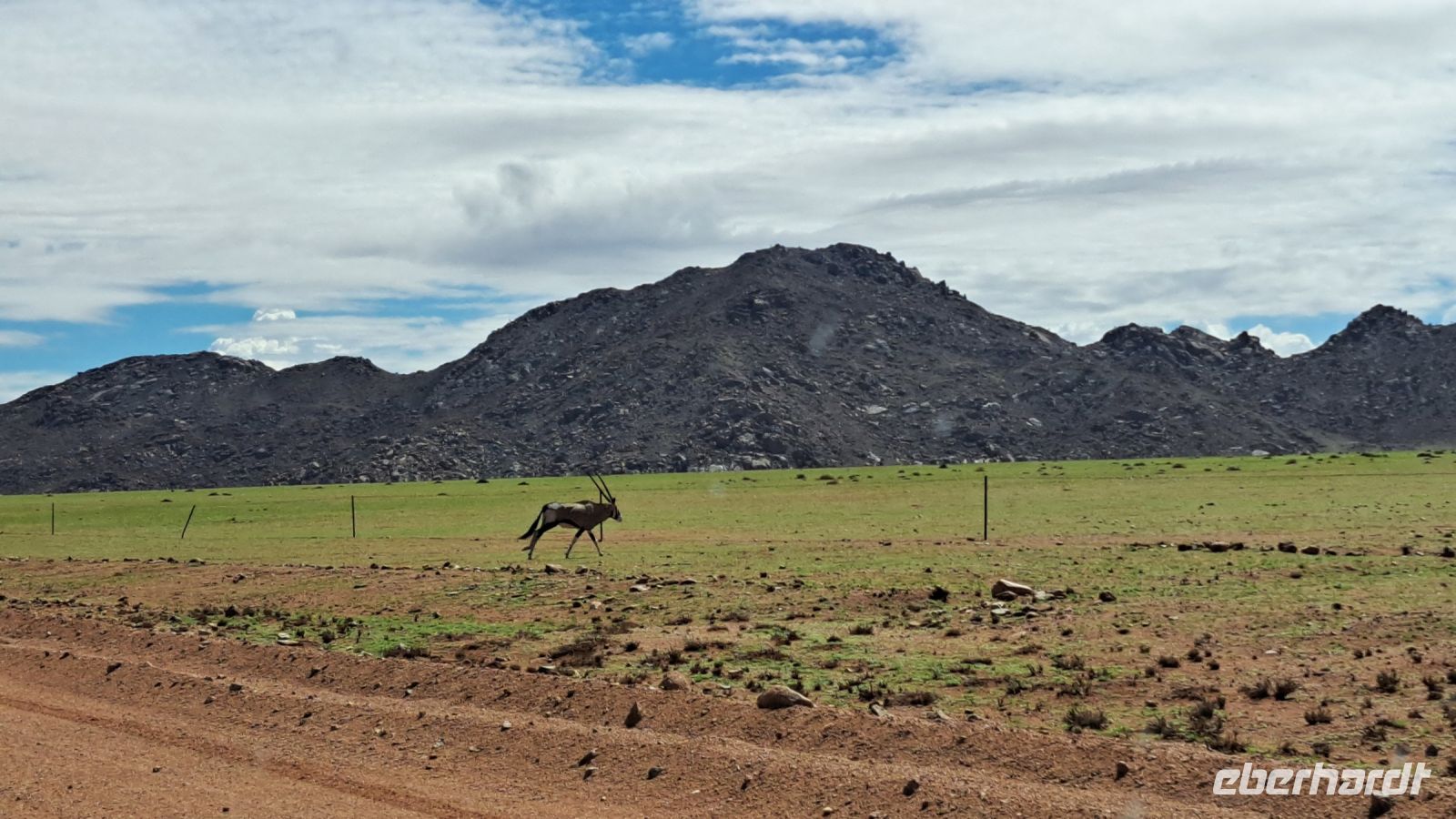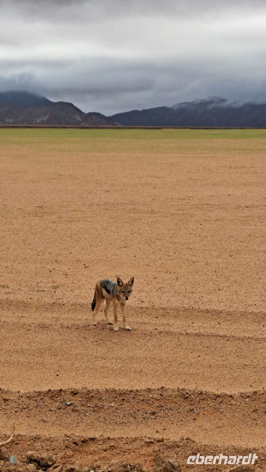 Die Tierwelt scheint den Regen ebenso zu genießen wie wir. Ein Wüstenfalke sitzt auf dem Zaun am Straßenrand, auf der Suche nach Beute, während drei Löffelhunde mit ihren riesigen Ohren durch die offene Ebene rennen, und ein neugieriger Schabrakenschakal beobachtet uns aus sicherer Entfernung. Überall in der Landschaft stehen Oryx-Antilopen und Strauße, während wir mit etwas Glück 2 Mal sogar eine Rüppeltrappe entdecken – eine Vogelart, die fast endemisch in Namibia vorkommt.