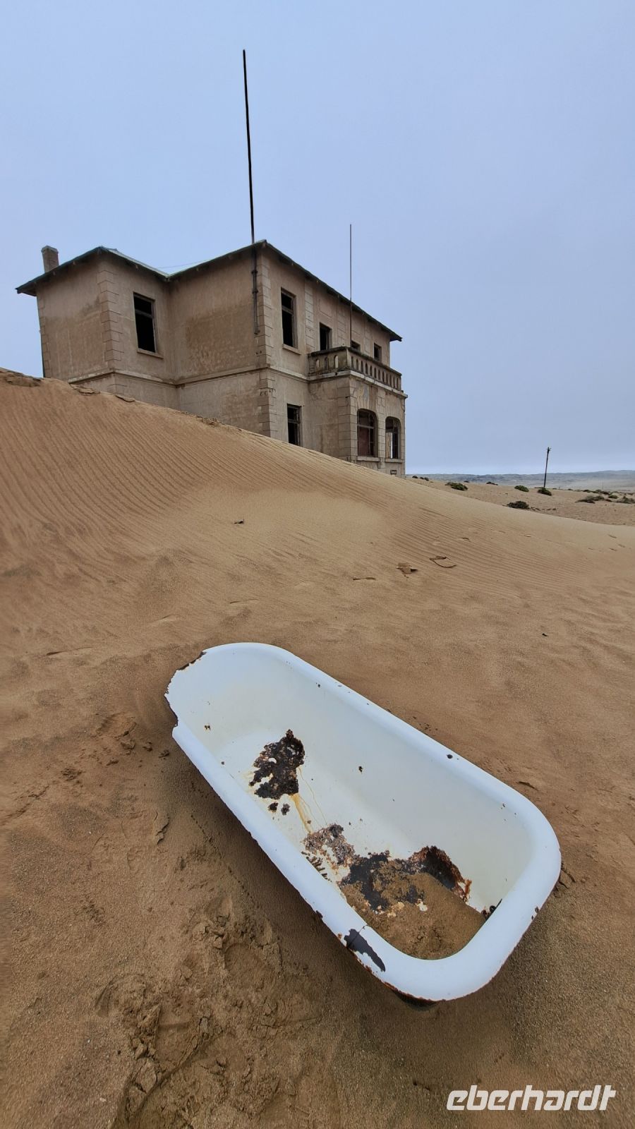 In Kolmannskuppe treffen wir Nicole, unsere deutschsprachige Führerin, die uns mit spannenden Geschichten durch die verlassene Diamantenstadt führt. Der graue Himmel verleiht der Szenerie eine ganz eigene Stimmung, fast melancholisch, aber faszinierend. Nach der Führung nutzen wir die Gelegenheit für Fotos – der Kontrast zwischen den sandgefüllten Ruinen und dem düsteren Himmel ist einmalig.