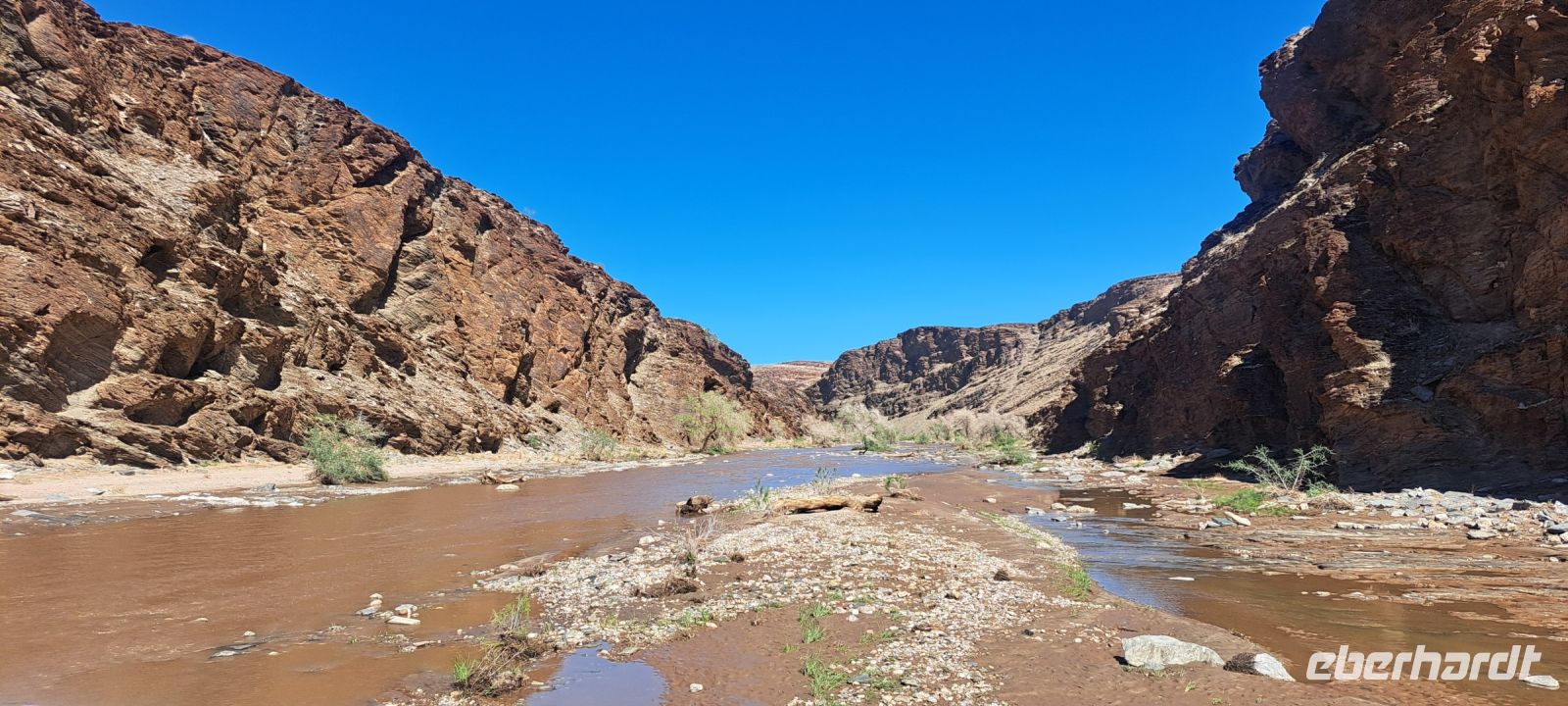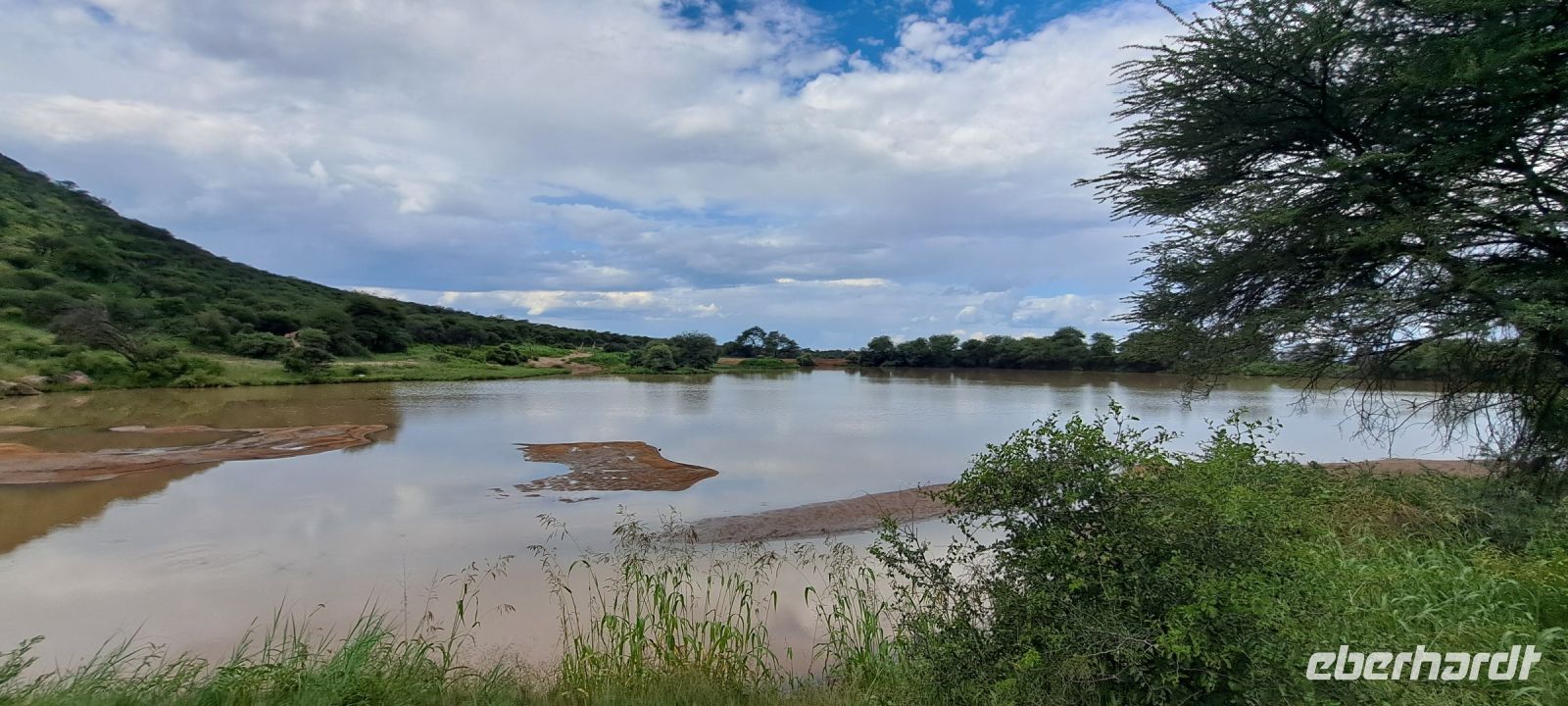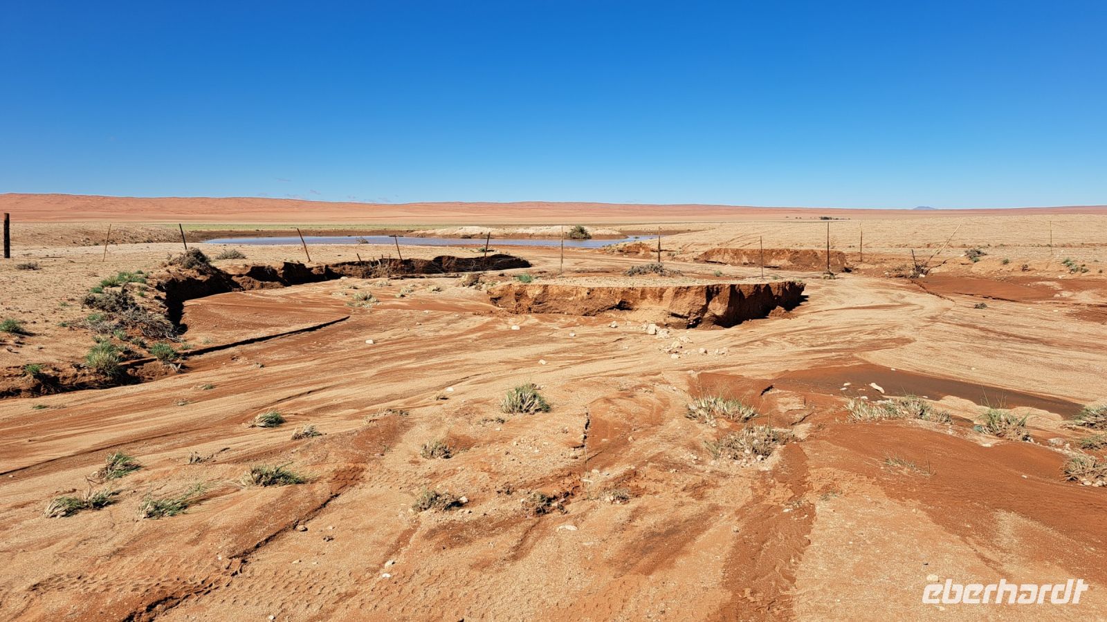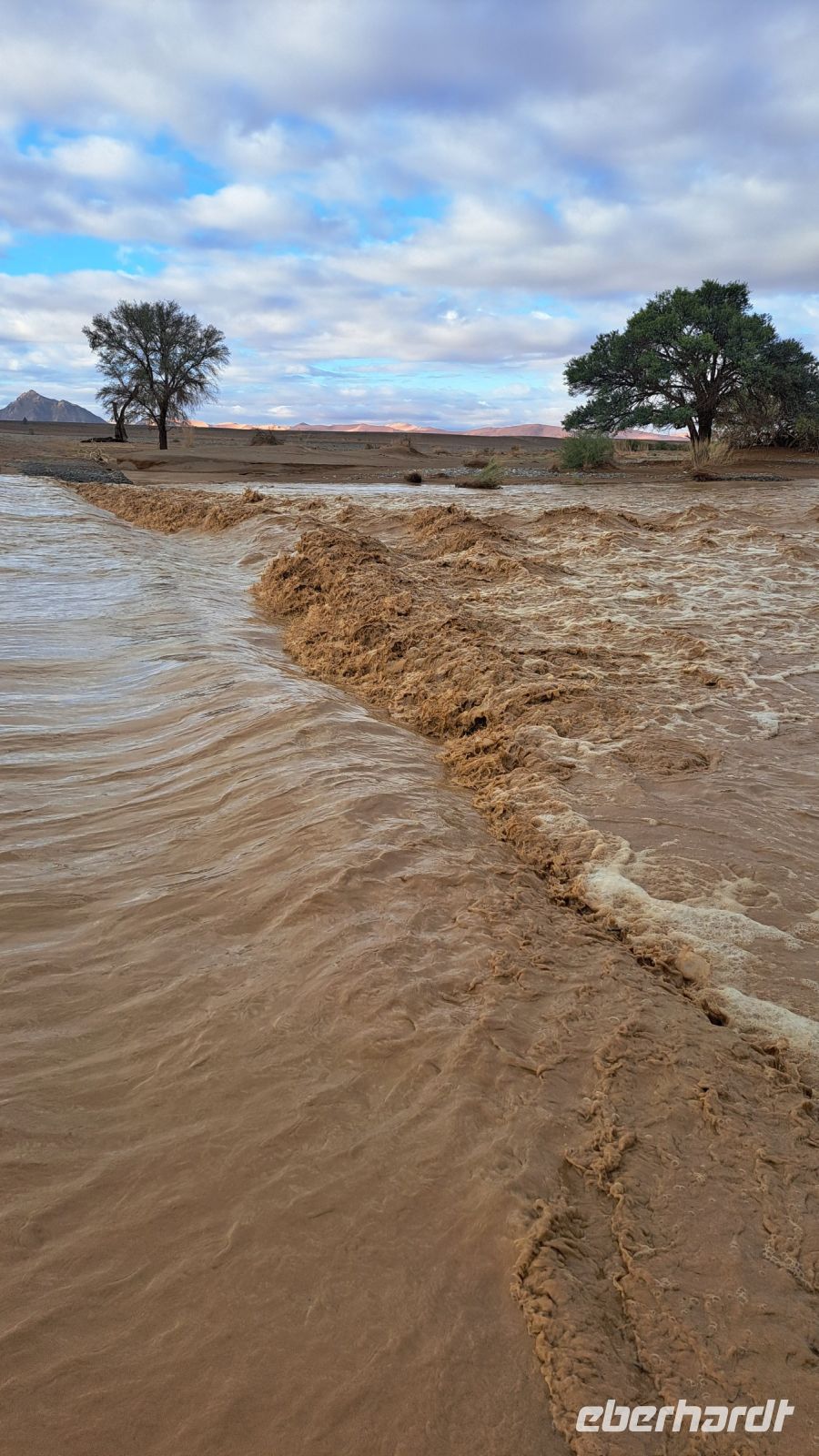 Normalerweise ein ausgetrocknetes Flussbett, strömt jetzt eine gewaltige Wassermenge durch die Wüste. Eine Überquerung ist unmöglich. Also ändern wir spontan den Plan und erklimmen stattdessen die nahegelegene Elim-Düne. Von oben haben wir einen spektakulären Blick auf das Unfassbare: grüne Wiesen in der Wüste, durchzogen von Wasserläufen. Namibia zeigt sich heute wieder von einer Seite, die nur wenige je zu Gesicht bekommen.