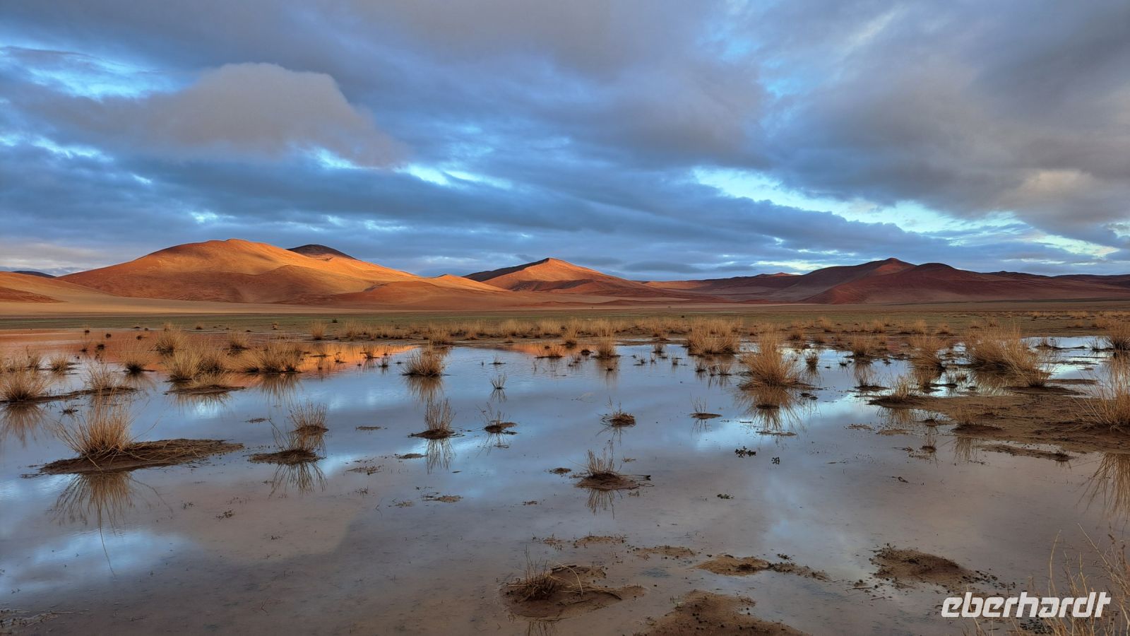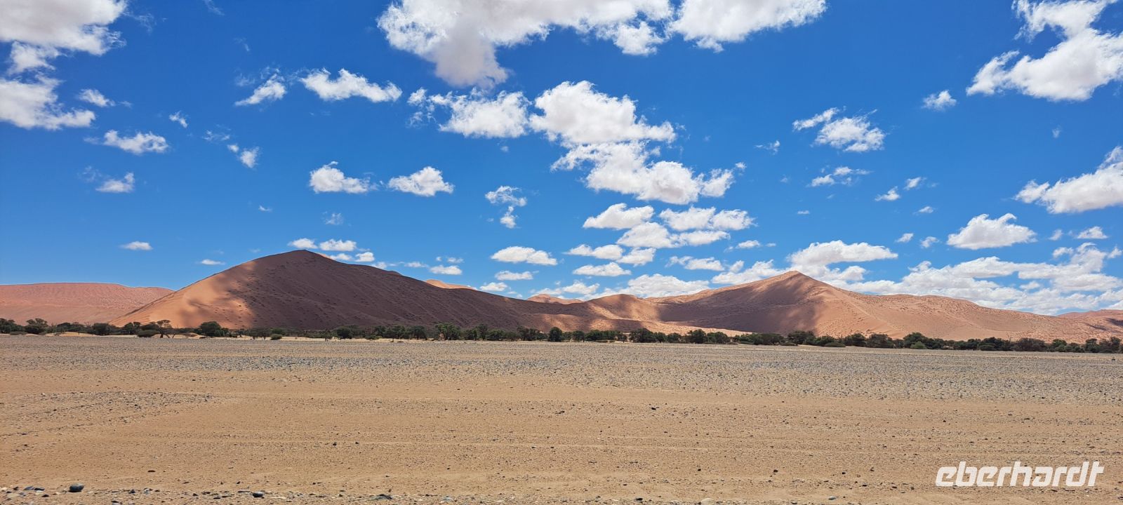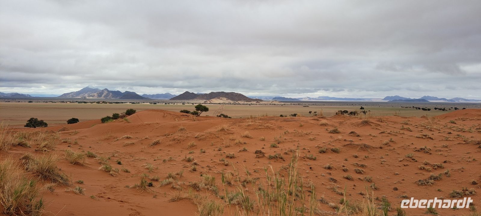 Heute heißt es früh aufstehen, denn wir wollen die berühmten roten Dünen von Sossusvlei erleben. Zum Glück liegt unsere Lodge direkt am Eingang des Namib-Naukluft-Nationalparks, sodass wir ohne Wartezeit ins Dünenmeer starten können. Die tiefen Wolken tauchen die Landschaft in ein ungewöhnliches Licht – doch dann erwartet uns eine Überraschung: Der Tsauchab-Fluss führt (Hoch-)wasser!