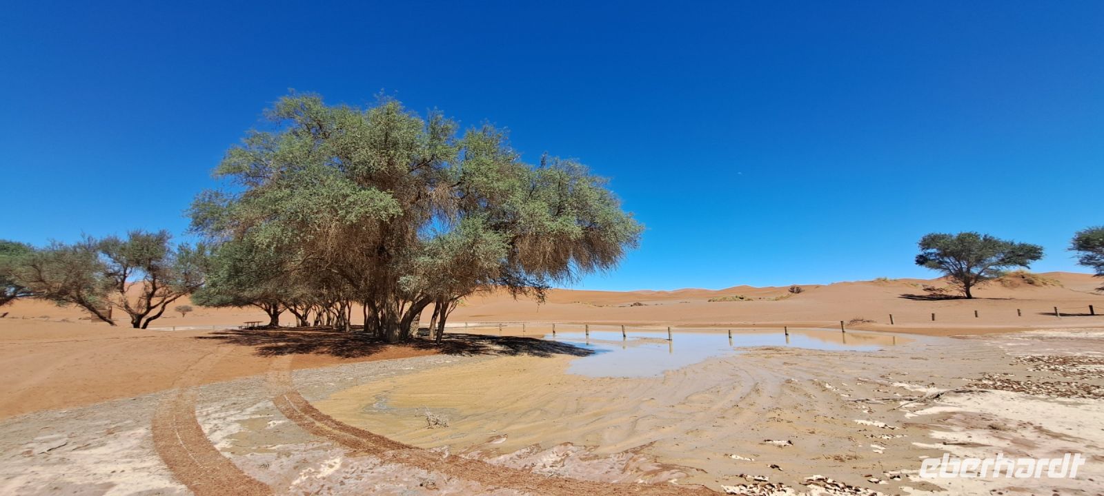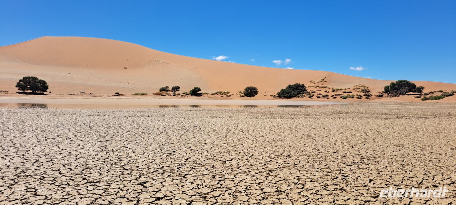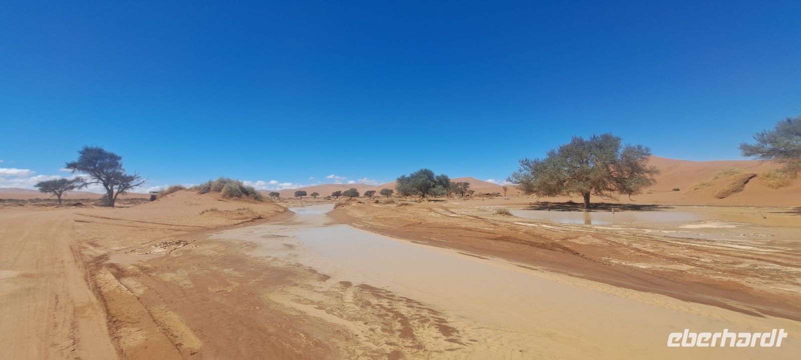 Als wir zurück zum Tsauchab kommen, hat das Wasser bereits etwas nachgelassen, und wir wagen uns weiter hinein in die Dünenlandschaft. Überall stehen Wasserflächen inmitten der Wüste – ein absolut surrealer Anblick. Auch in Sossusvlei selbst steht noch das Wasser! Statt der gewohnten rissigen Lehmböden gehen wir vorsichtig auf dem weichen, feuchten Schlamm.