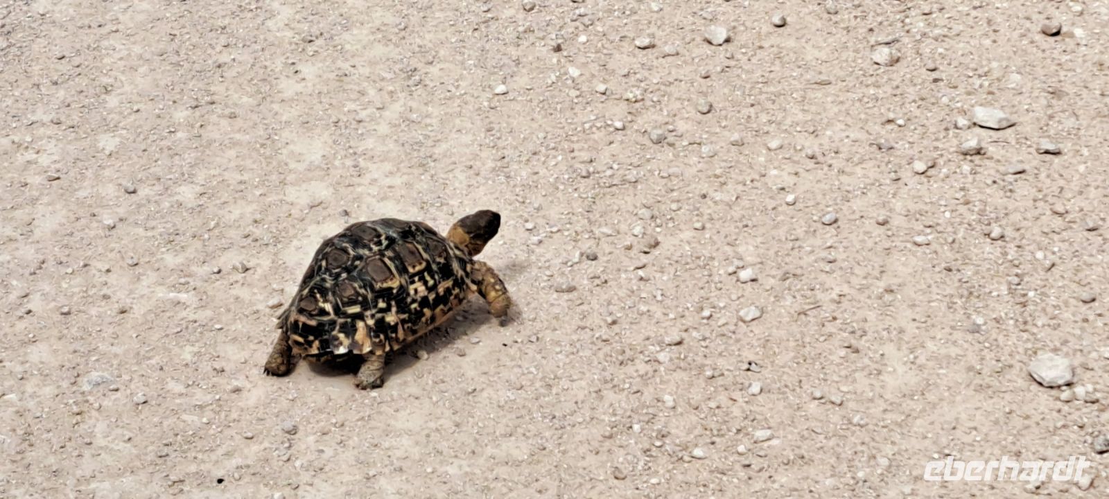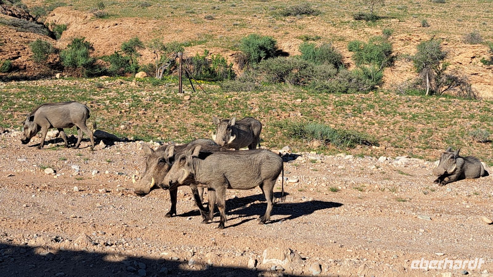 Unterwegs begegnen wir einer Warzenschwein-Mama mit vier Jungen, die erstaunlich zutraulich sind und uns neugierig beäugen. In der Ferne entdecken wir erneut eine Rüppelltrappe, die wegen ihres eigenartigen Rufs auch den Spitznamen Wüstenfrosch trägt. Neben zahlreichen Oryxantilopen sichten wir heute auch Kuhantilopen, die mit ihrem kräftigen Körperbau und der markanten Gesichtszeichnung beeindrucken.