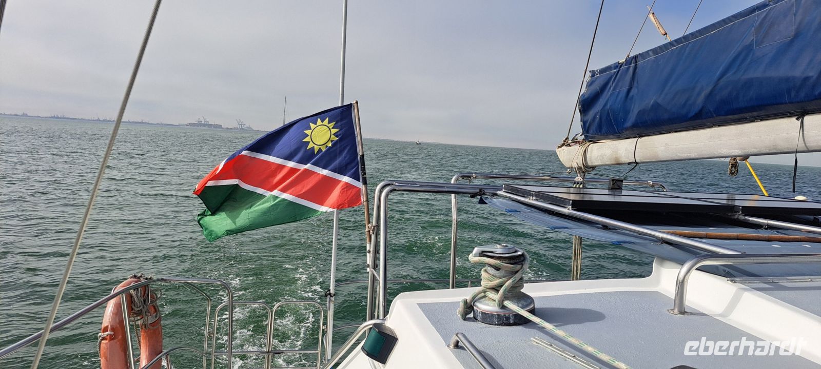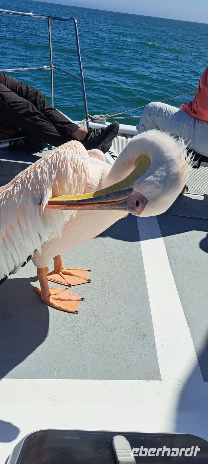 Heute starten wir den Tag mit einem besonderen Programmpunkt: einer Katamarantour in der Lagune von Walvis Bay. Noch etwas frisch in der Morgensonne, aber mit einer Tasse namibischem Kaffee in der Hand, genießen wir die ruhige Fahrt über das glitzernde Wasser. Kaum sind wir unterwegs, bekommen wir neugierigen Besuch – eine Robbe springt an Deck, während ein Pelikan mit beeindruckender Flügelspannweite neben uns landet. Die Tiere hier sind an Boote gewöhnt und genießen die Aufmerksamkeit und natürlich den Fisch, den sie hier bekommen.