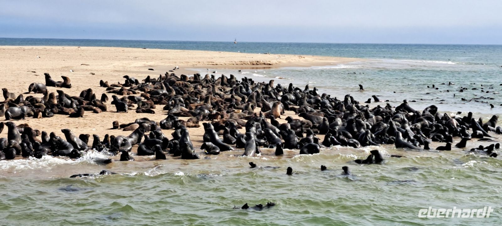 Unser Guide Billy an Bord des Katamarans versorgt uns währenddessen mit spannenden Informationen über das Leben im Meer, die Austernzucht in Namibia und die faszinierenden Ökosysteme der Lagune. Am Pelican Point angekommen, erstreckt sich vor uns eine riesige Robbenkolonie. Hunderte von Tieren tummeln sich am Strand, plantschen im Wasser oder faulenzen in der Sonne – ein beeindruckendes Naturschauspiel.