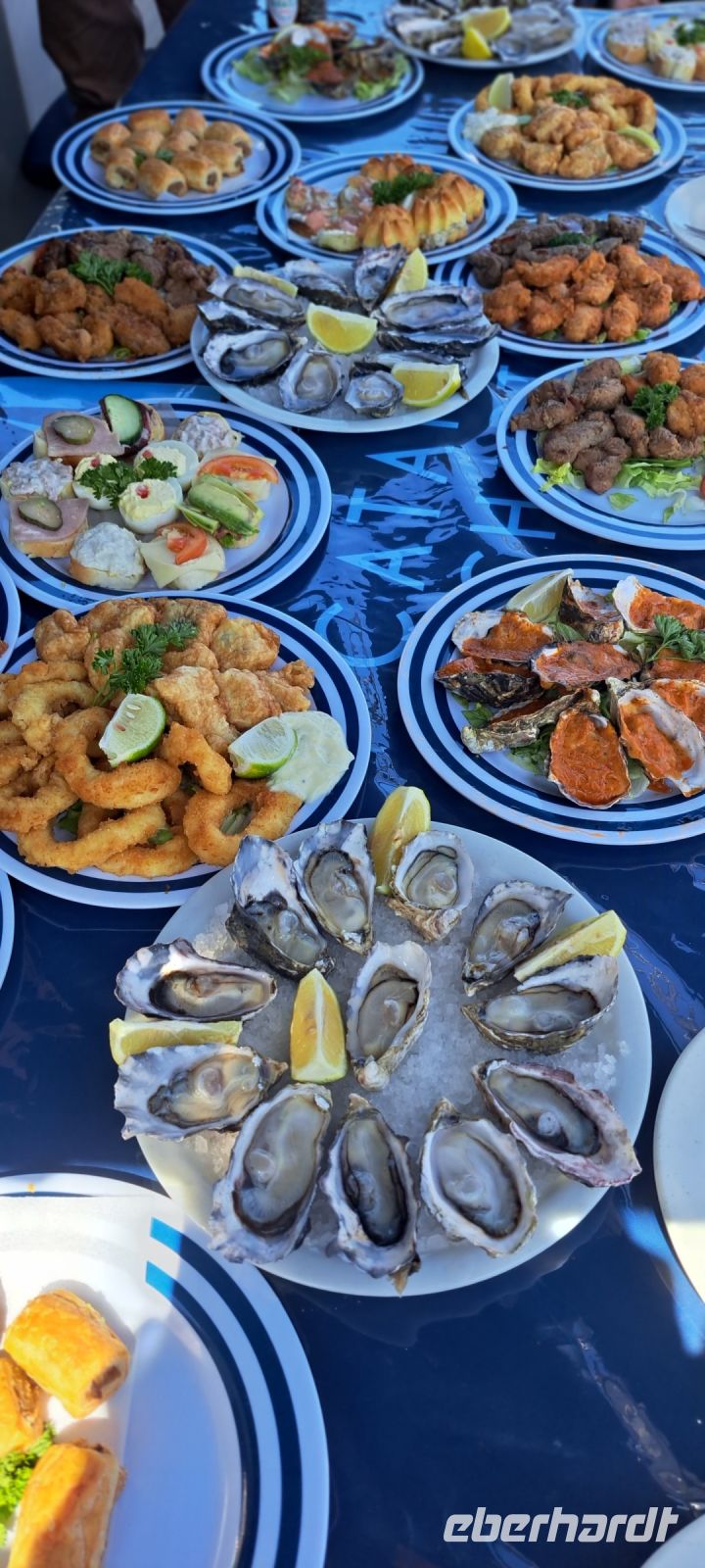 Dann wird es kulinarisch: Allerlei Fingerfood inklusive frischer namibischer Austern, begleitet von einem Glas Sekt, stehen auf dem Menü. Selbst die Skeptiker unter uns lassen sich überreden – jeder probiert mindestens eine Auster! Das Meeresaroma und die Frische sind unvergleichlich und überzeugen den ein oder anderen Ersttester.