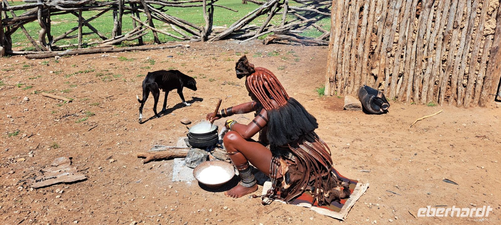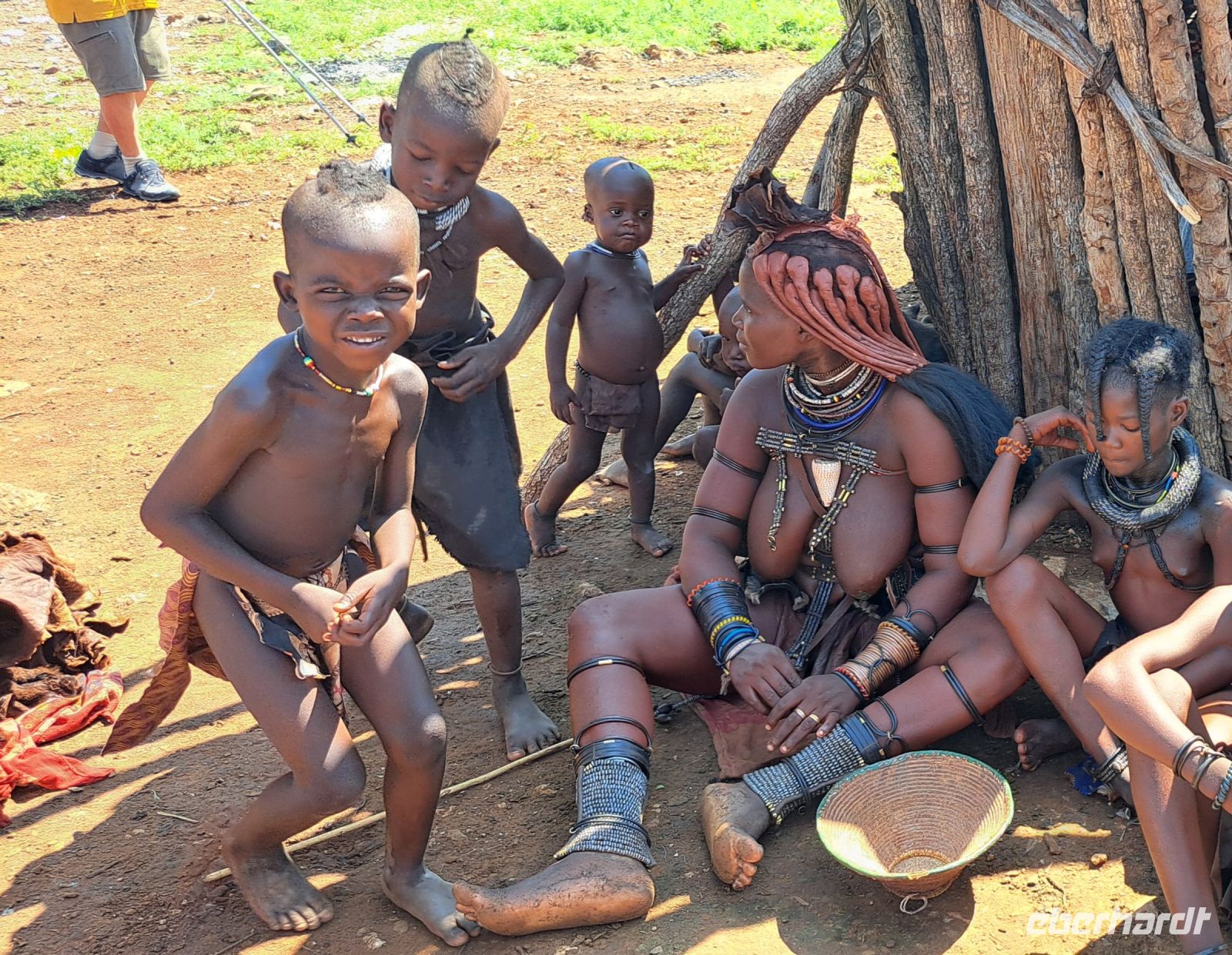 Mit einer Kiste voller Lebensmittel als Gastgeschenke werden wir herzlich empfangen. Besonders spannend: Wir treffen den Chief des Dorfes sowie die Großmutter unseres lokalen Himba-Guides John. Wir dürfen sie in ihrer Hütte besuchen und lernen mehr über die Rituale und Kultur der Himbas – vom täglichen Räucherritual anstelle eines Wasserbads bis hin zu den kunstvollen Frisuren der Frauen, dem Brautgewand und den Kalebassen für saure Milch.