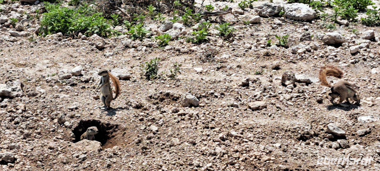 Entlang der Straße huschen immer wieder Erdhörnchen zwischen den Büschen hindurch, während Schakale flink die Piste überqueren.