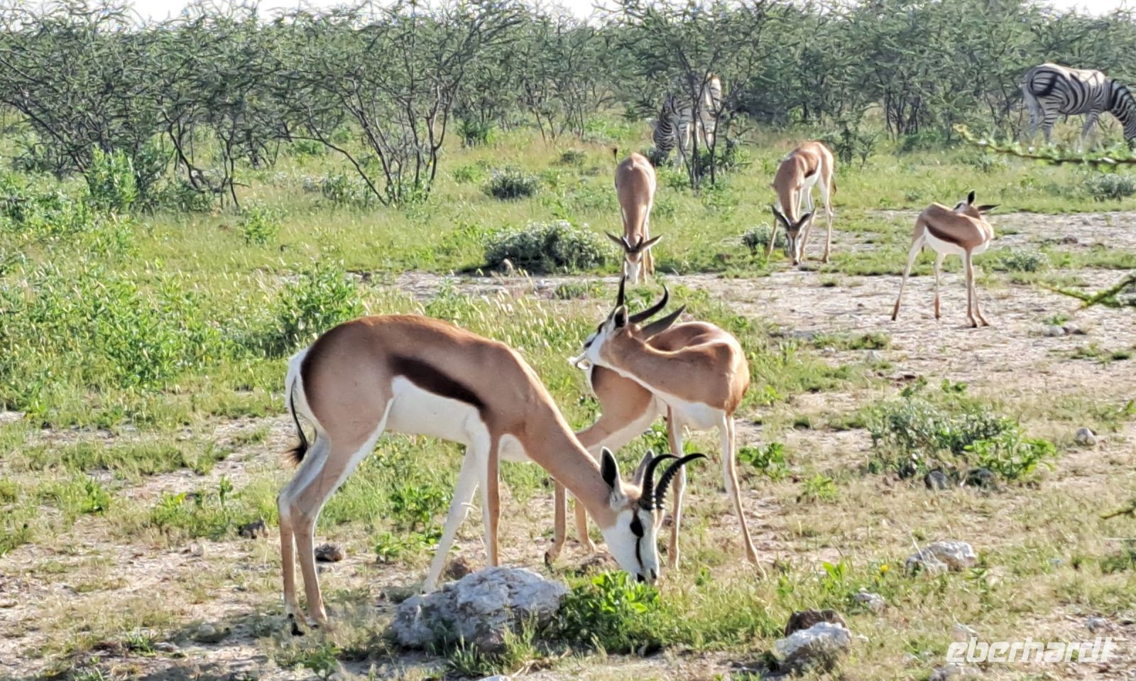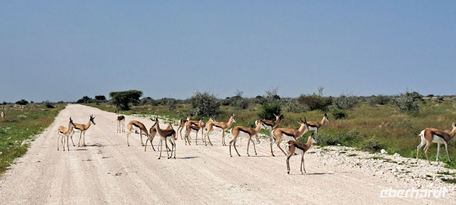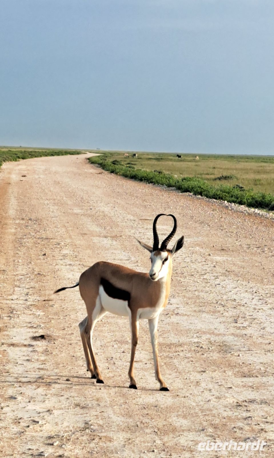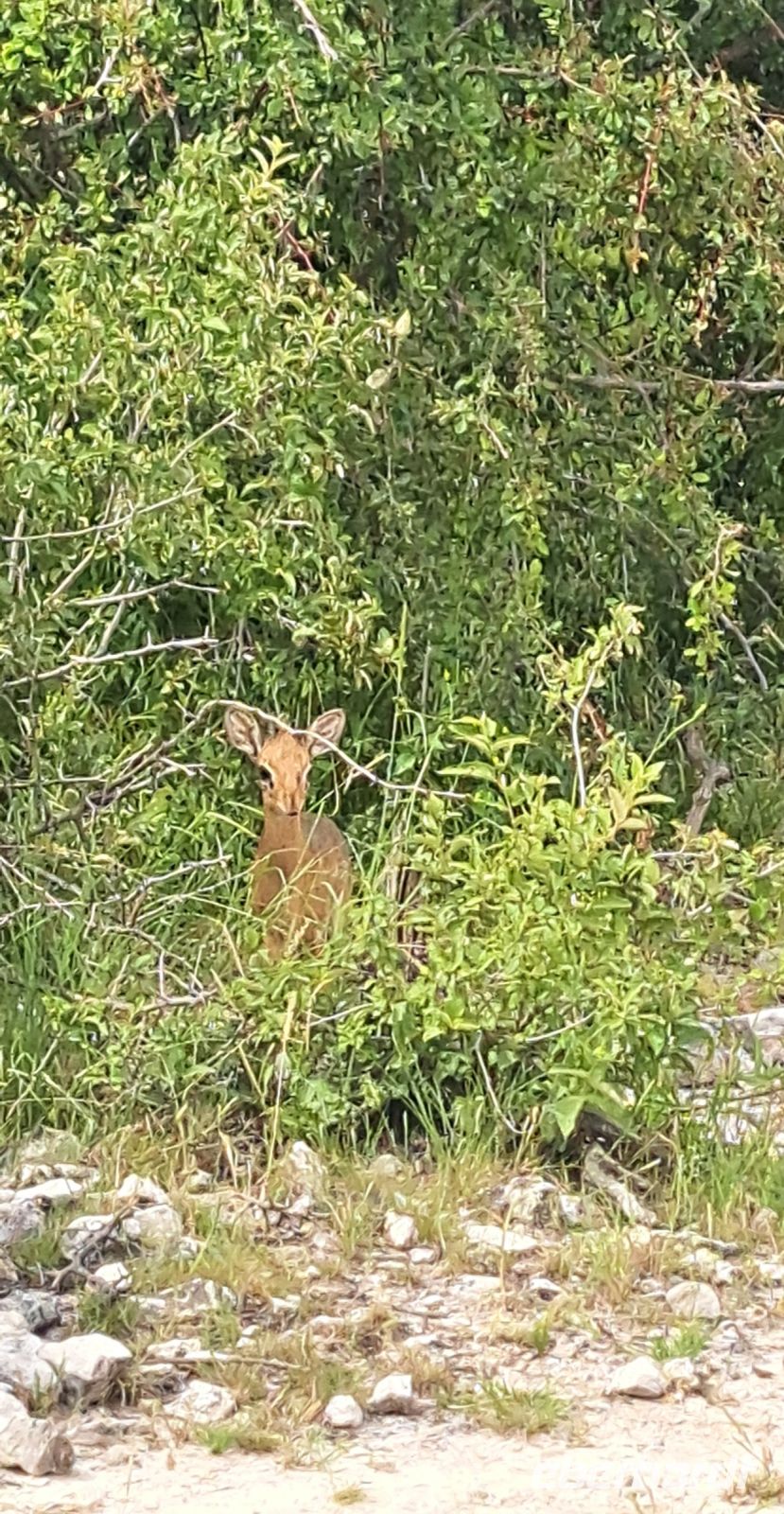Kurz bevor wir den Park nach 3 wunderschönen Tagen verlassen, treffen wir zu unserer Freude noch ein Damara Dikdik! Es steht plötzlich am Wegesrand – die kleinste und wohl scheueste Antilopenart Namibias.