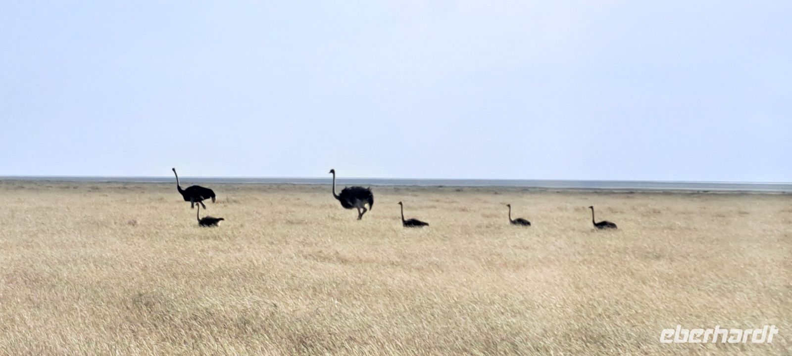 Als besonderes Highlight - eine Straußenfamilie mit ihren Jungen, die vorsichtig durch das hohe Gras schreitet.