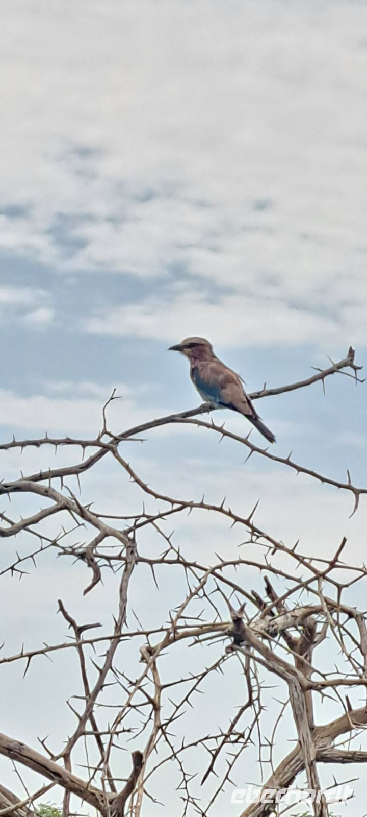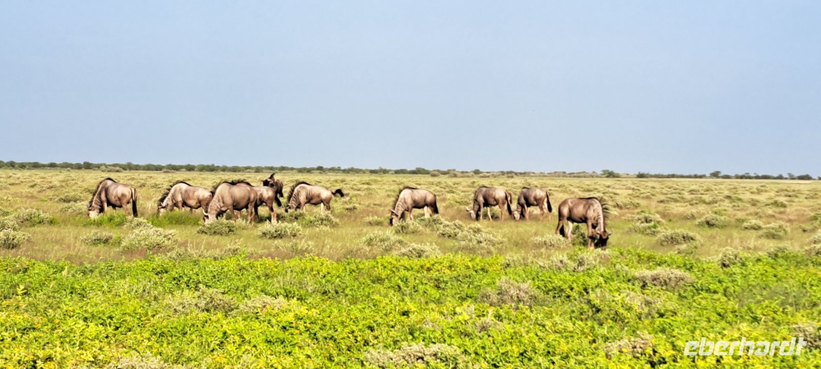 Unsere Route führt uns quer durch den Park von West nach Ost, vorbei an der gewaltigen Salzpfanne, die durch den Regen stellenweise mit Wasser gefüllt ist – ein äußerst seltener Anblick in Etosha. Wir halten Ausschau nach Geparden, doch die Meister der Tarnung bleiben heute verborgen. Stattdessen begleiten uns unzählige Springböcke, Zebras, Kuhantilopen und Gnus, während neben uns eine farbenprächtige Gabelracke im Baum schillert. Auch ein Weißbürzelsinghabicht, der aufmerksam auf einem Ast Ausschau hält, steht Modell.