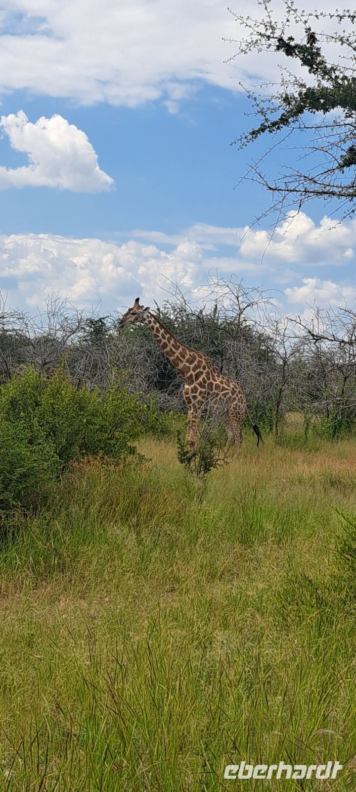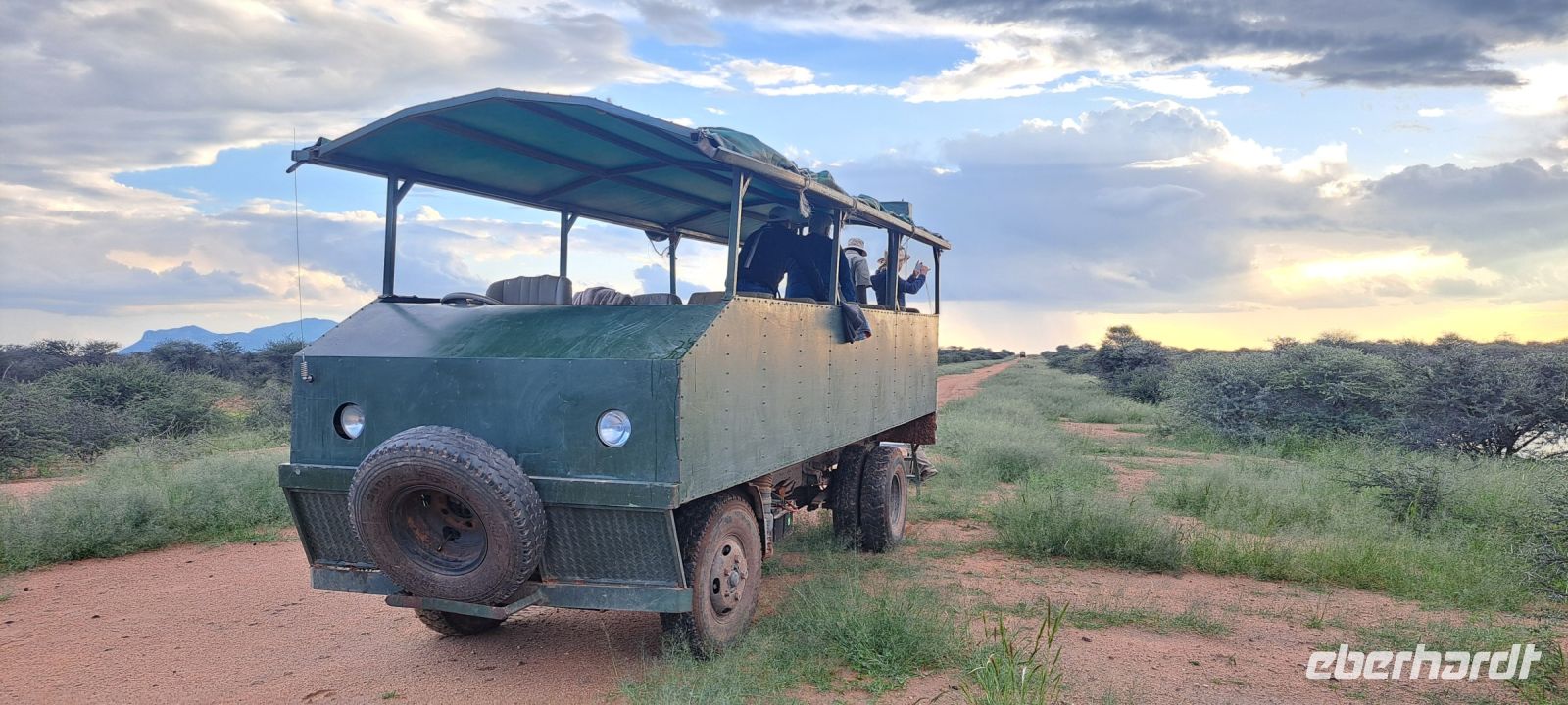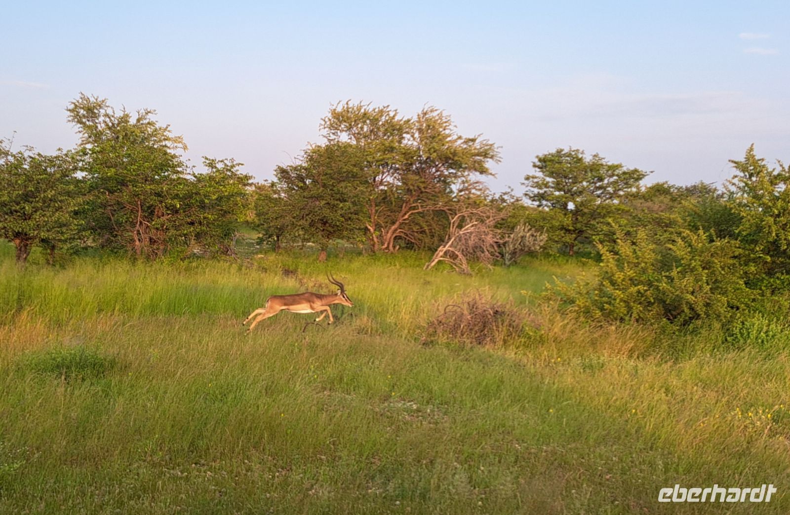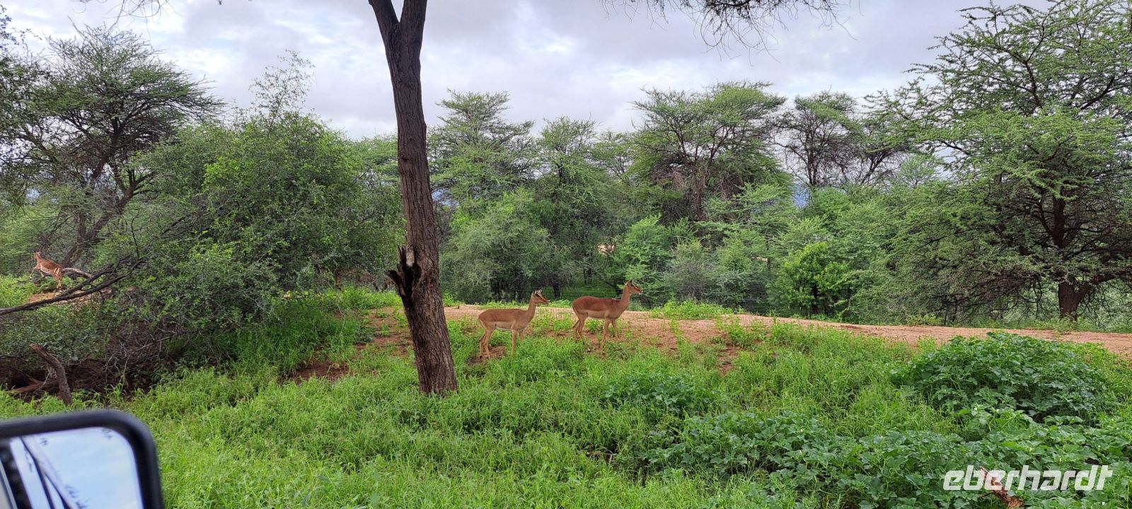 Nach der Rückkehr genießen wir eine Mittagspause, bevor es am Nachmittag auf Pirschfahrt geht – und zwar in einem coolen Gefährt mit dem Namen „Ochsenfrosch“. Die Landschaft ist nach den Regenfällen ungewohnt grün und wasserreich, was zahlreiche Tiere anlockt. Wir begegnen Wasserböcken, Giraffen, Impalas und sogar einem kleinen Steinböckchen, das flink durchs Gras huscht.
