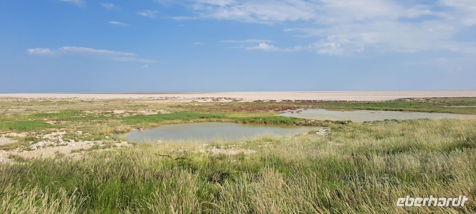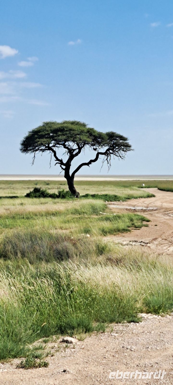 Mit der Öffnung des Parks brechen wir früh auf, fest entschlossen, Löwen zu entdecken. Wir fahren Richtung Westen, die Sonne taucht die Savanne in warmes Licht, und in der Ferne erspähen wir zum ersten Mal die endlose Salzpfanne – ein beeindruckender Anblick.