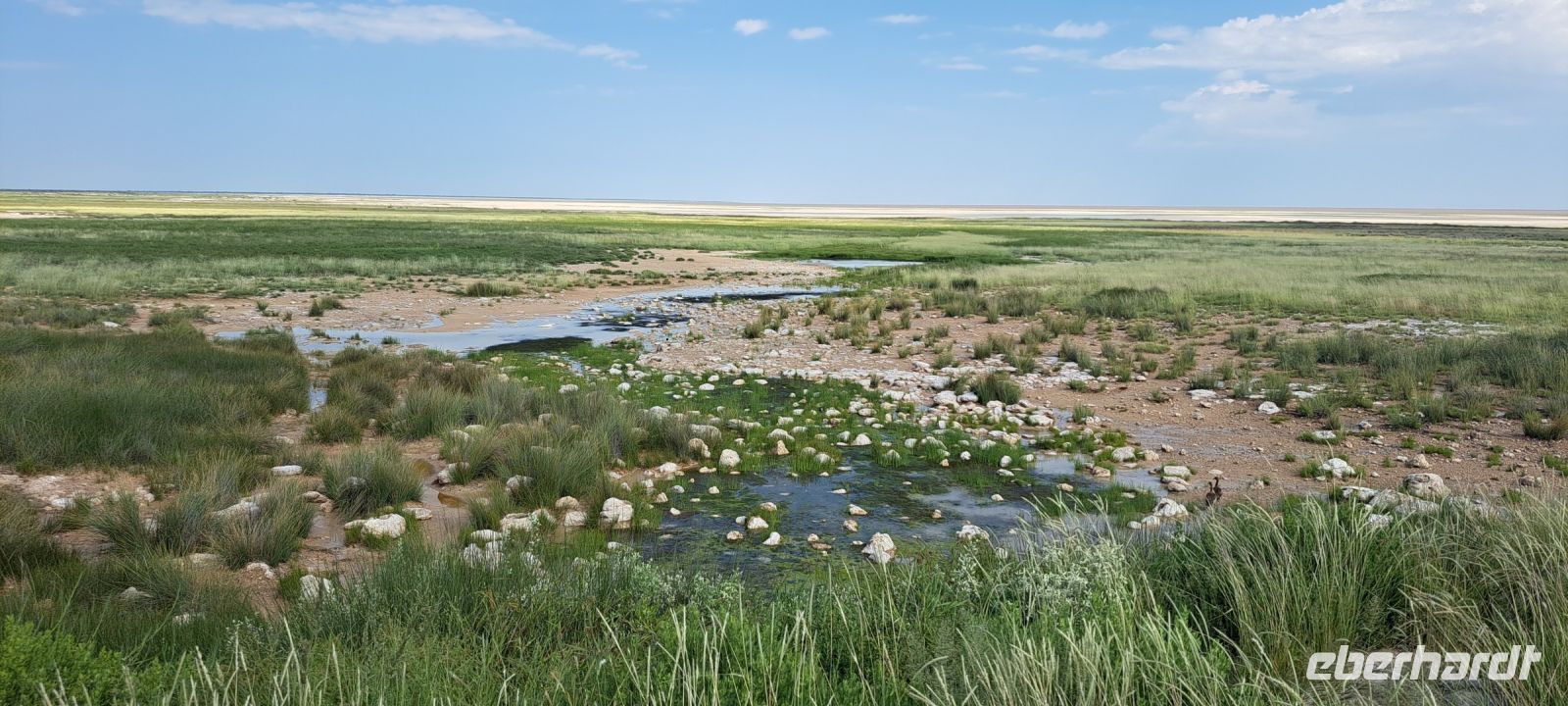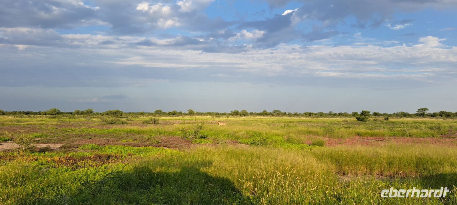 Wir fahren zur Gemsbokvlakte, weiter zum Olifantsbad – beides herrlich grüne Wasserstellen, die heute aber leer sind, weil die Tiere im Moment zum Glück nicht auf die Wasserlöcher angewiesen sind. Sie finden im ganzen Park verteilt Wasserstellen und Pfützen durch den vielen Regen der vergangenen Tage.