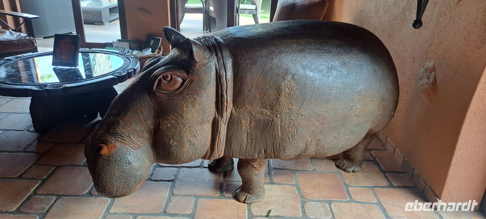 Der Nachmittag lädt zum Entspannen am Pool ein, mit Blick auf den angrenzenden See. Wir freuen uns über die dekorativen Flamingos, über einen Nimmersatt-Storch und einen Afrikanischen Löffler im Baum am Ufer während wir geduldig nach Flusspferden Ausschau halten.