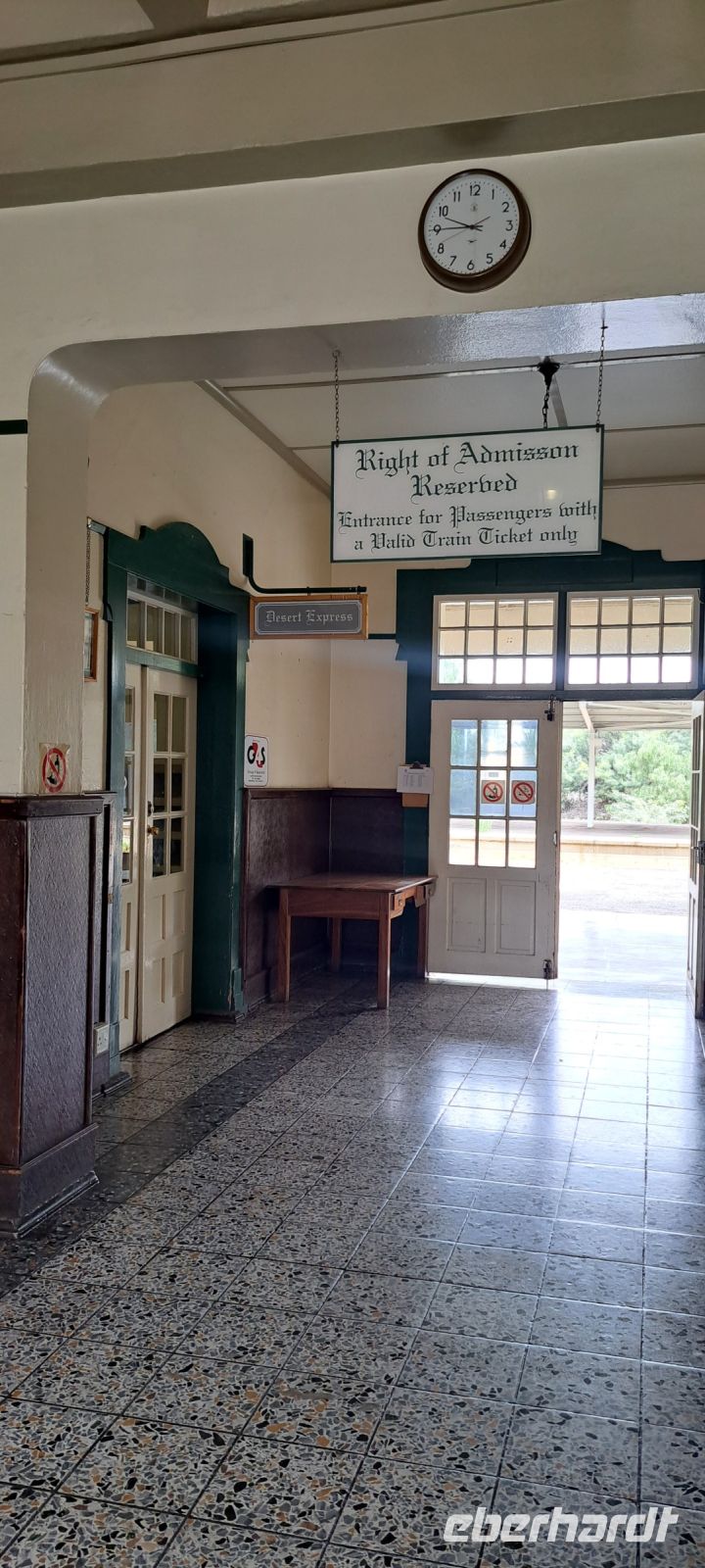 Entlang der Straße halten wir für schöne Fotomotive entlang der Bahnstrecke durch die Dünen, zur Belohnung kommt tatsächlich ein Zug die Schinen entlang, die ständig mühsam von Sand befreit werden müssen. Das hat sich seit der Kollonialzeit bis heute nicht geändert...