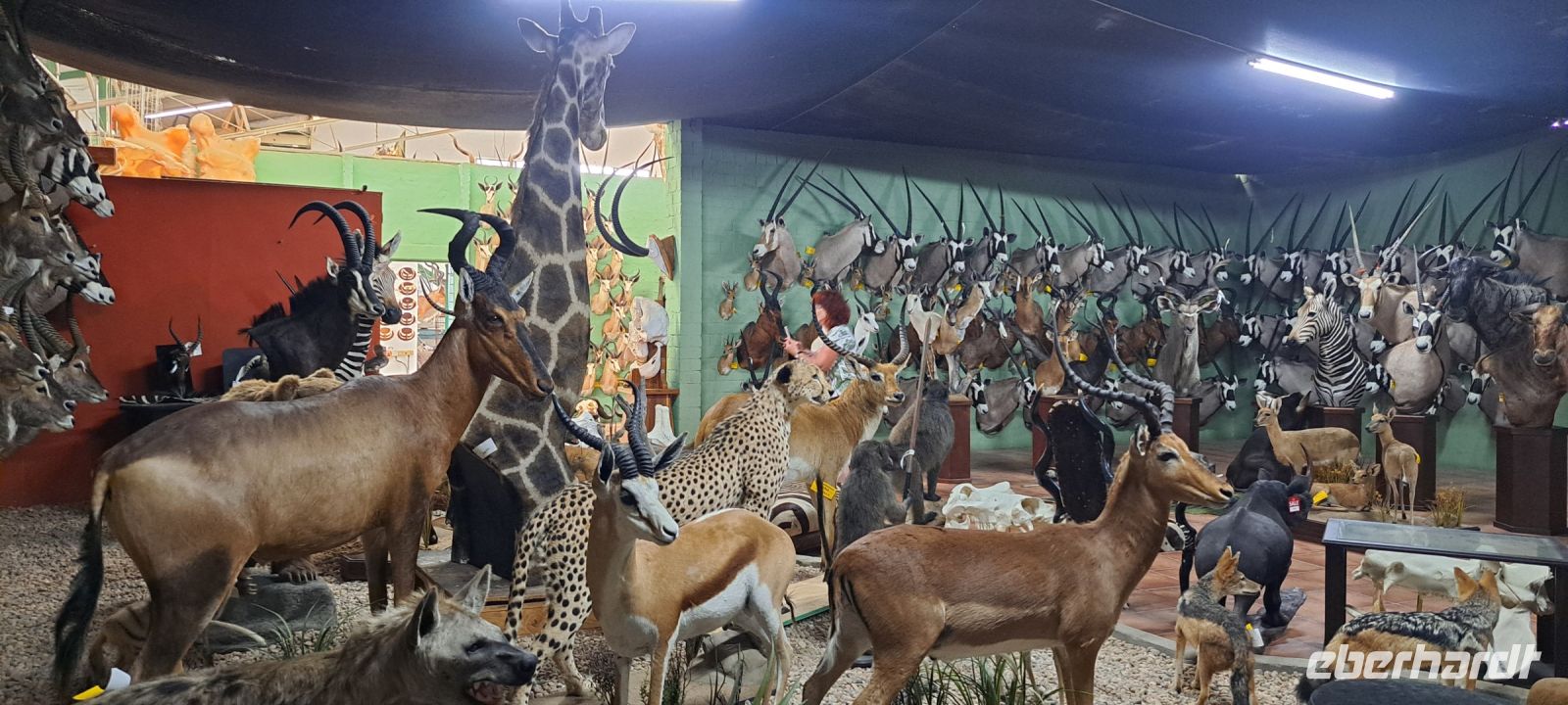 Nach dem Frühstück verlassen wir die Mount Etjo Lodge und machen uns auf den Weg zurück nach Windhoek. Unterwegs legen wir einen Stopp in Okahandja ein, wo wir auf dem Holzschnitzermarkt den Handwerkern bei der Arbeit zuzusehen können. Anschließend besuchen wir ein Taxidermie-Werk, in dem Trophäen für Jäger präpariert werden – ein spannender Einblick in ein Handwerk, das in Namibia eine lange Tradition hat.